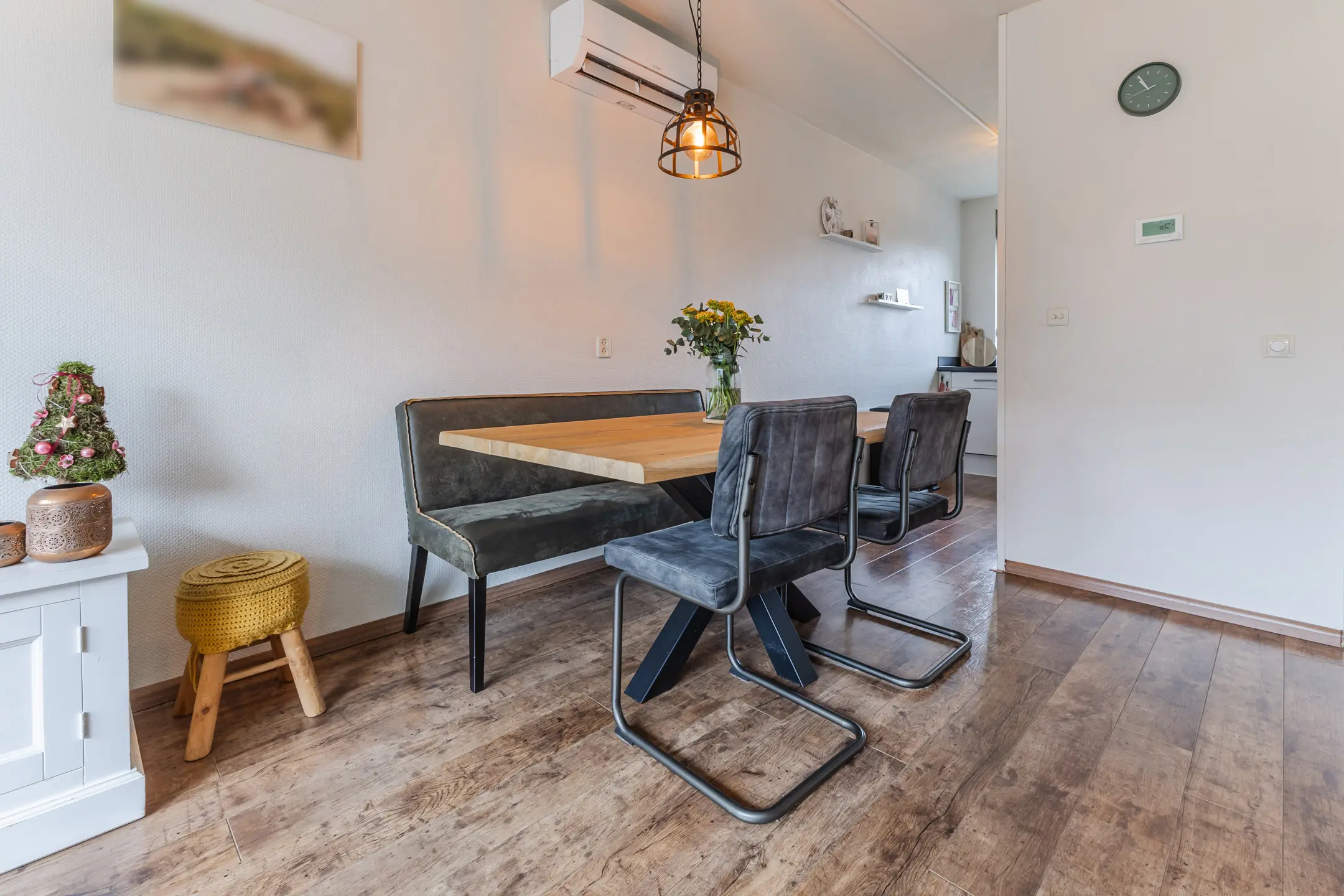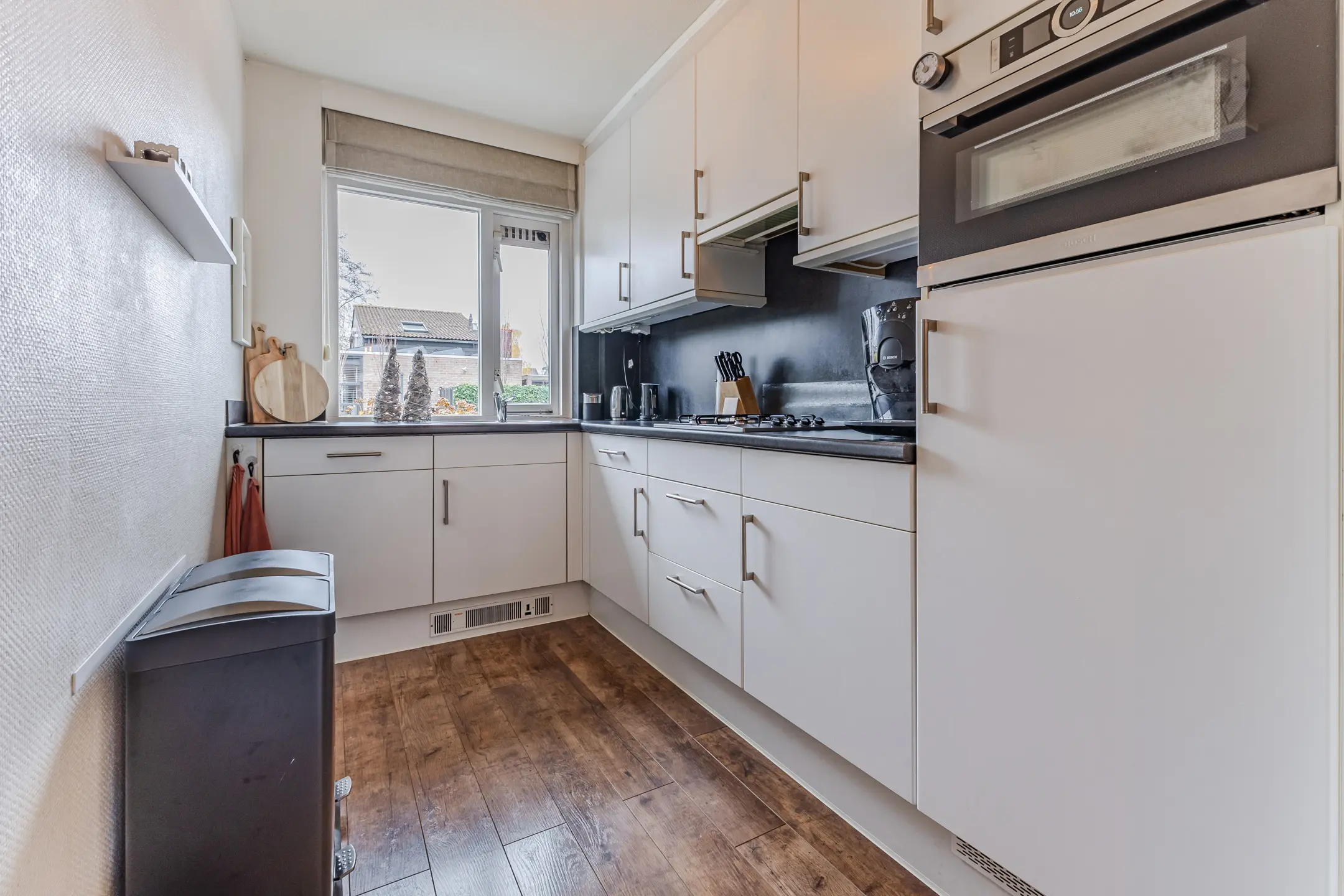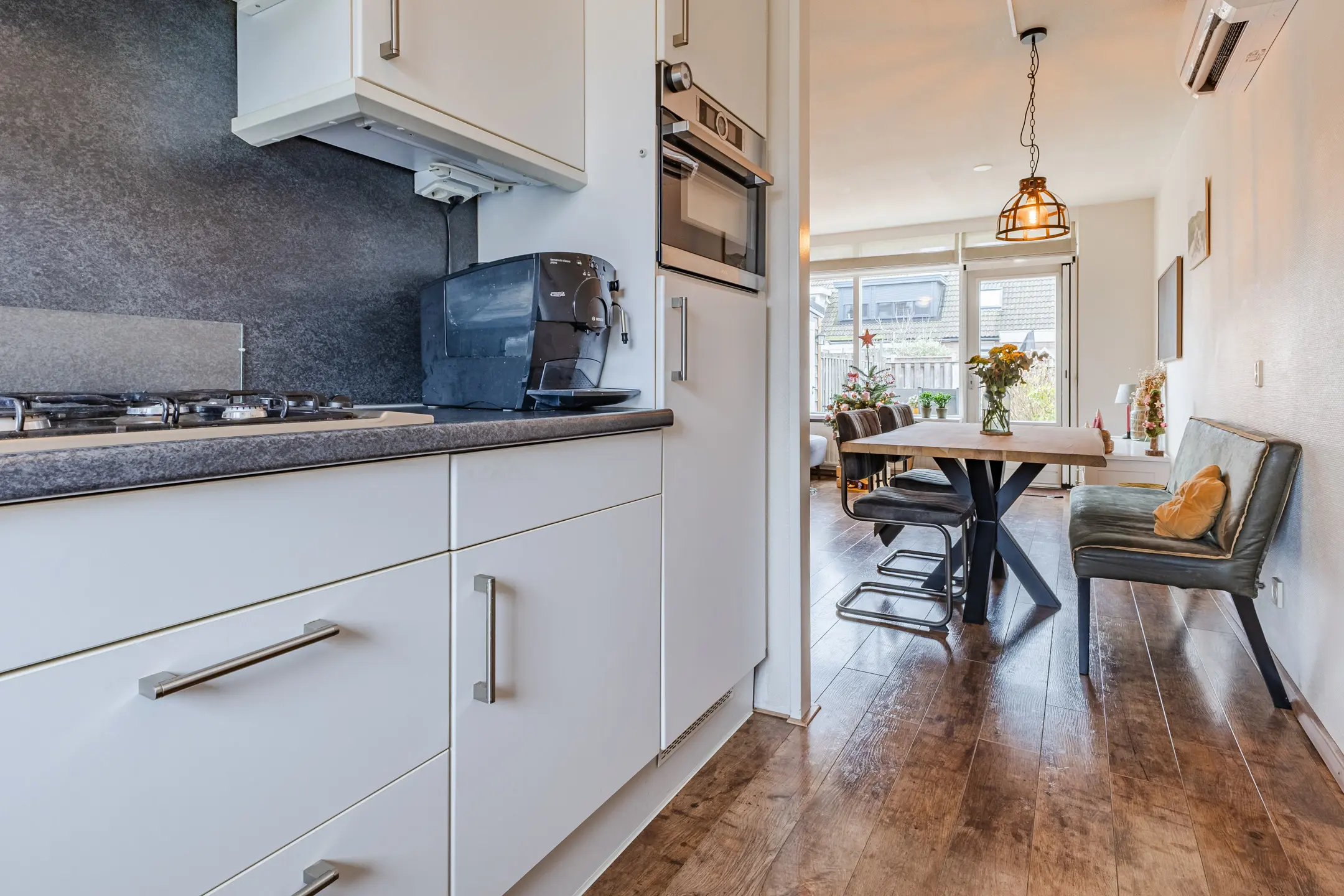 De woonkamer is het hart van het huis: een lichte, uitnodigende ruimte waar je samenkomt met het gezin of rustig kunt ontspannen. Dankzij de airco in de woonkamer is het hier ook tijdens warme dagen heerlijk aangenaam. Vanuit de woonkamer kijk je door de grote ramen uit op de achtertuin, terwijl de open keuken aan de voorzijde de perfecte plek biedt om te koken met zicht op de straat. De keuken is al wat ouder van opzet, maar alle inbouwapparatuur is in de afgelopen tijd vervangen, waardoor koken praktisch en prettig blijft. De keuken is ook volledig voorbereid op elektrisch koken.