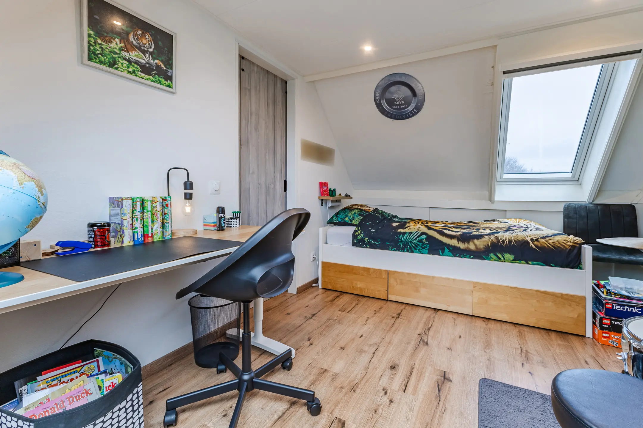 De woning telt vier slaapkamers, ideaal voor gezinnen. Op de eerste verdieping liggen drie goed bemeten kamers met een frisse uitstraling, twee daarvan zijn voorzien van mooie inbouwkasten en extra bergruimte. Op de gehele verdieping zijn er kunststof kozijnen aanwezig allen voorzien van een inzethor en rolluiken. De zolderkamer is verrassend ruim en dankzij de kunststof Velux dakramen met isolerende beglazing en zonsverduisterend glas is het hier comfortabel om te werken, slapen of spelen. De aanwezige opbergzolder/vliering zorgt voor extra praktische ruimte.