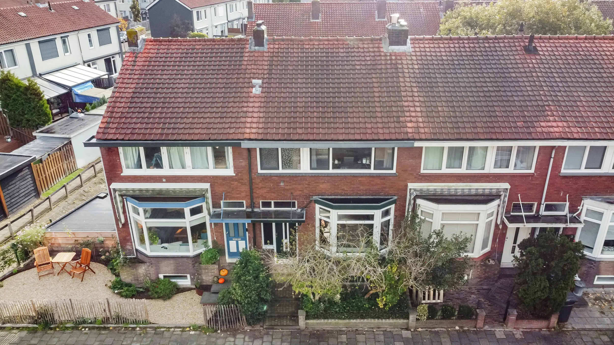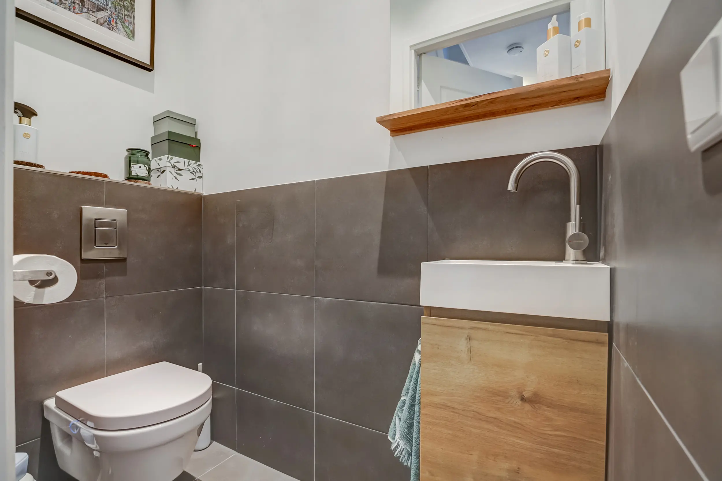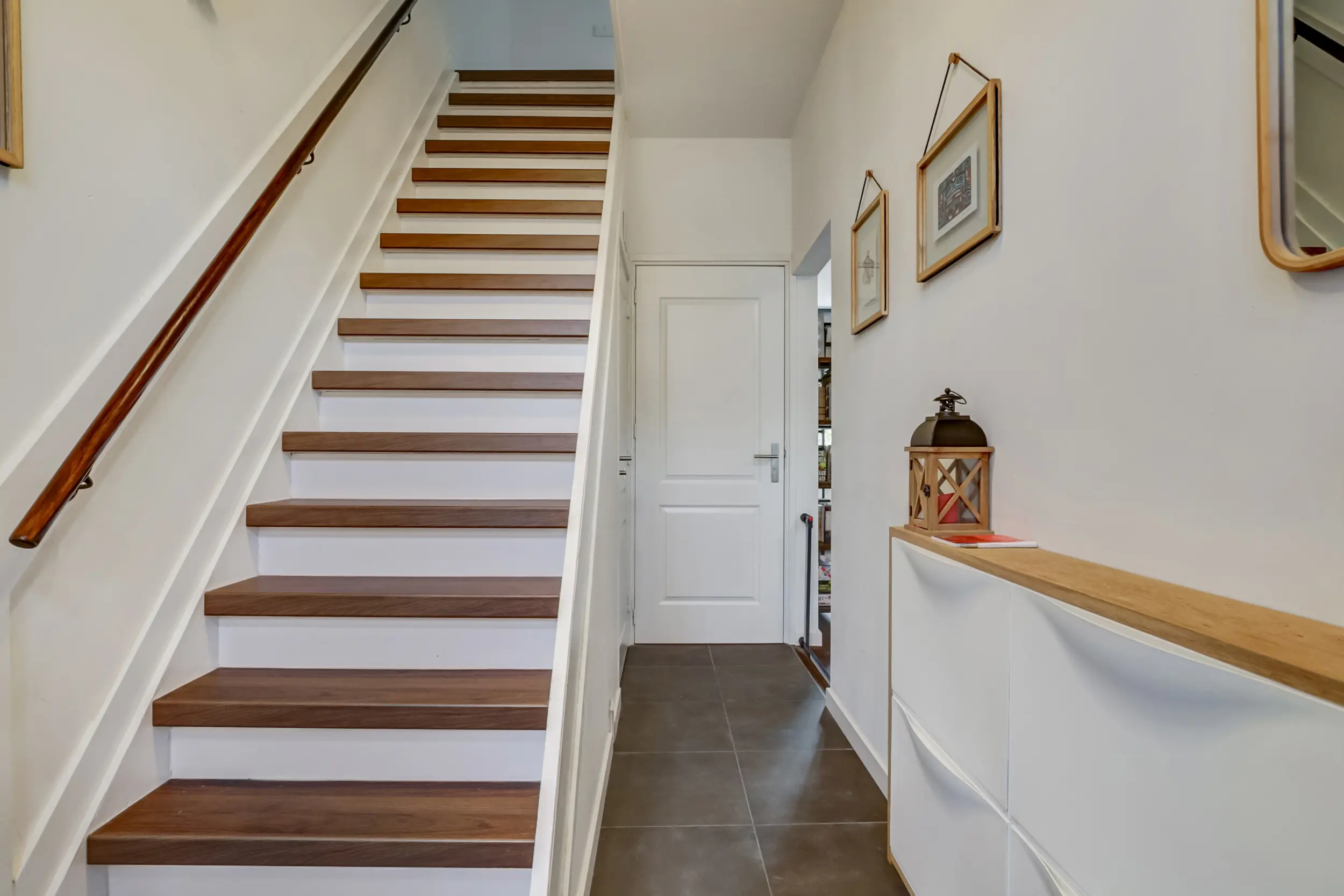 Bij binnenkomst wordt u welkom geheten door een fijne en groene voortuin, waar liefde voor groen direct voelbaar is. Het kleine afdakje bij de voordeur zorgt ervoor dat je nét droog staat bij binnenkomst. In de entree bevindt zich een handige garderobehoek en een fraaie trap die je naar de eerste verdieping brengt. In de hal is tevens de deur naar de vergrote toiletruimte: deze is voorzien van een zwevend toilet met fonteintje — een subtiel, maar prettig detail.