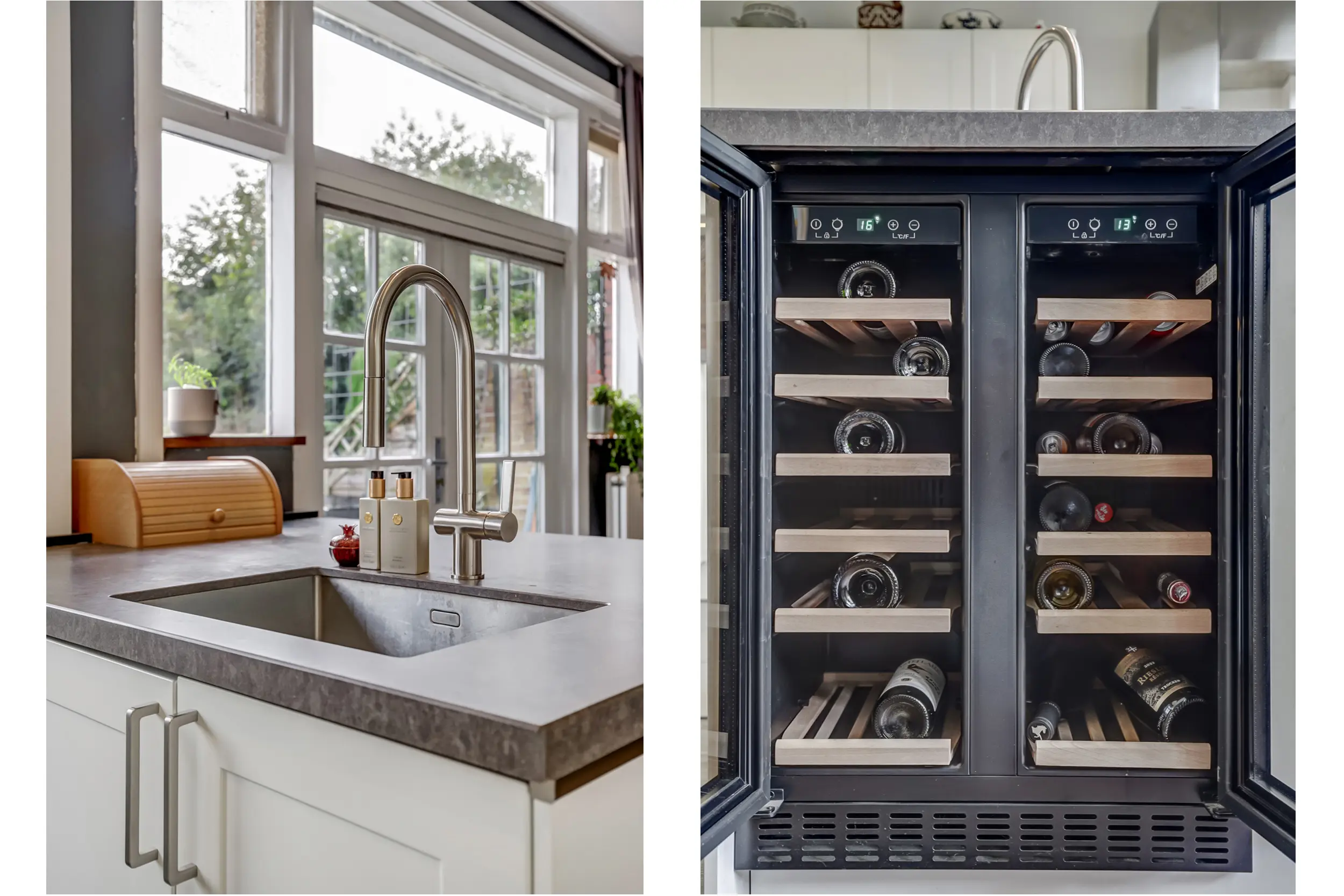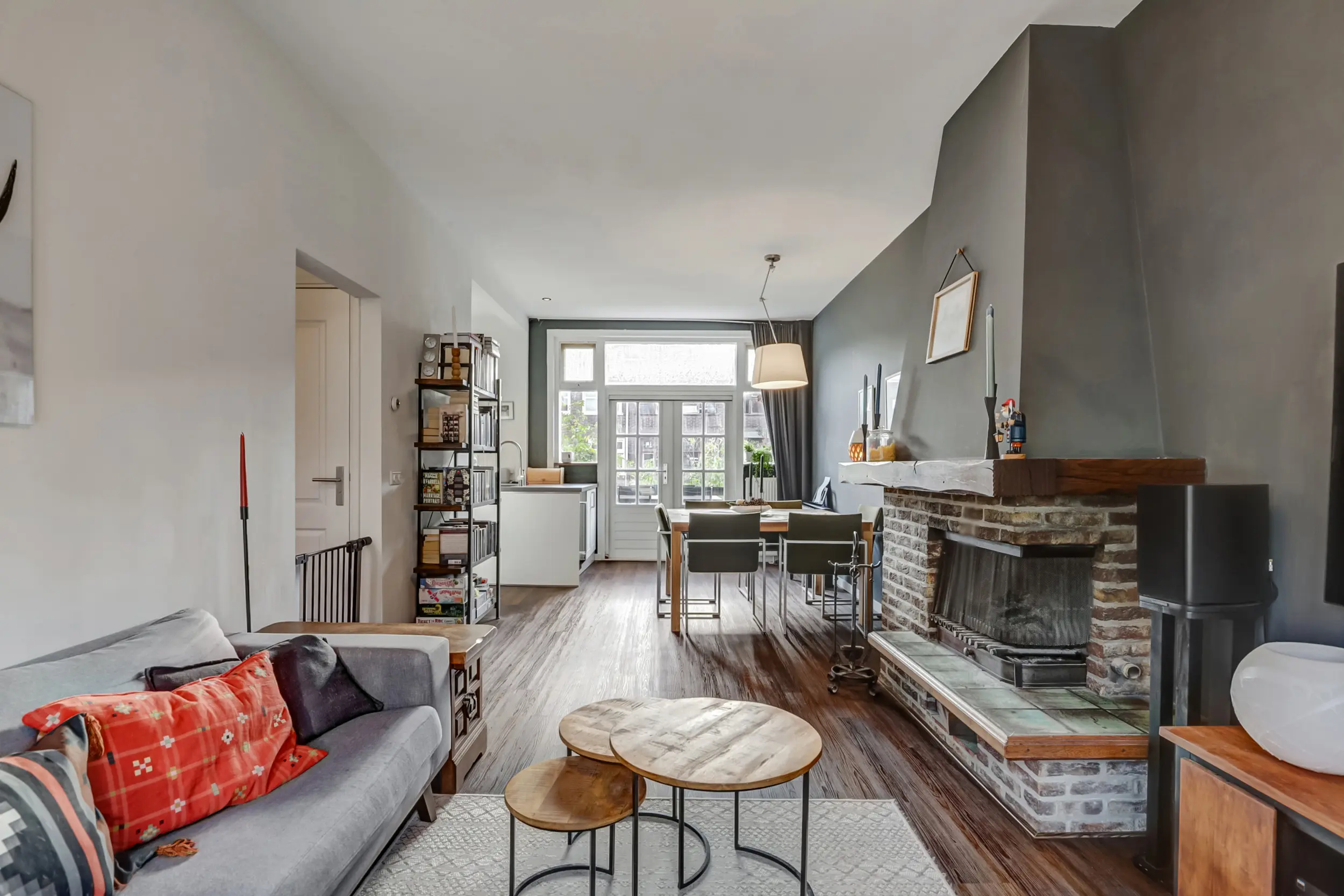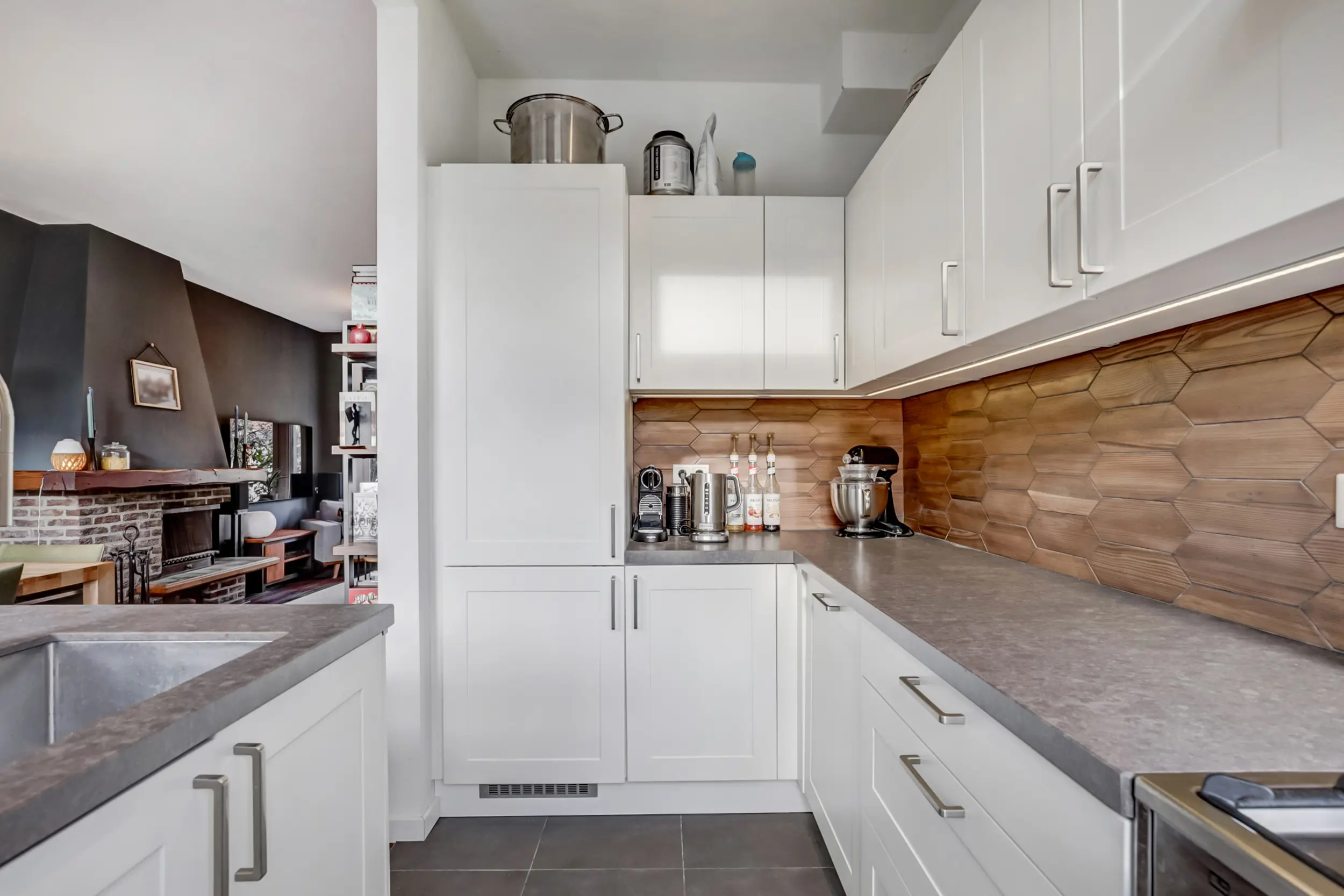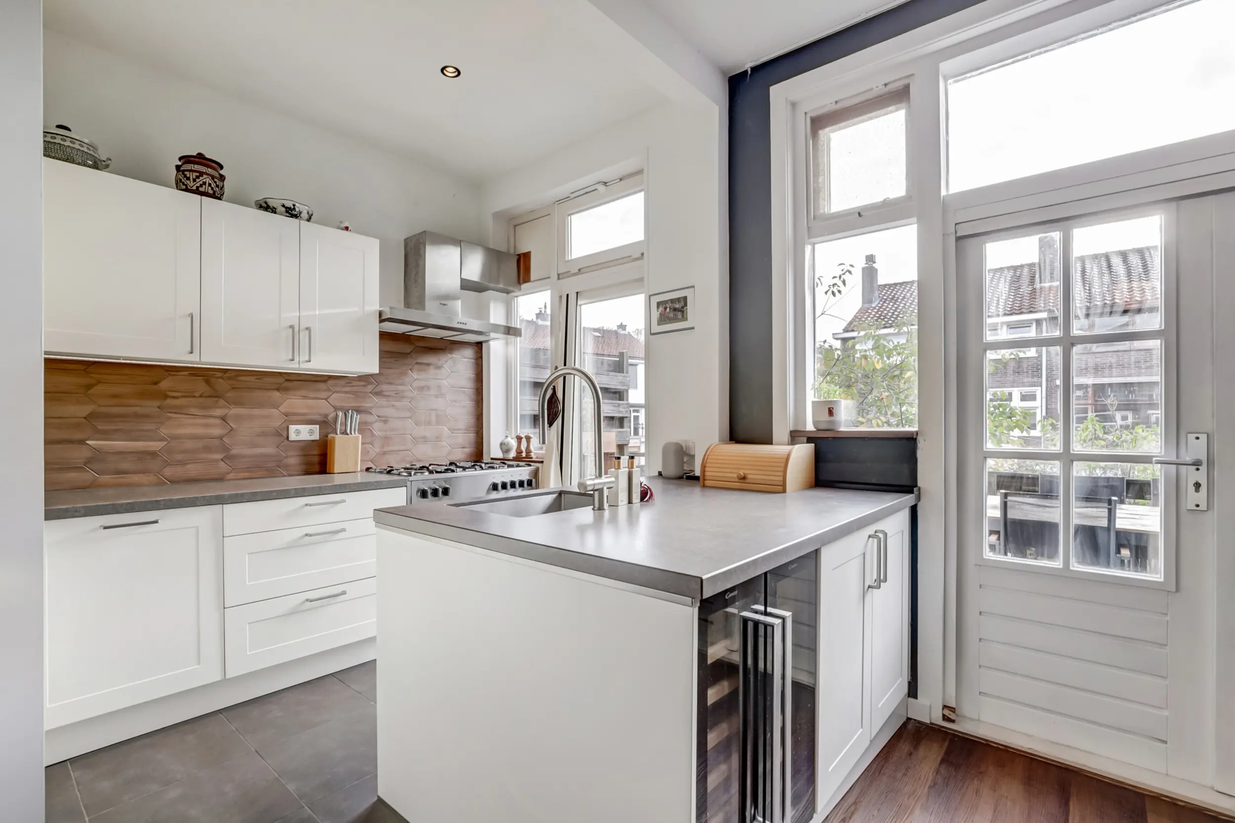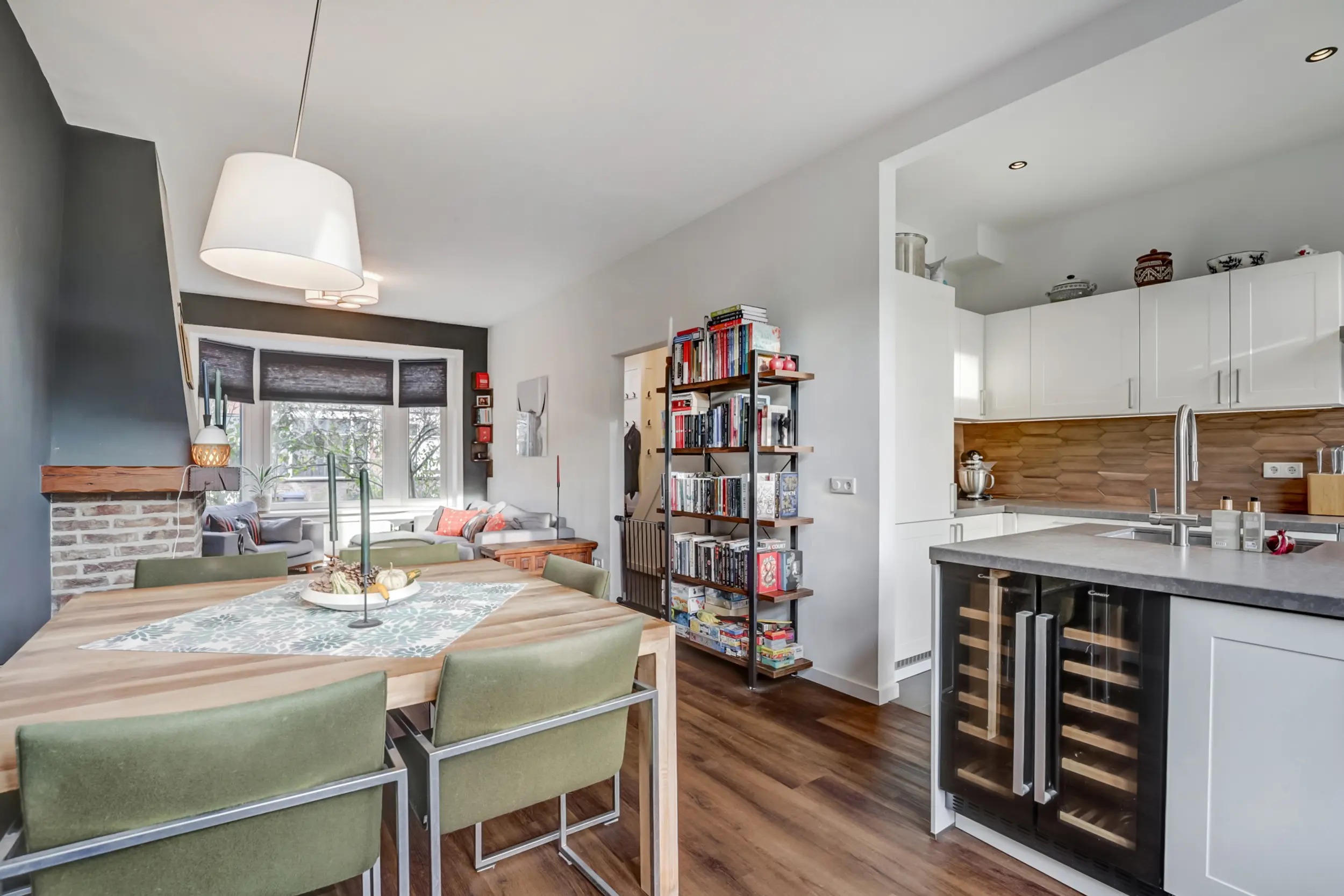 Onder de trap vind je de toegang naar het souterrain. De woonkamer is ruim en zonnig dankzij de hoge plafonds en straalt echte gezelligheid uit — mede door de aanwezige open haard. Via openslaande deuren stap je het balkon op (gelegen op het zuidoosten), waardoor binnen en buiten naadloos in elkaar kunnen overlopen. De moderne open keuken (uit 2020) in L-opstelling met kookeiland is een lust voor het oog en praktisch in gebruik. Naast de standaard apparatuur is er zelfs een wijn-klimaatkast aanwezig — heerlijk voor wie van een goed glas houdt!