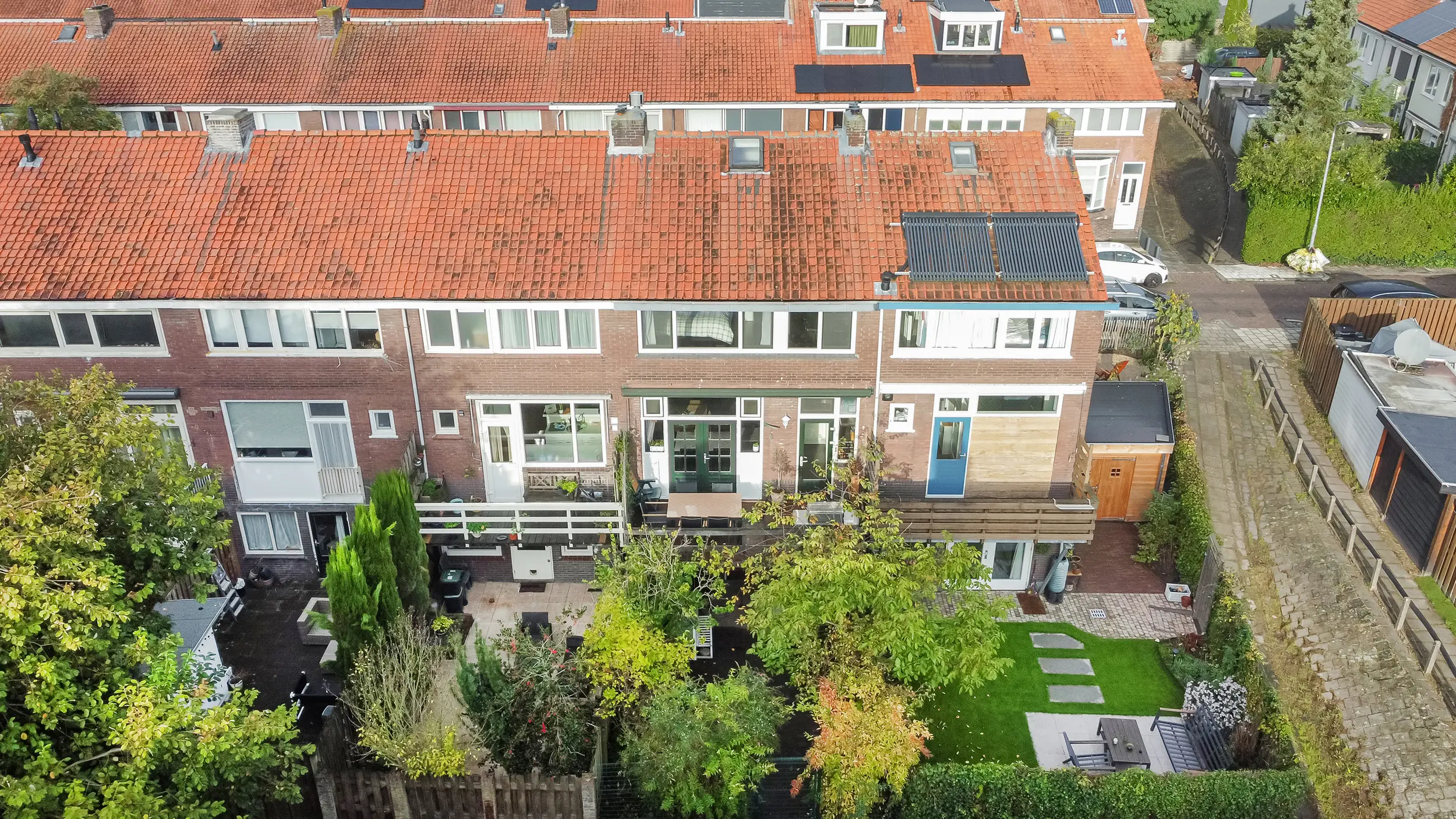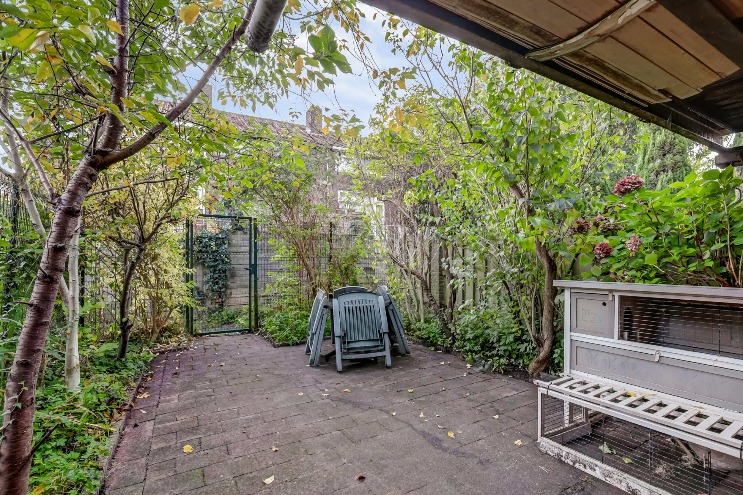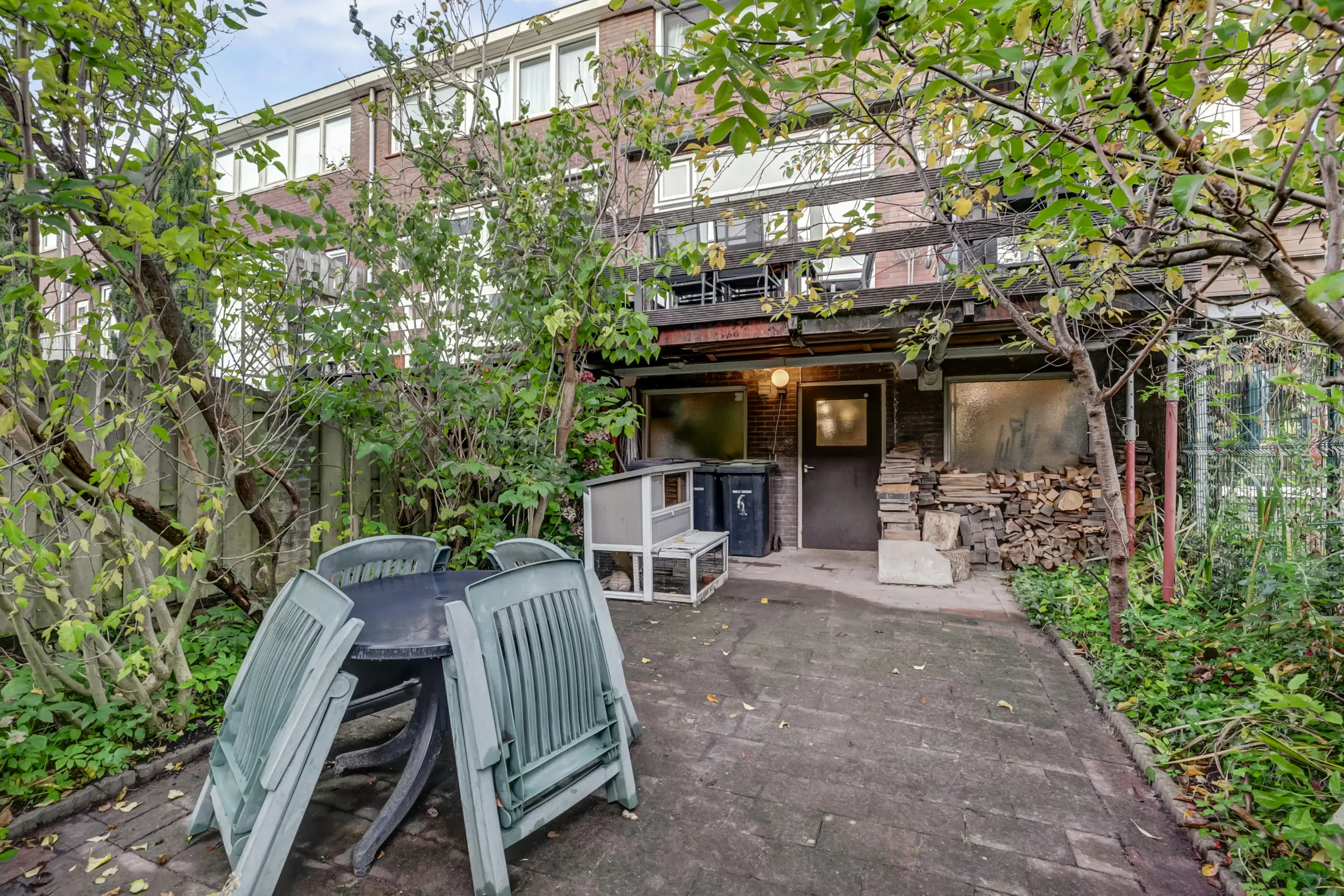 De achtertuin, gelegen op het zuidoosten, is net als de voortuin groen en uitnodigend — een prettige en rustige tuinbeleving in de stad. Via de achterom is er prima toegang voor fietsen en bezoekers. De tuin is vanuit het souterrain goed bereikbaar, en onder het balkon is een beschut plekje te vinden wanneer de zon wat fel is of het weer wat minder.