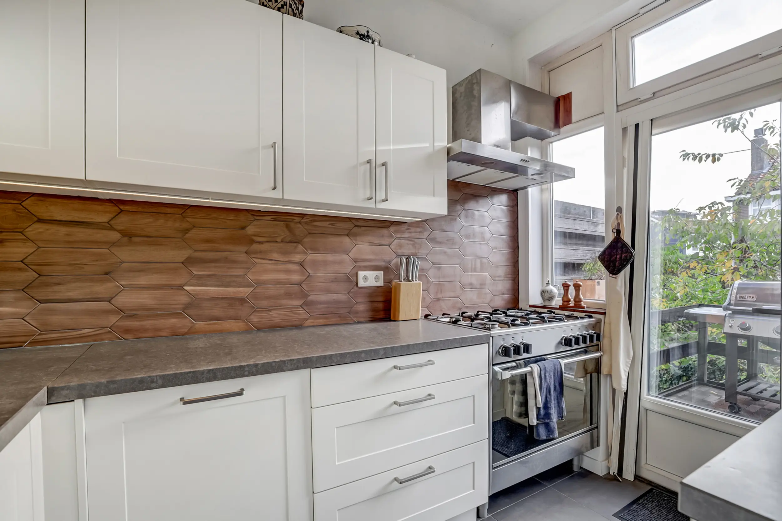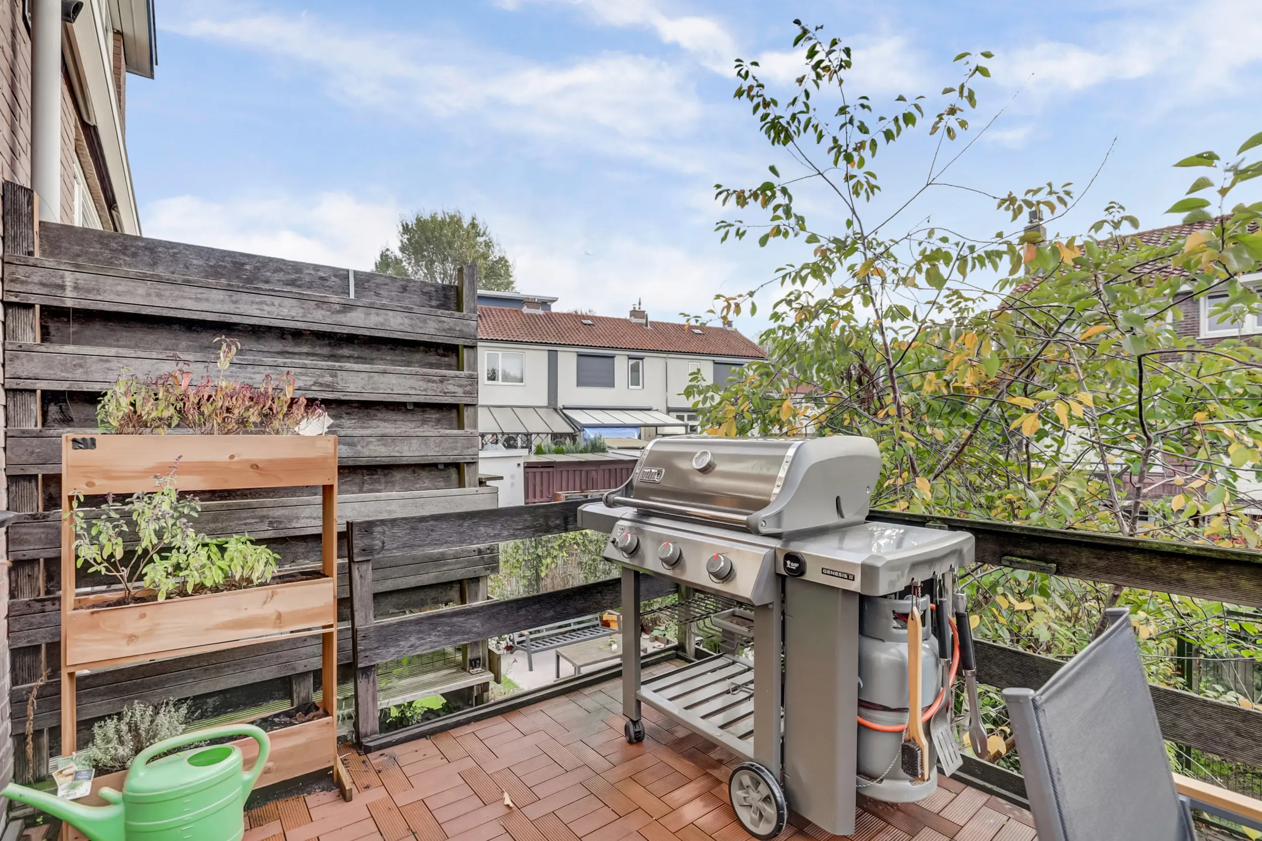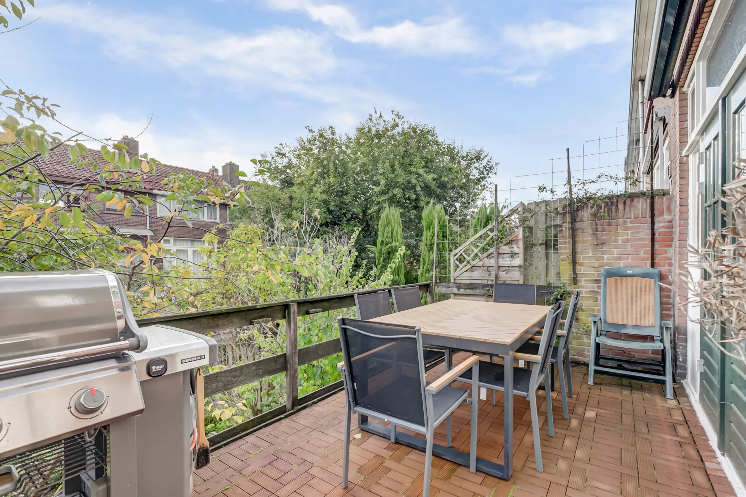 De achtertuin, gelegen op het zuidoosten, is net als de voortuin groen en uitnodigend — een prettige en rustige tuinbeleving in de stad. Via de achterom is er prima toegang voor fietsen en bezoekers. De tuin is vanuit het souterrain goed bereikbaar, en onder het balkon is een beschut plekje te vinden wanneer de zon wat fel is of het weer wat minder.