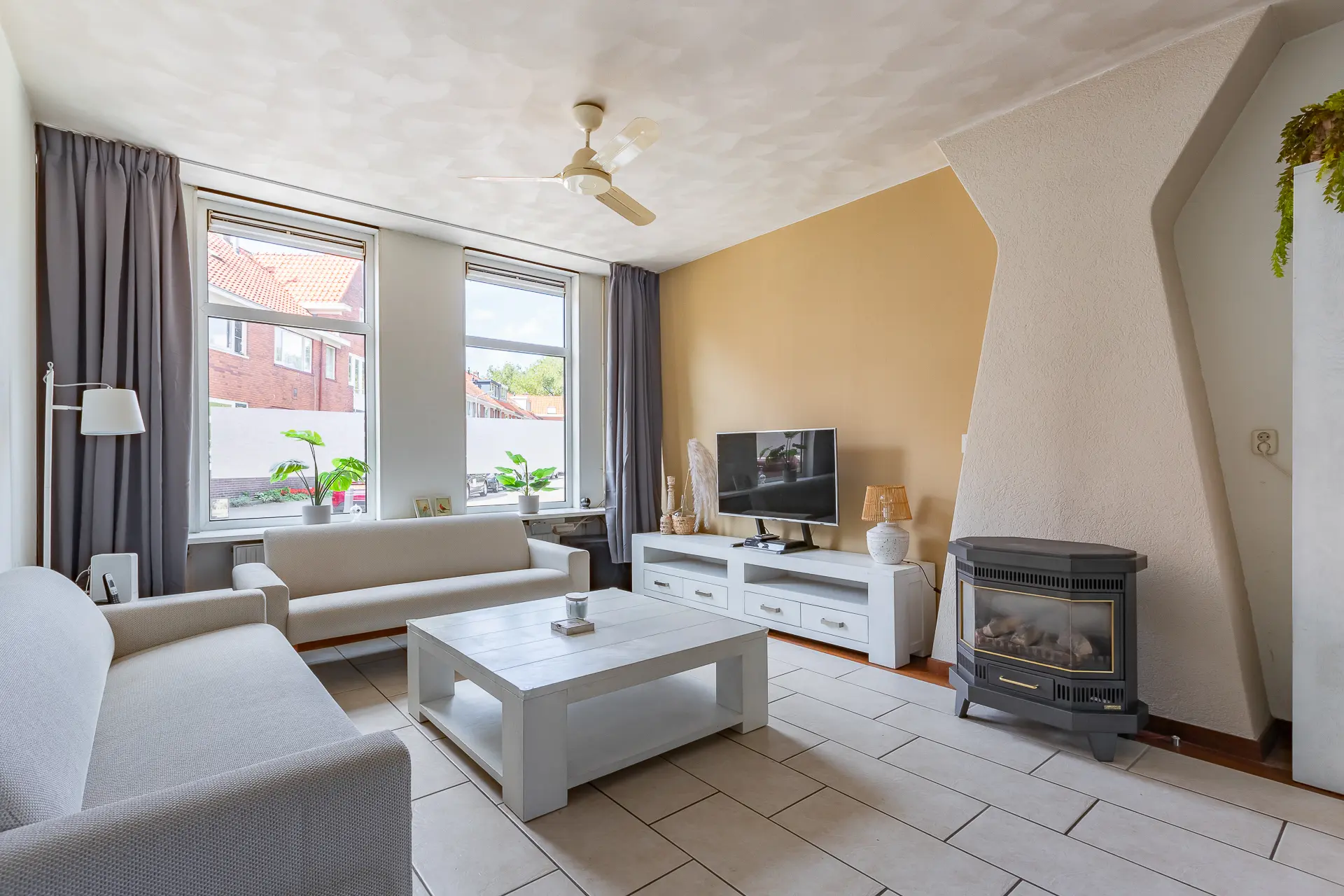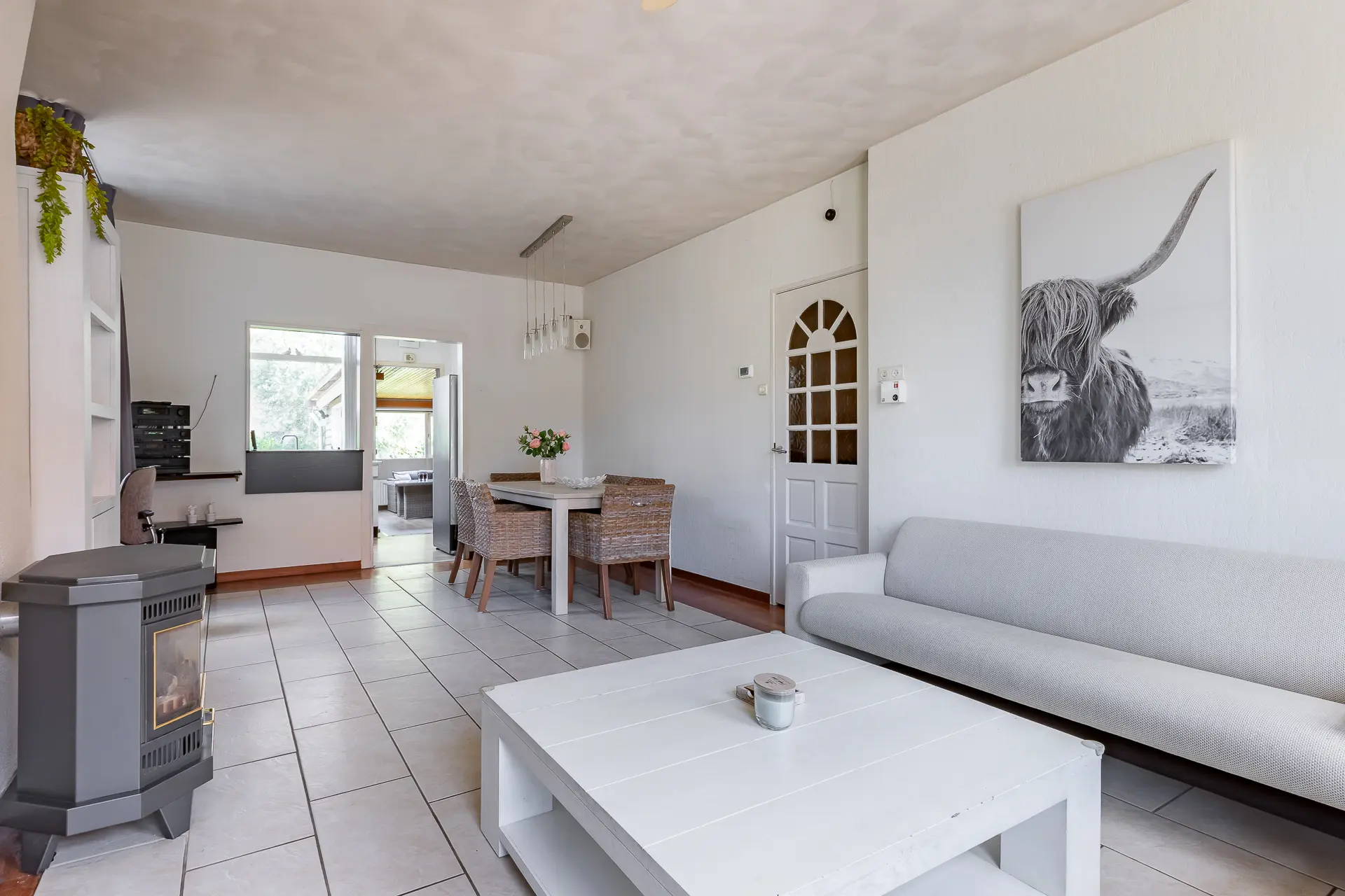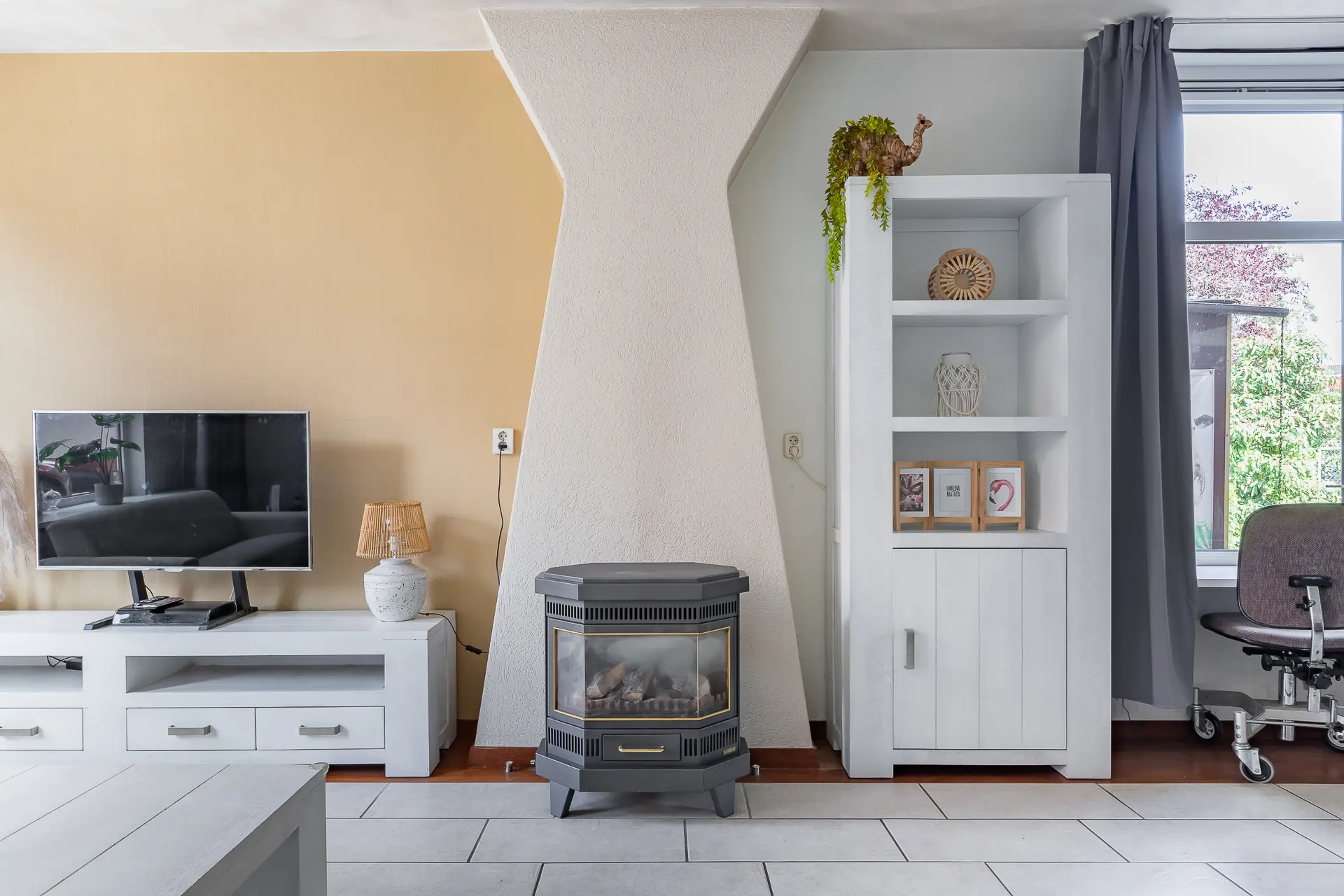 Lichte woonkamer met open keuken. De woonkamer heeft een moderne uitstraling door de lichte tegelvloer en de strak afgewerkte muren en plafond. De ramen brengen veel licht naar binnen en bieden ook vrij uitzicht op het plantsoen aan de voorzijde en diep vaarwater aan de achterzijde. De woonkamer is voorzien van een schouw met gashaard.