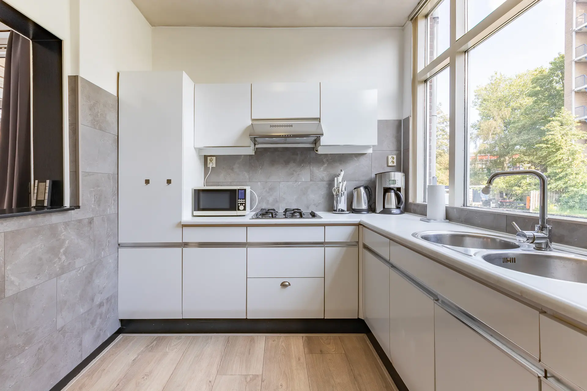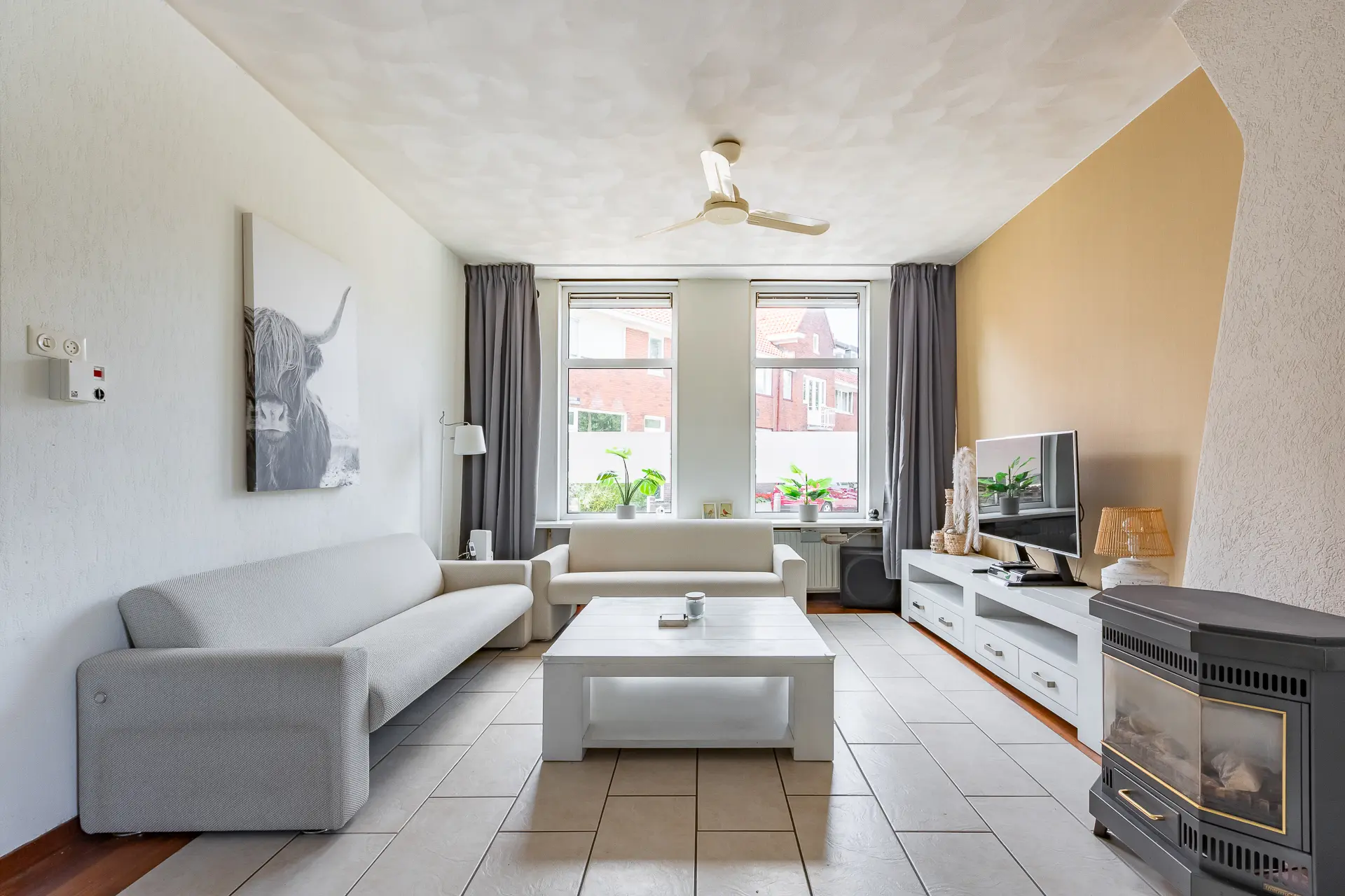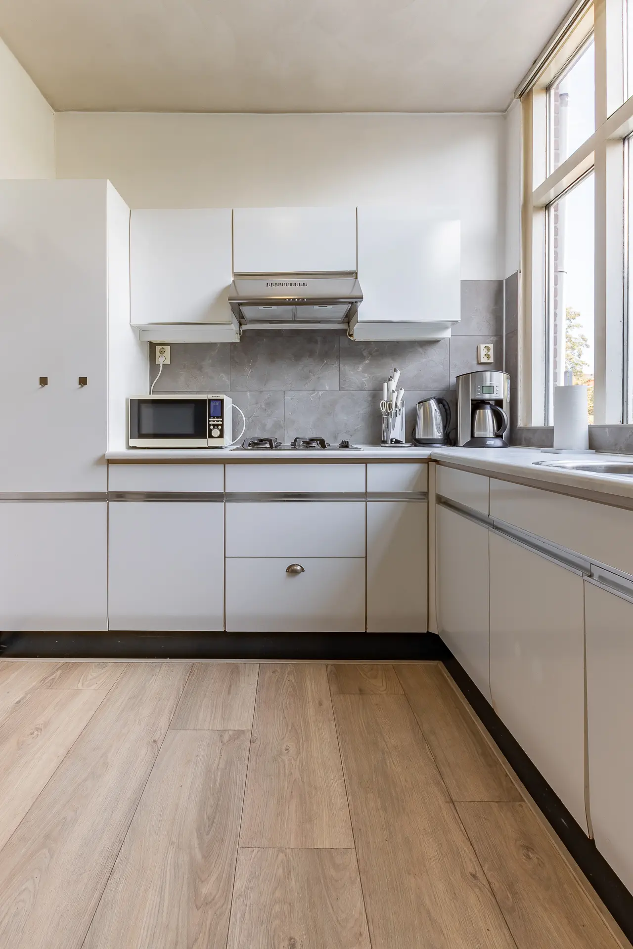 Lichte woonkamer met open keuken. De woonkamer heeft een moderne uitstraling door de lichte tegelvloer en de strak afgewerkte muren en plafond. De ramen brengen veel licht naar binnen en bieden ook vrij uitzicht op het plantsoen aan de voorzijde en diep vaarwater aan de achterzijde. De woonkamer is voorzien van een schouw met gashaard.