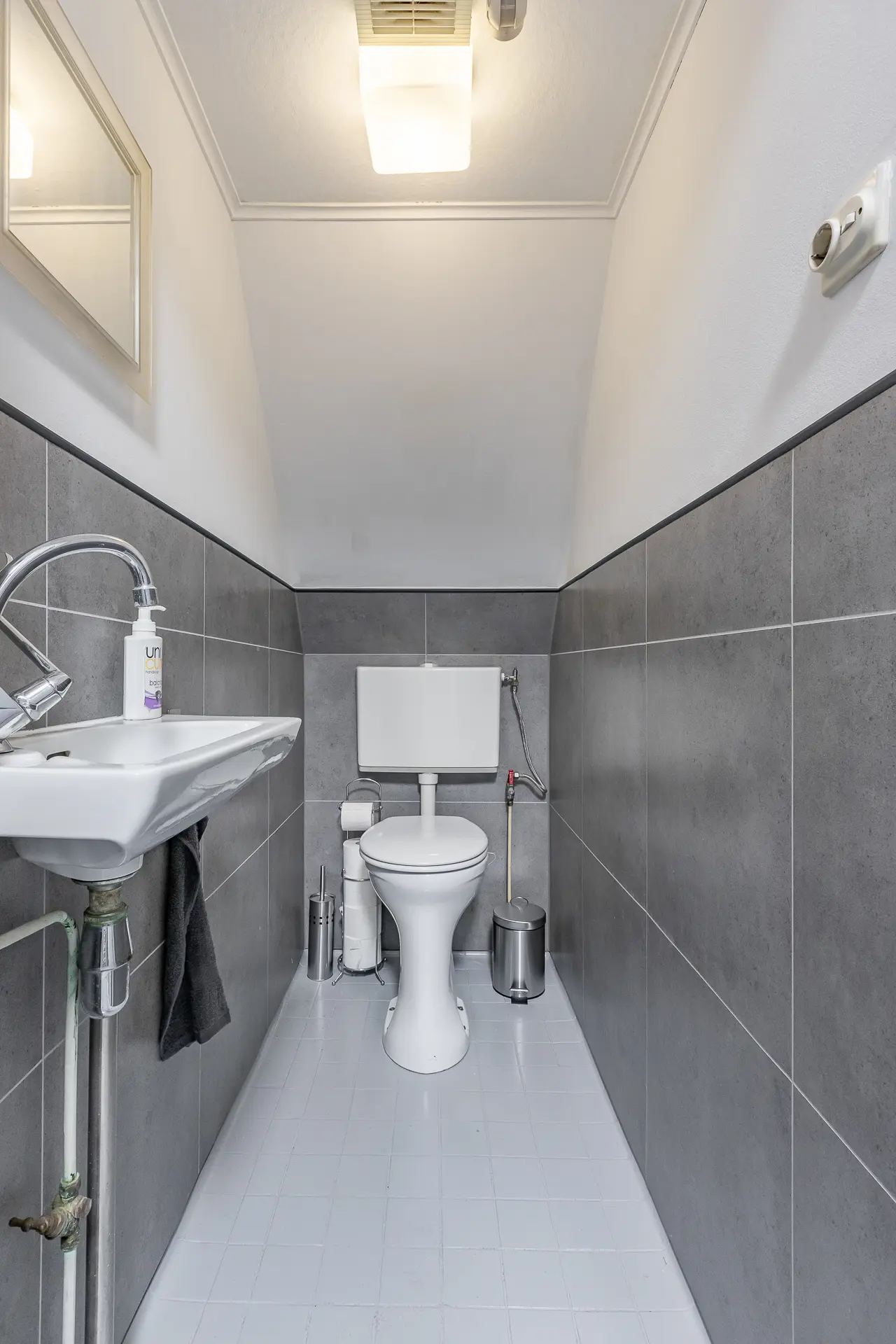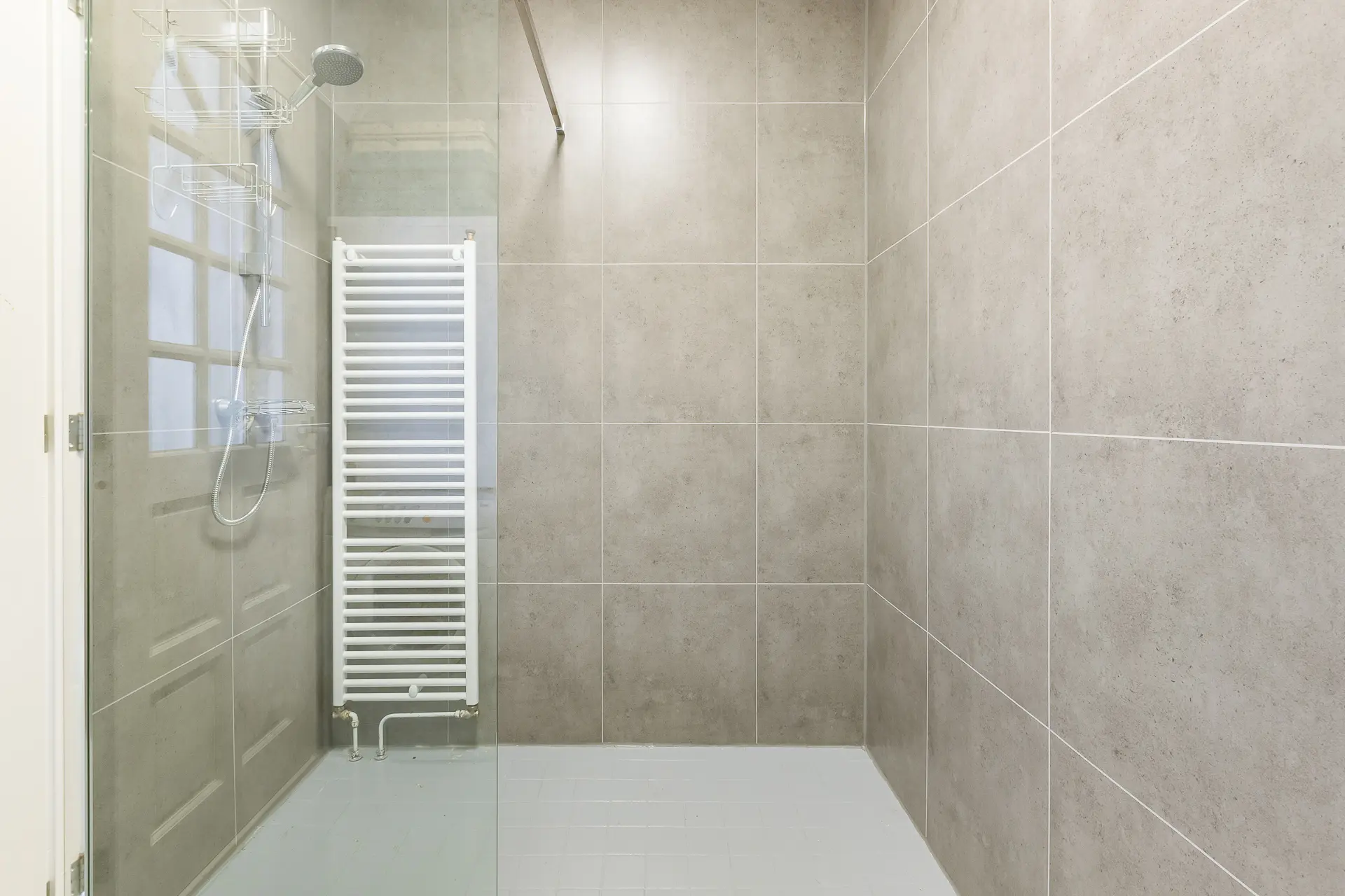 De nieuwe badkamer is voorzien van een inloopdouche en toilet, alsmede aansluiting voor wasmachine en droger.