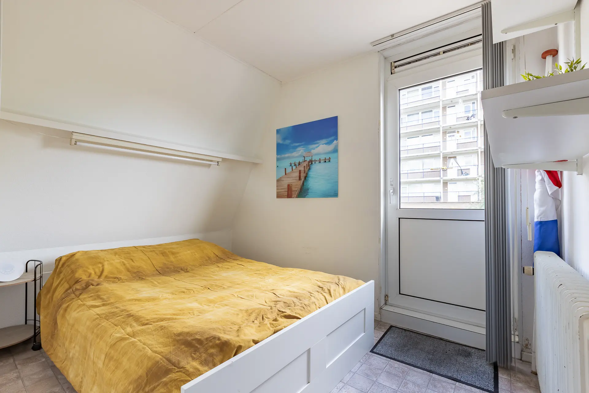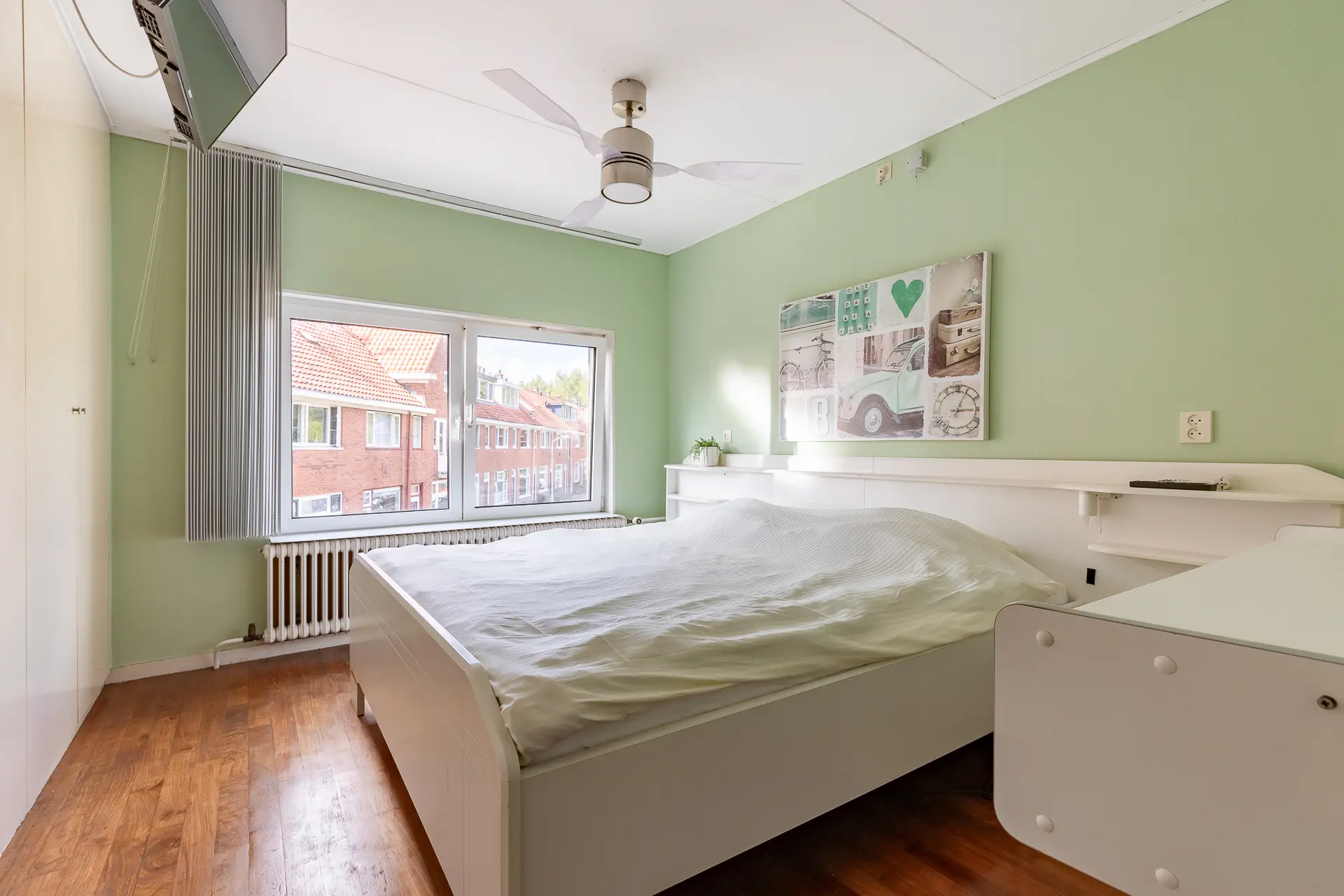 Ruime slaapkamer aan de voorzijde met kasten en ruime slaapkamer aan de achterzijde met dakterras van ruim 16 m2 op het zuiden.