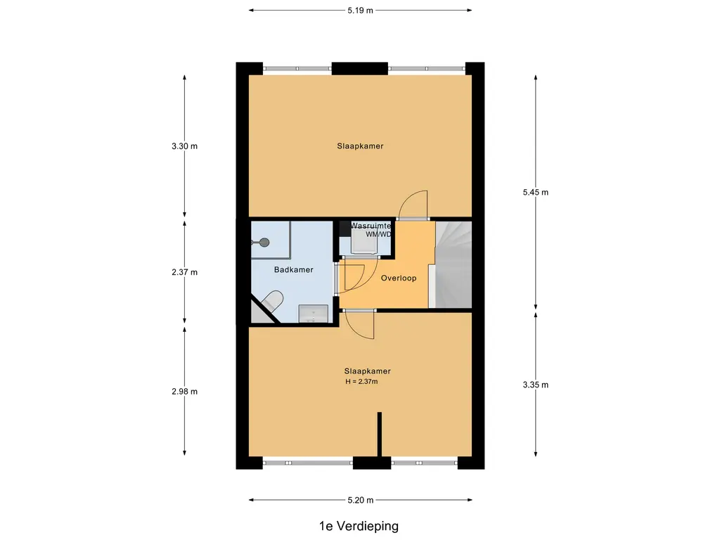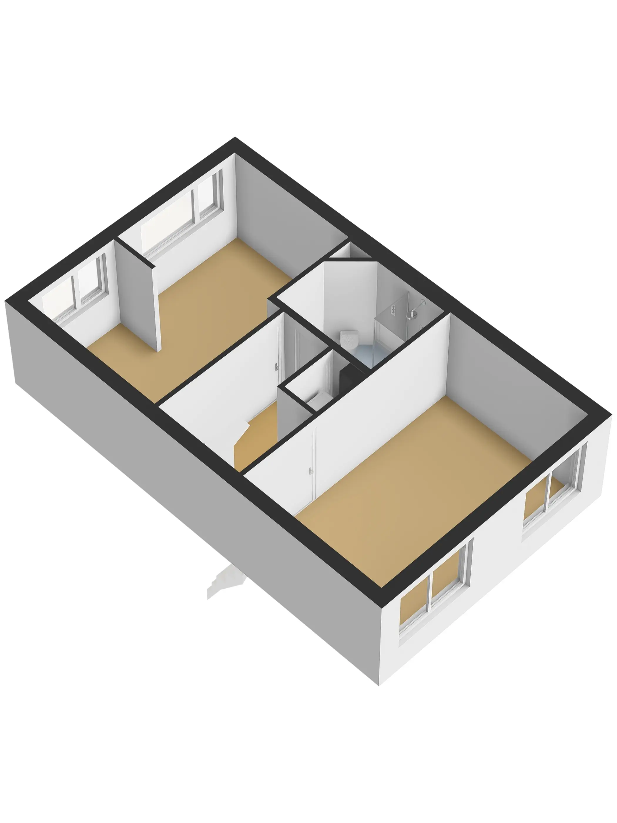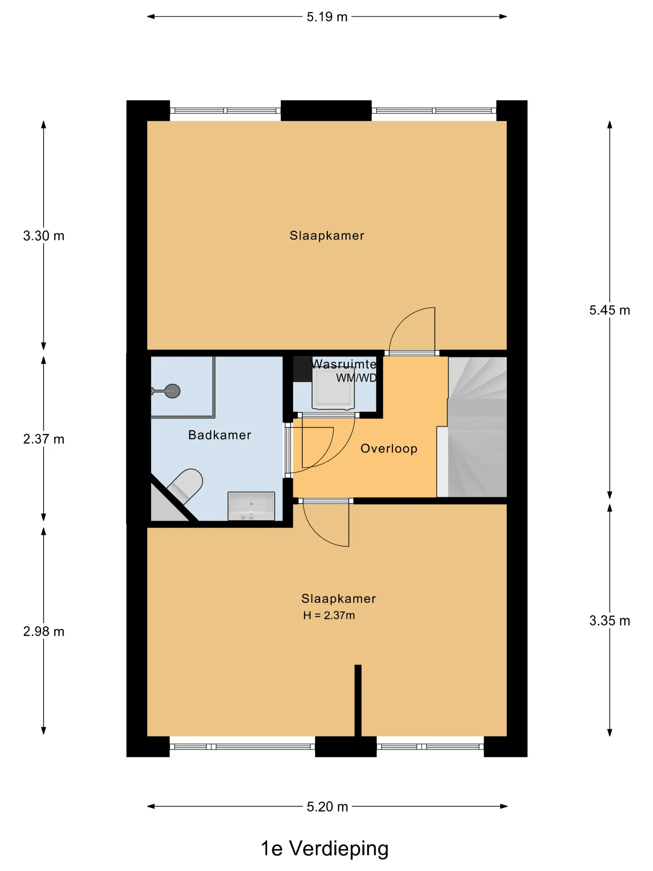 De overloop geeft toegang tot twee ruime slaapkamers (voorheen drie), waarvan één over de volledige breedte van de woning. De badkamer is in 2018 vernieuwd en voorzien van een inloopdouche, modern wastafelmeubel en een tweede zwevend toilet. Handig detail: op deze verdieping is een aparte wasruimte aanwezig met plek voor wasmachine en droger. Alle slaapkamers zijn voorzien van screens.