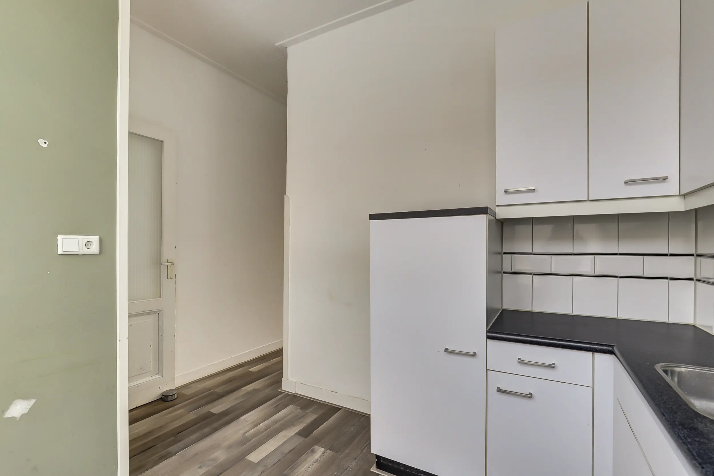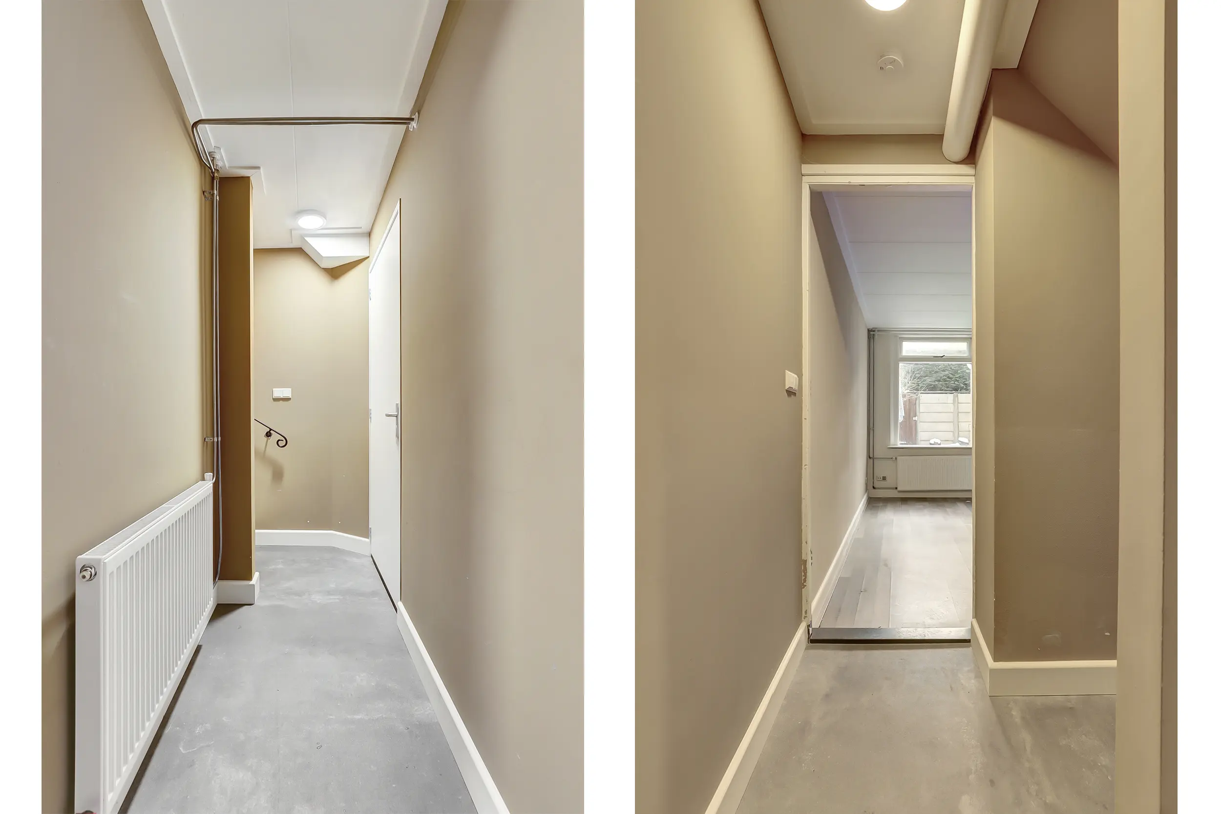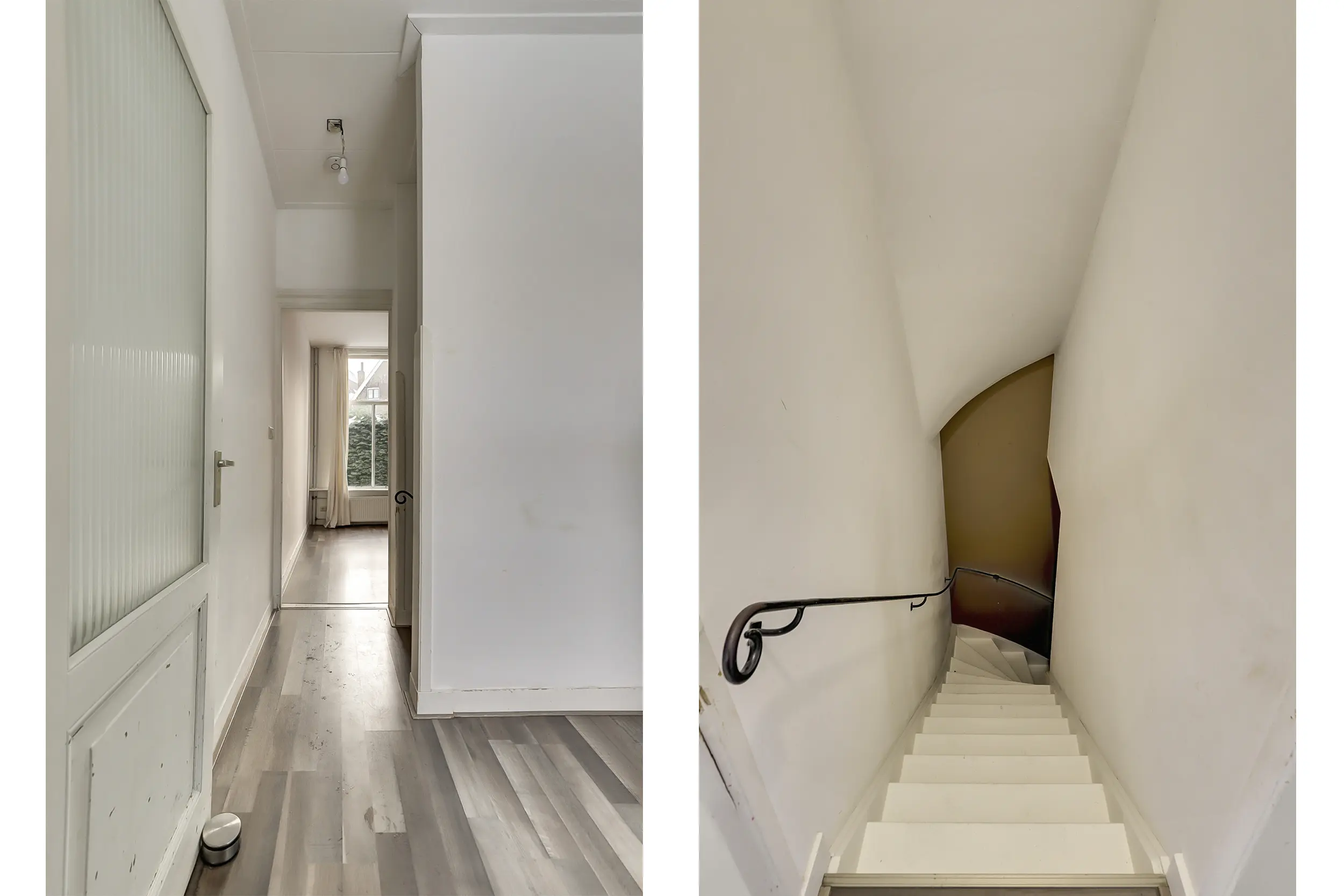 Op de begane grond is de entree met een kleine hal en zowel voor als aan de achterzijde van de woning een kamer. Momenteel is 1 ervan in gebruik als keuken.