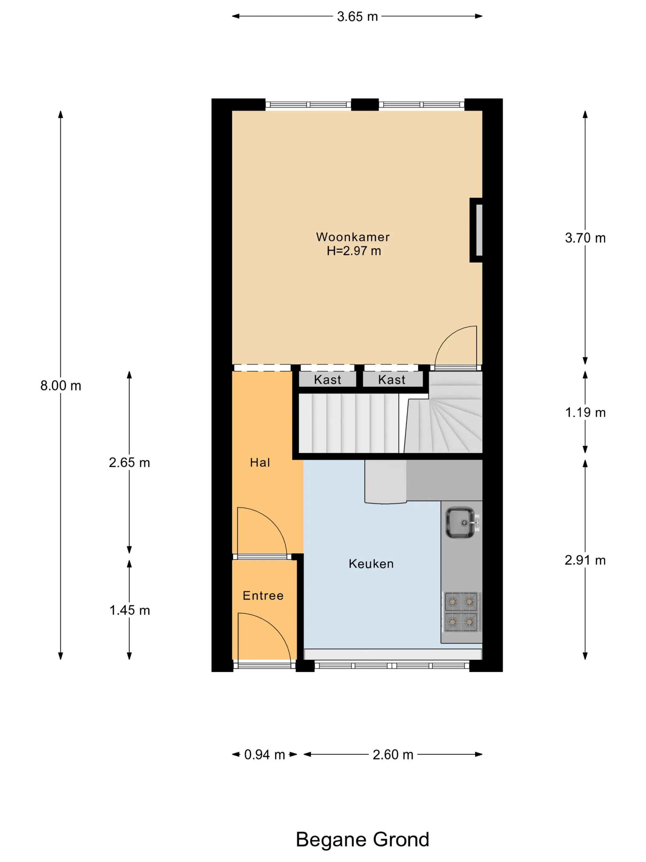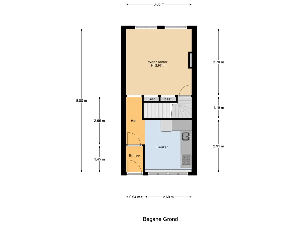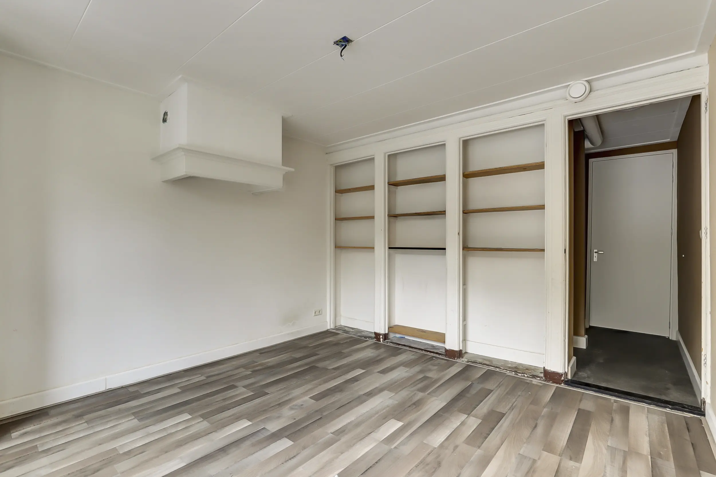 Op de begane grond is de entree met een kleine hal en zowel voor als aan de achterzijde van de woning een kamer. Momenteel is 1 ervan in gebruik als keuken.