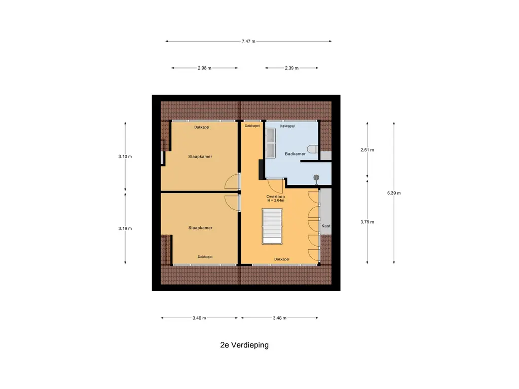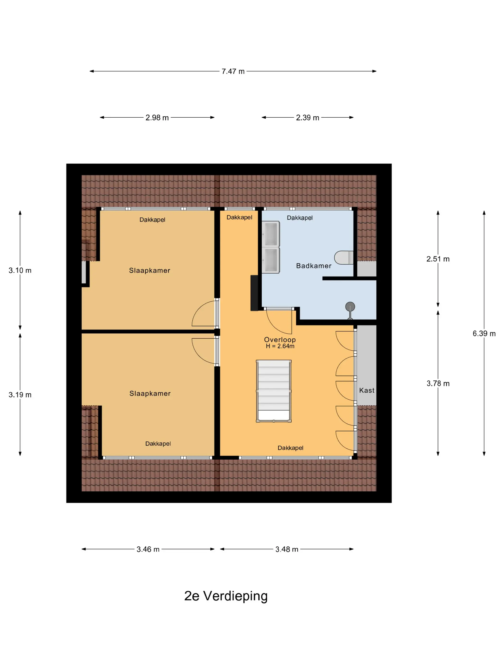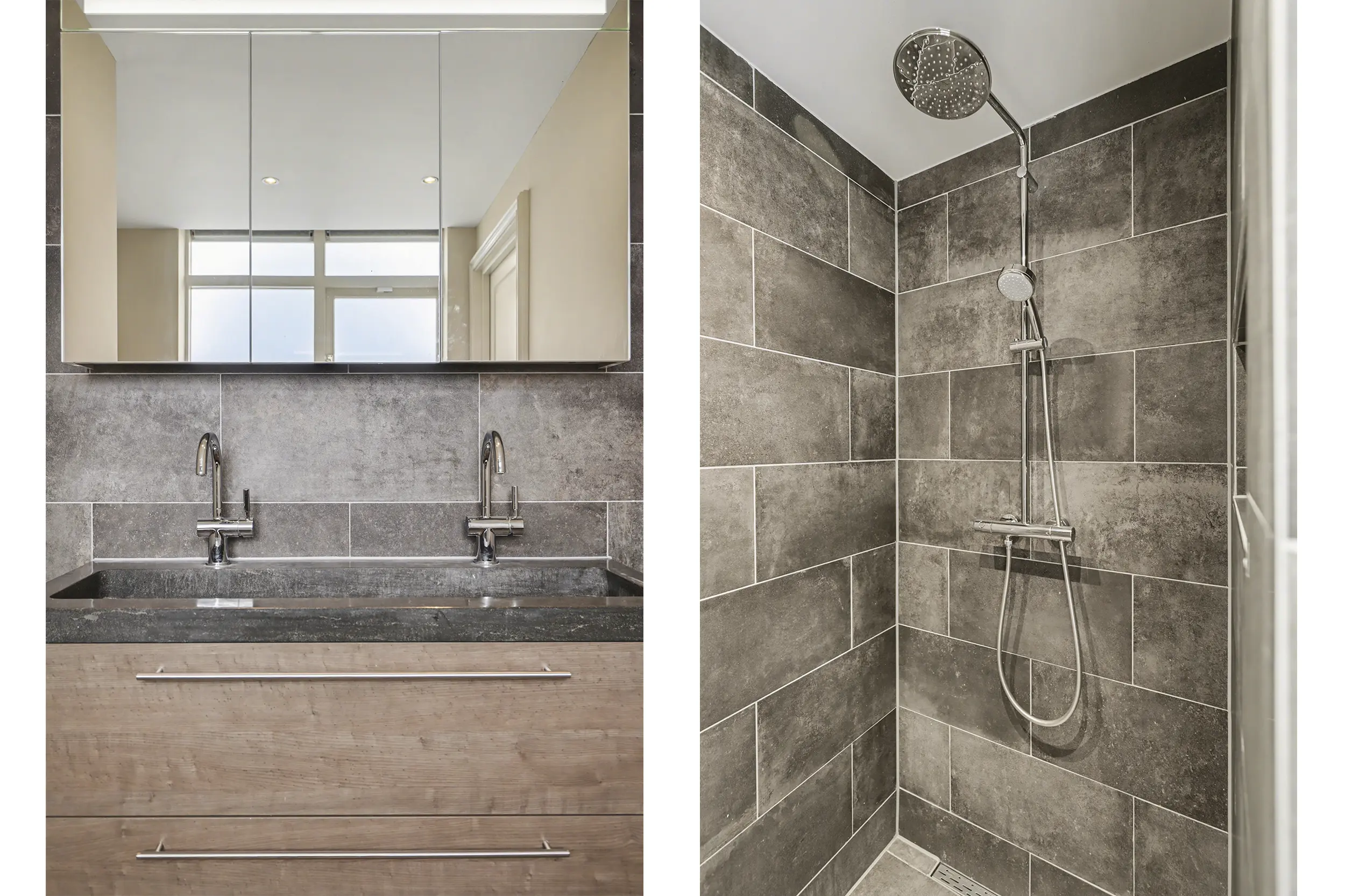 2e verdieping is voorzien van een zeer ruime overloop met vaste kasten (geheel op maat gemaakt) met 2 slaapkamers en een 2e badkamer voorzien van inloopdouche, toilet en wastafel.