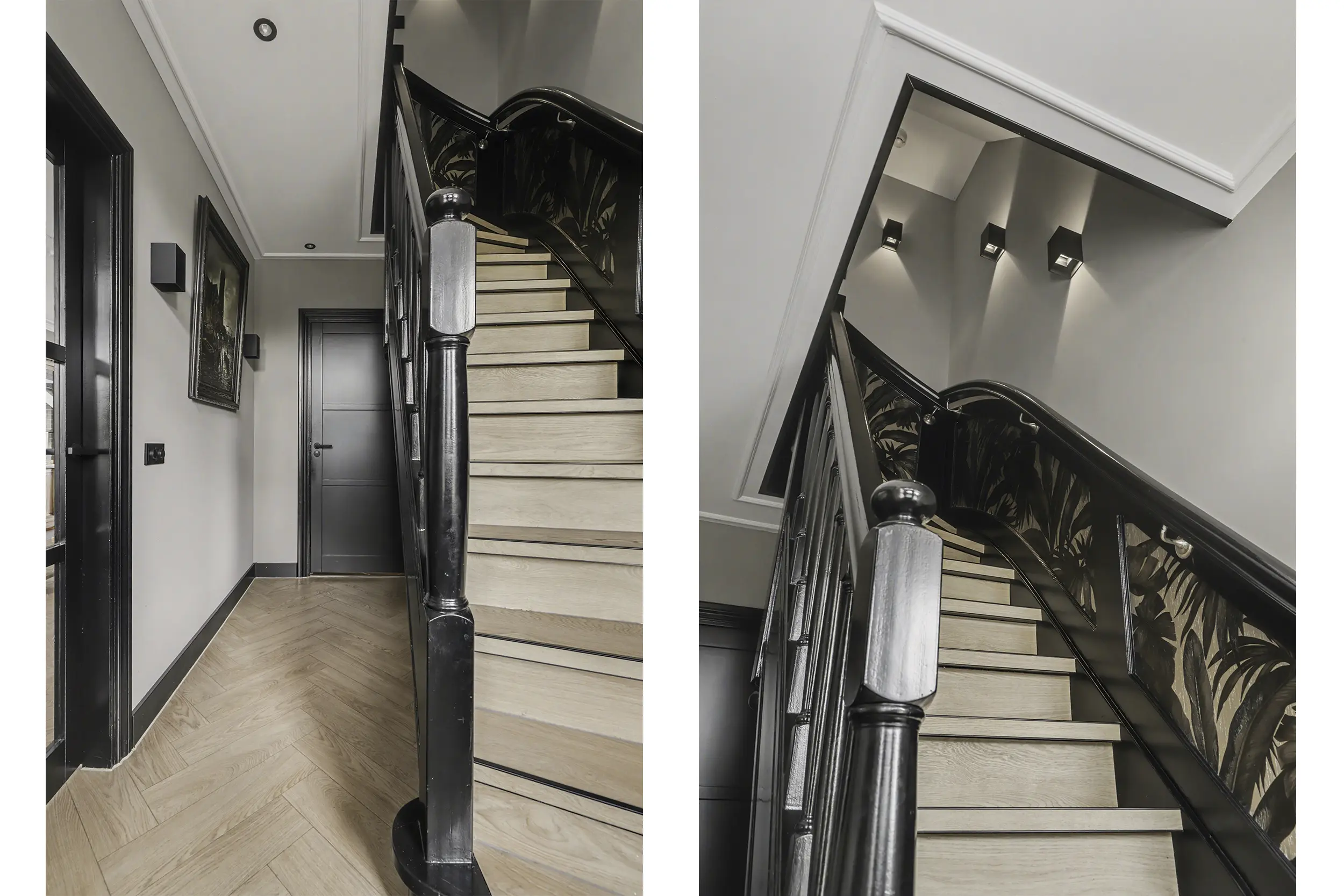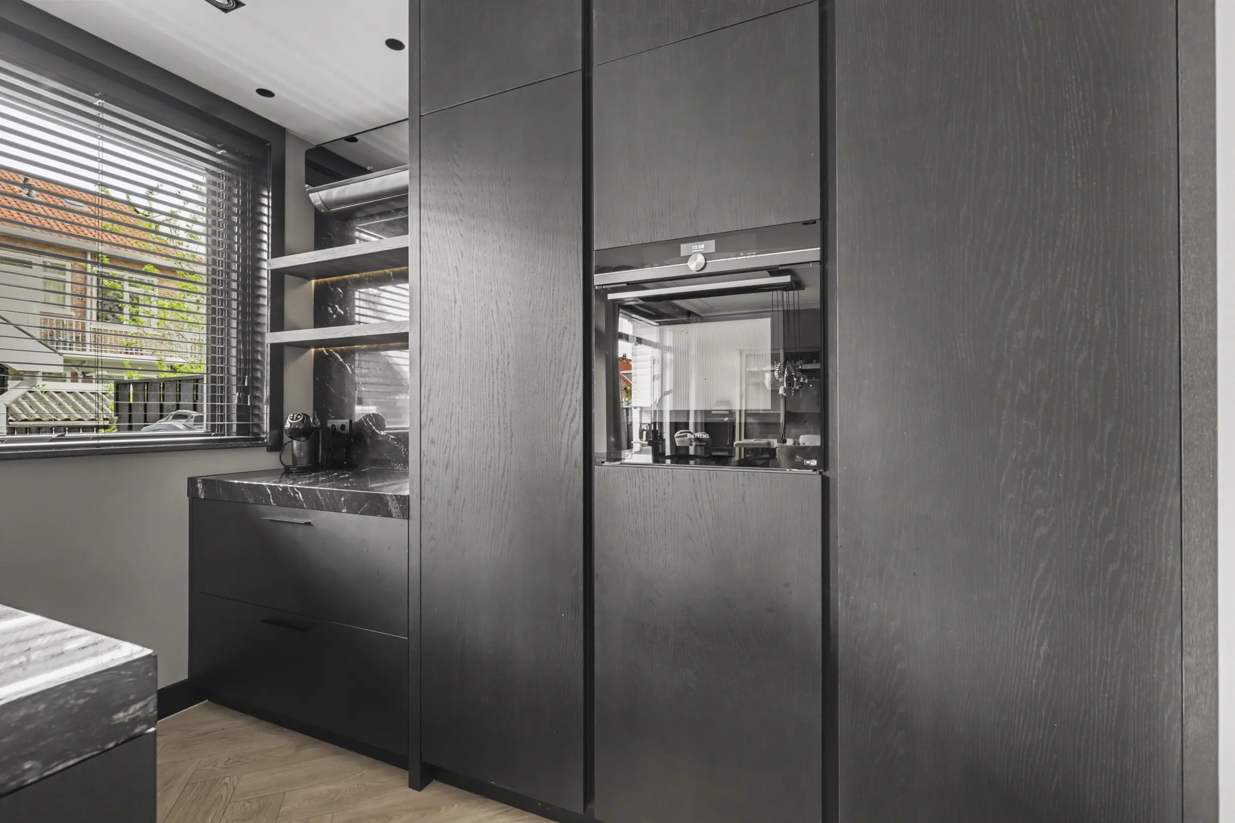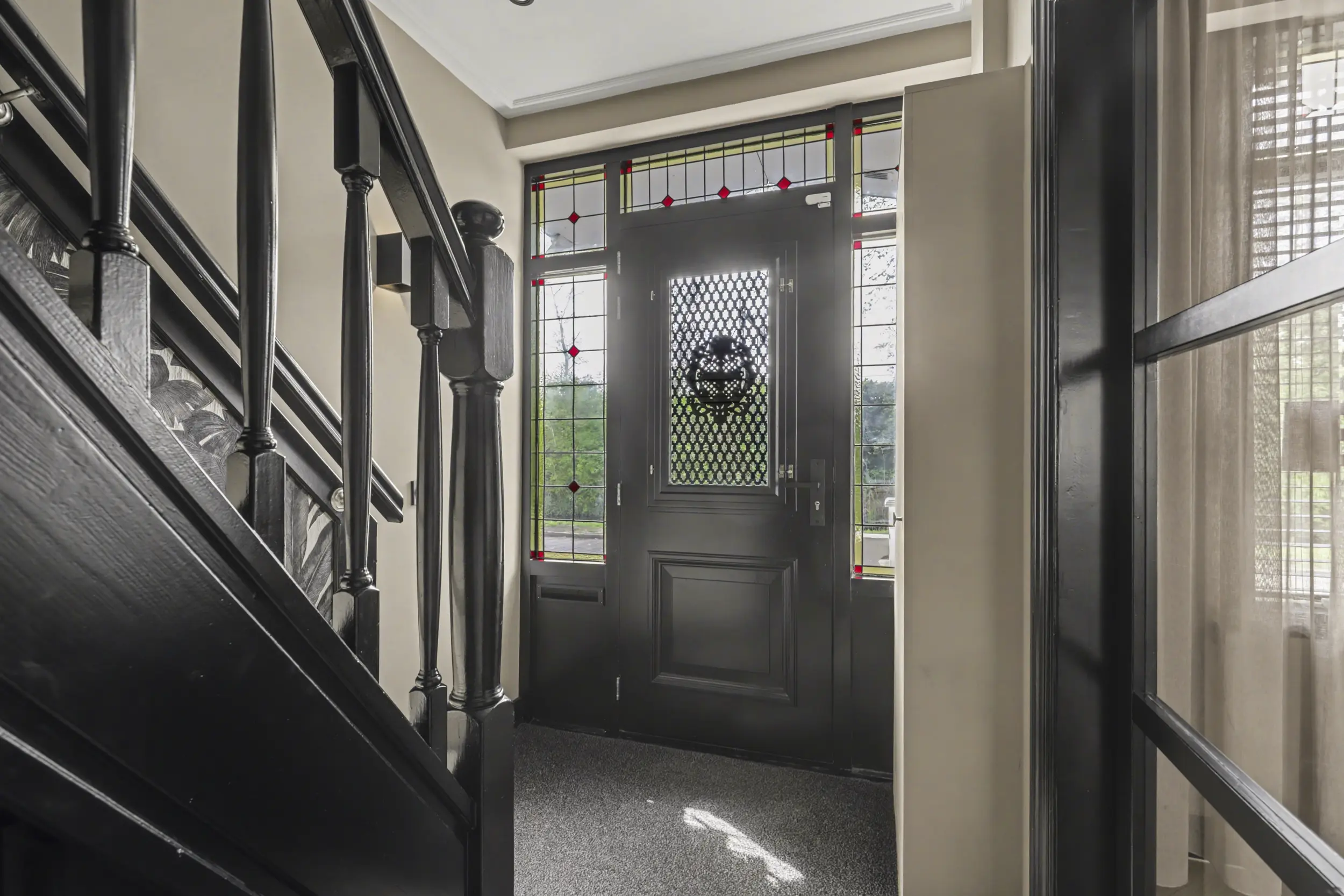 Entree en toegang tot de woonkamer met open keuken als toegang tot de bovengelegen verdiepingen via de fraaie trap en de slaap (werkkamer).