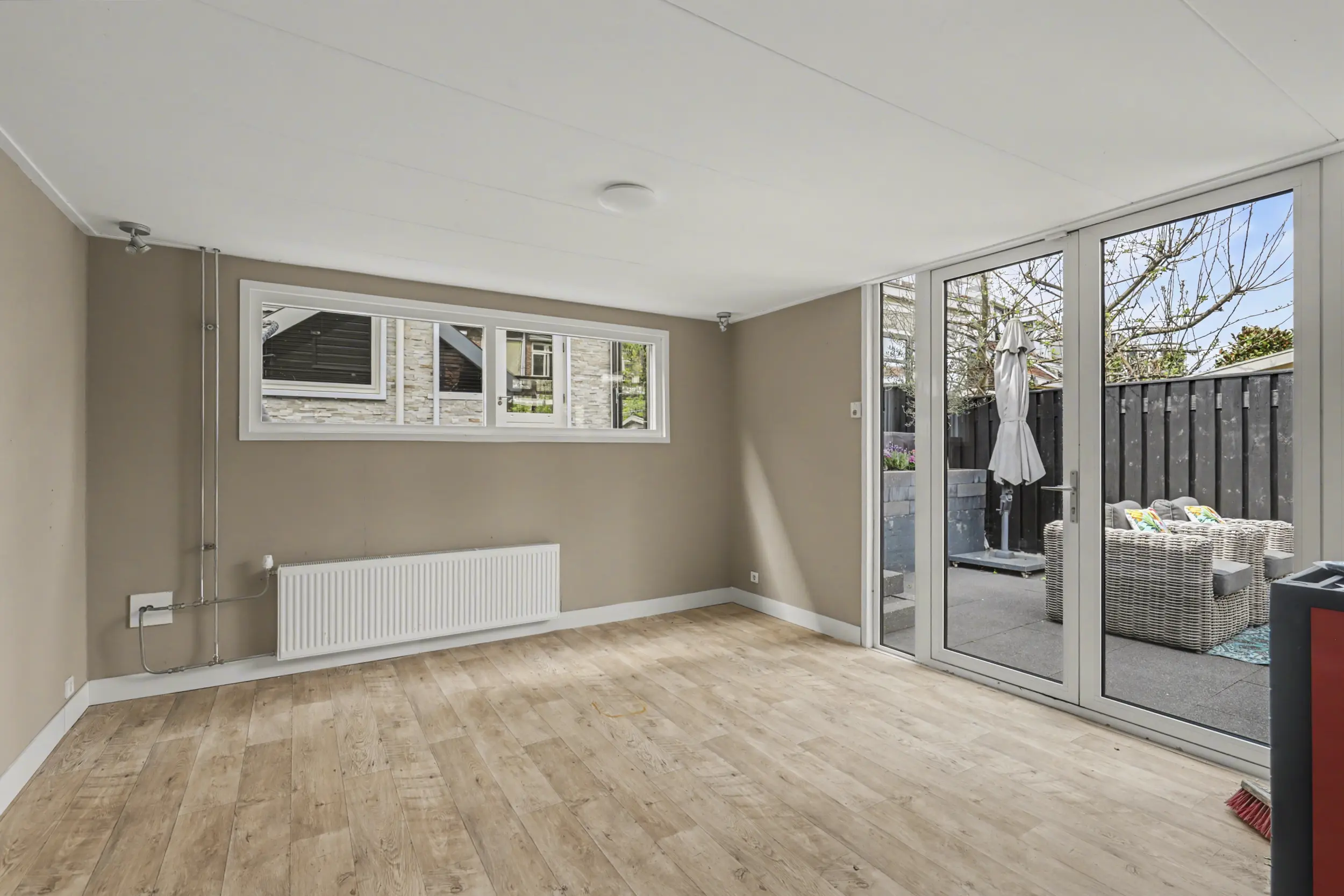 De woonkamer heeft toegang tot de achtergelegen tuin waar een zeer fraaie bergruimte annex kantoorruimte is gerealiseerd (verwarmd) met bovengelegen bergruimte.