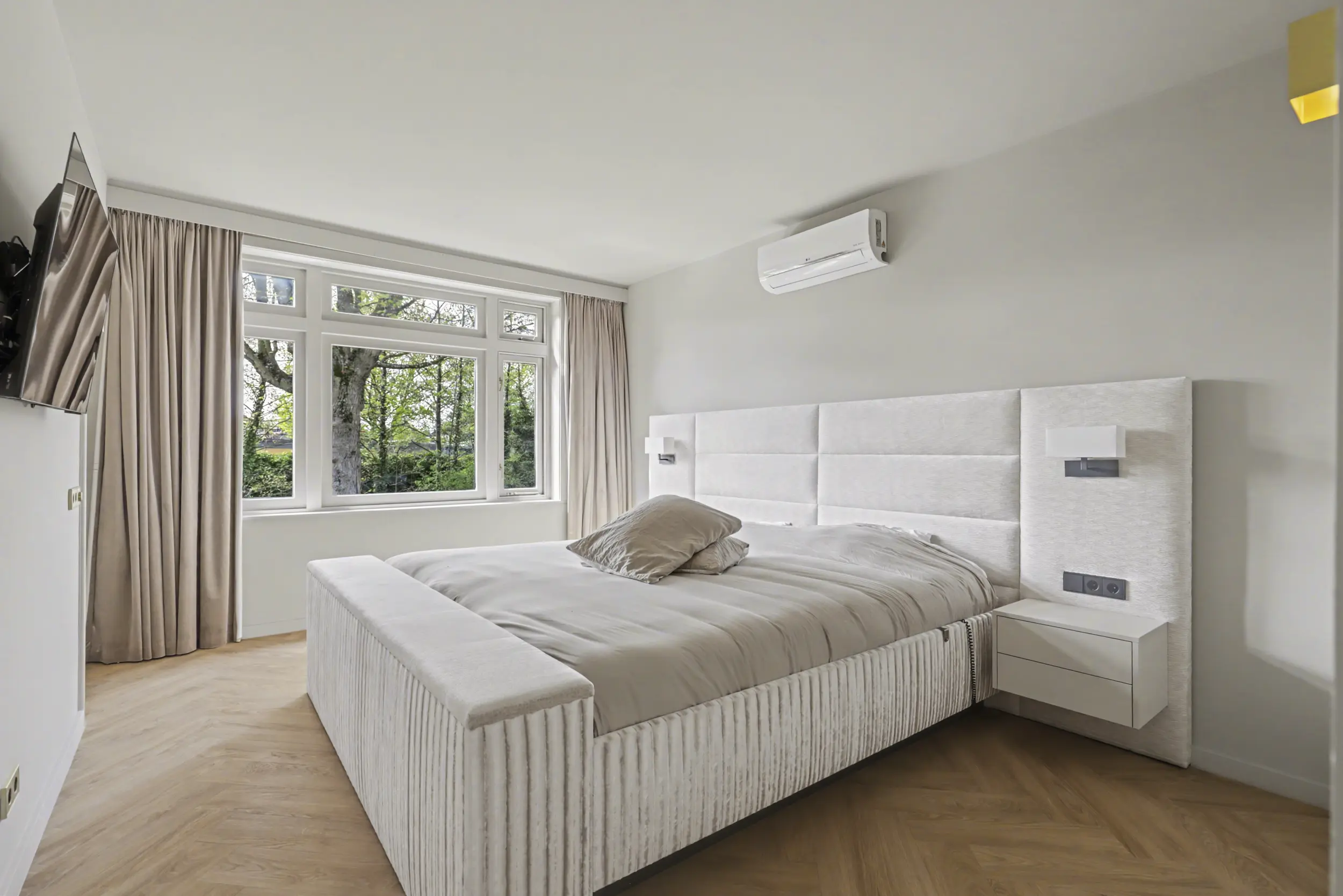 Via de vast trap komen we uit op de slaapverdieping waar een zeer ruime slaapkamer met inloop kleding(kasten(kamer is gerealiseerd met en suite de zeer fraaie en luxe badkamer.