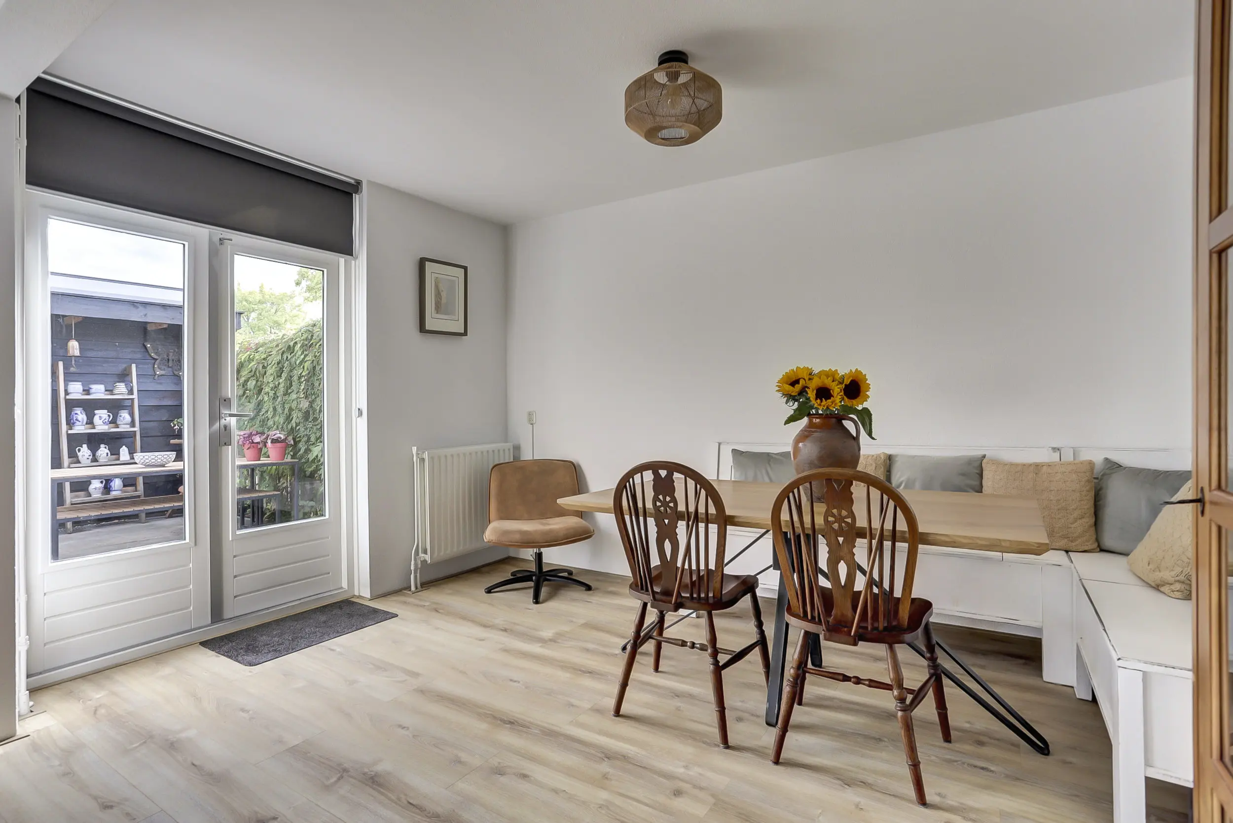Wat een heerlijke leefruimte! De sfeervolle, tuingerichte woonkamer is royaal van opzet en keurig afgewerkt met een mooie laminaatvloer, spachtelputzwanden en een plafond met spuitwerk. Dankzij de openslaande deuren staat u zó in de zonnige achtertuin.