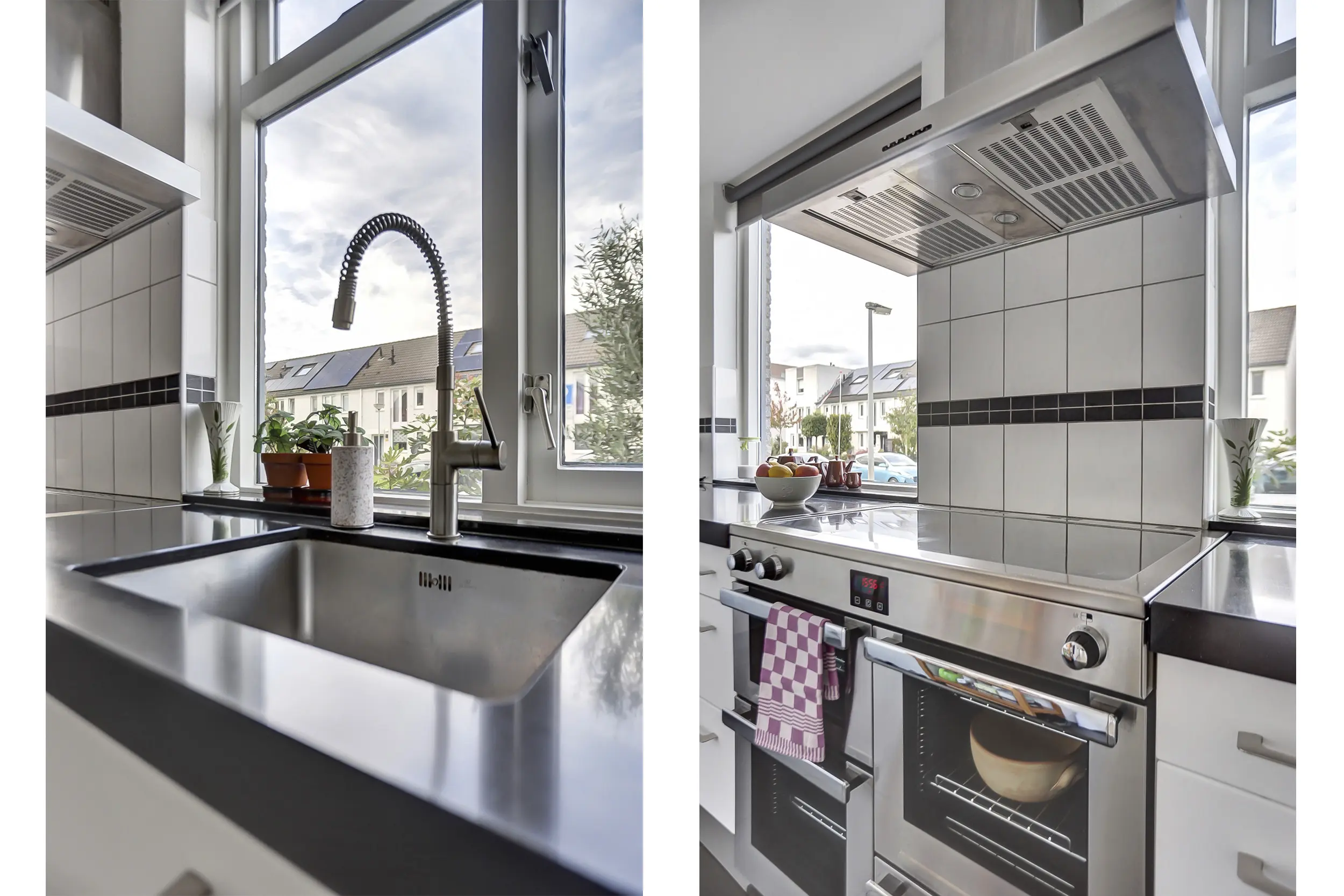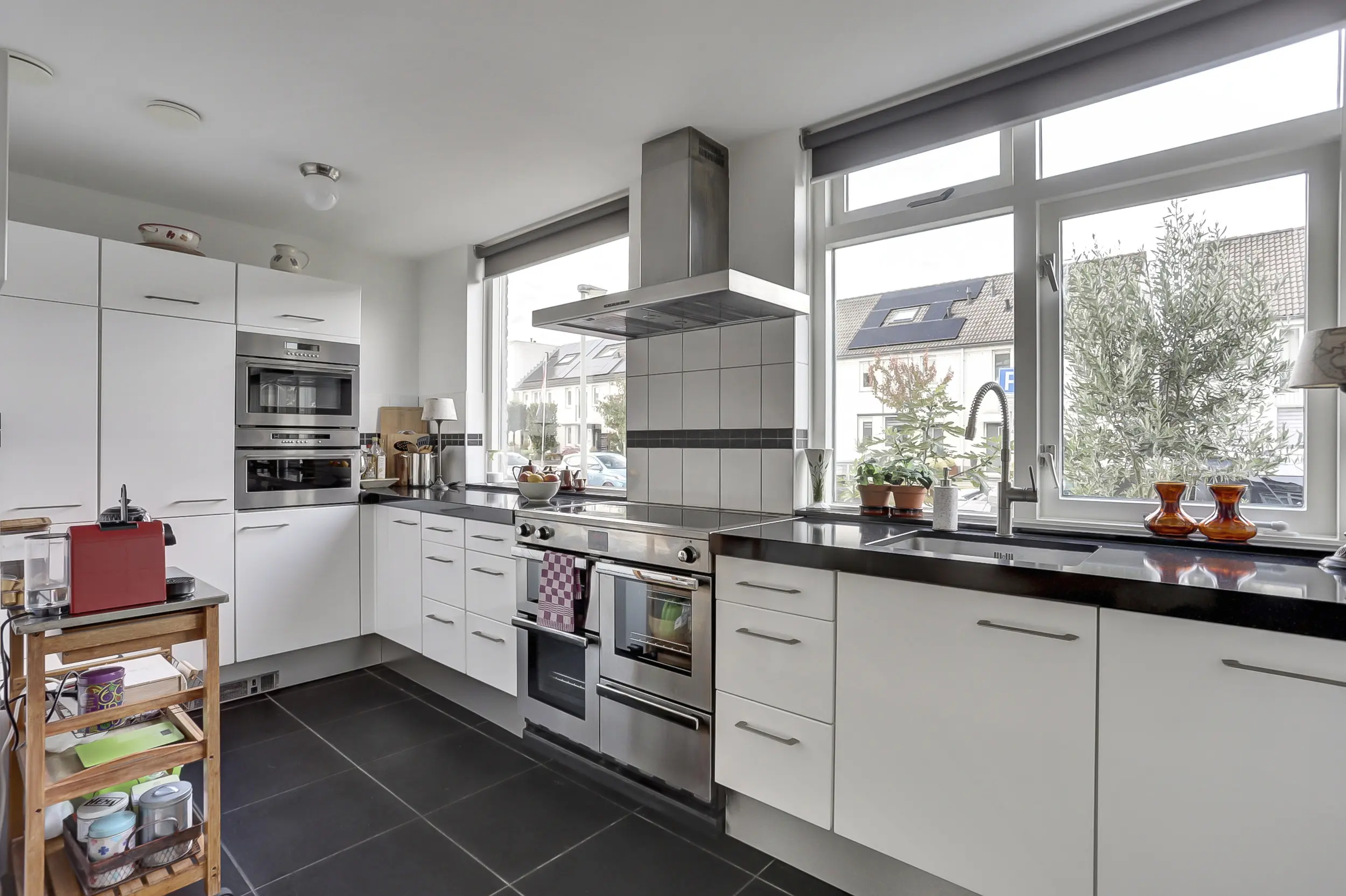 Aan de voorzijde van de woning vindt u de moderne keuken in hoekopstelling. De keuken is van alle gemakken voorzien: een groot inductiefornuis met 3 ovens en warmhoudlade, een stijlvolle RVS-afzuigkap, een vaatwasser, combi-magnetron en een stoomoven. Het natuurstenen werkblad en de royale kastruimte maken het geheel helemaal af.