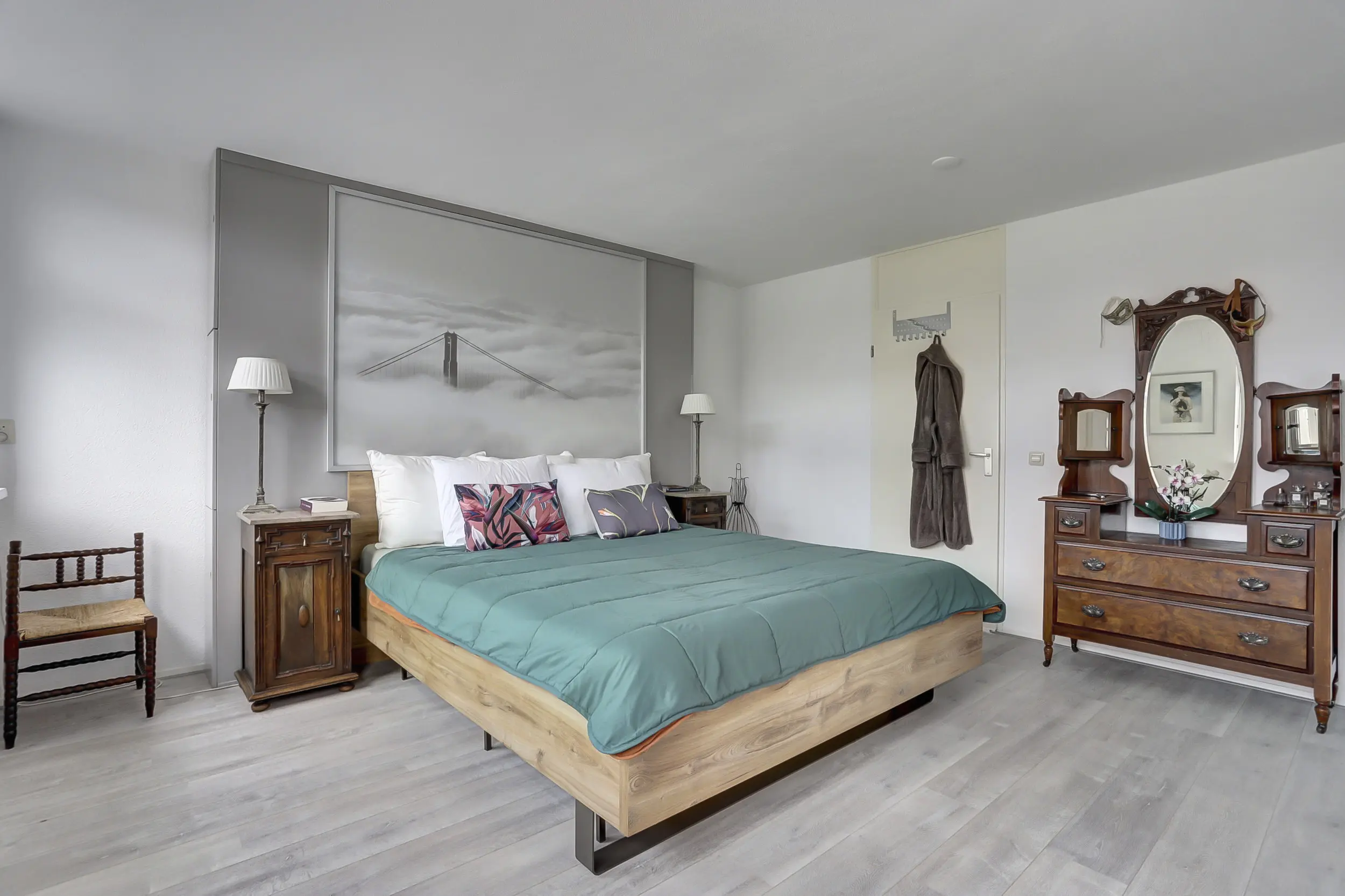 De slaapkamer aan de achterzijde is eveneens ruim én heeft een eigen wastafel met spiegel. Beide kamers zijn netjes afgewerkt met een laminaatvloer.