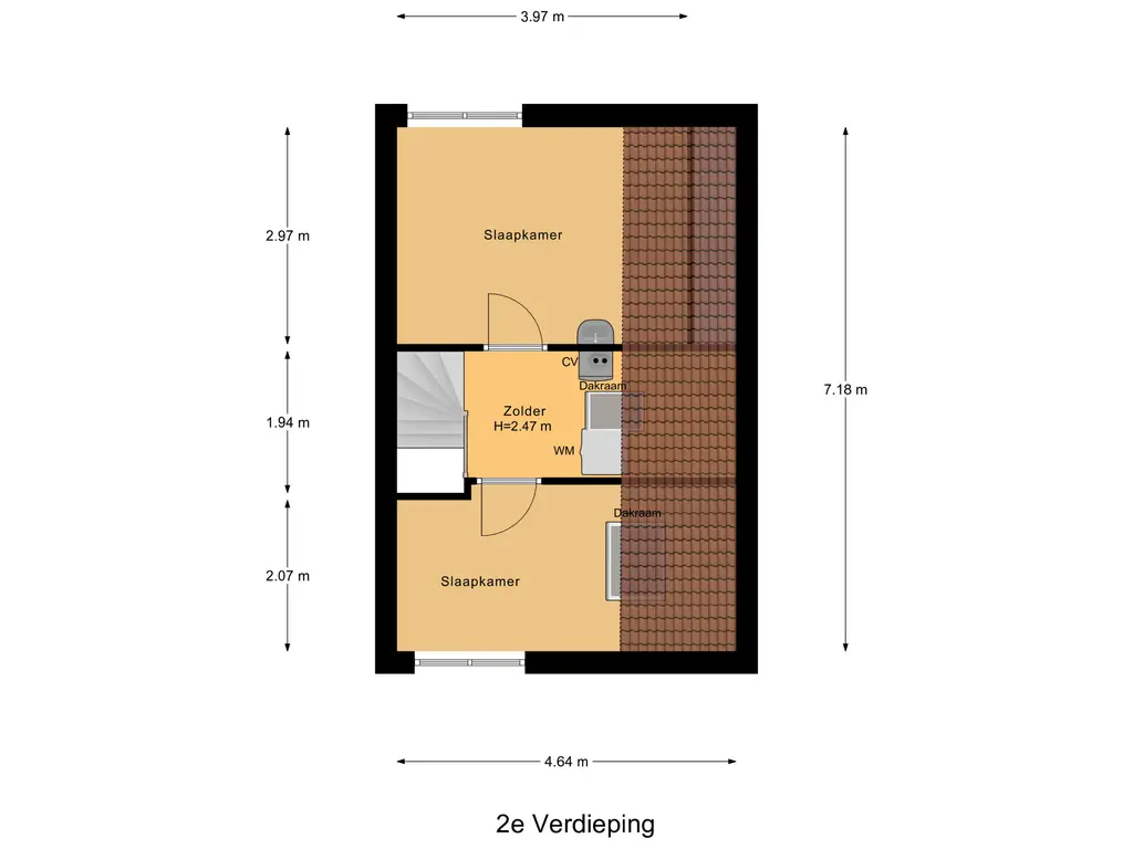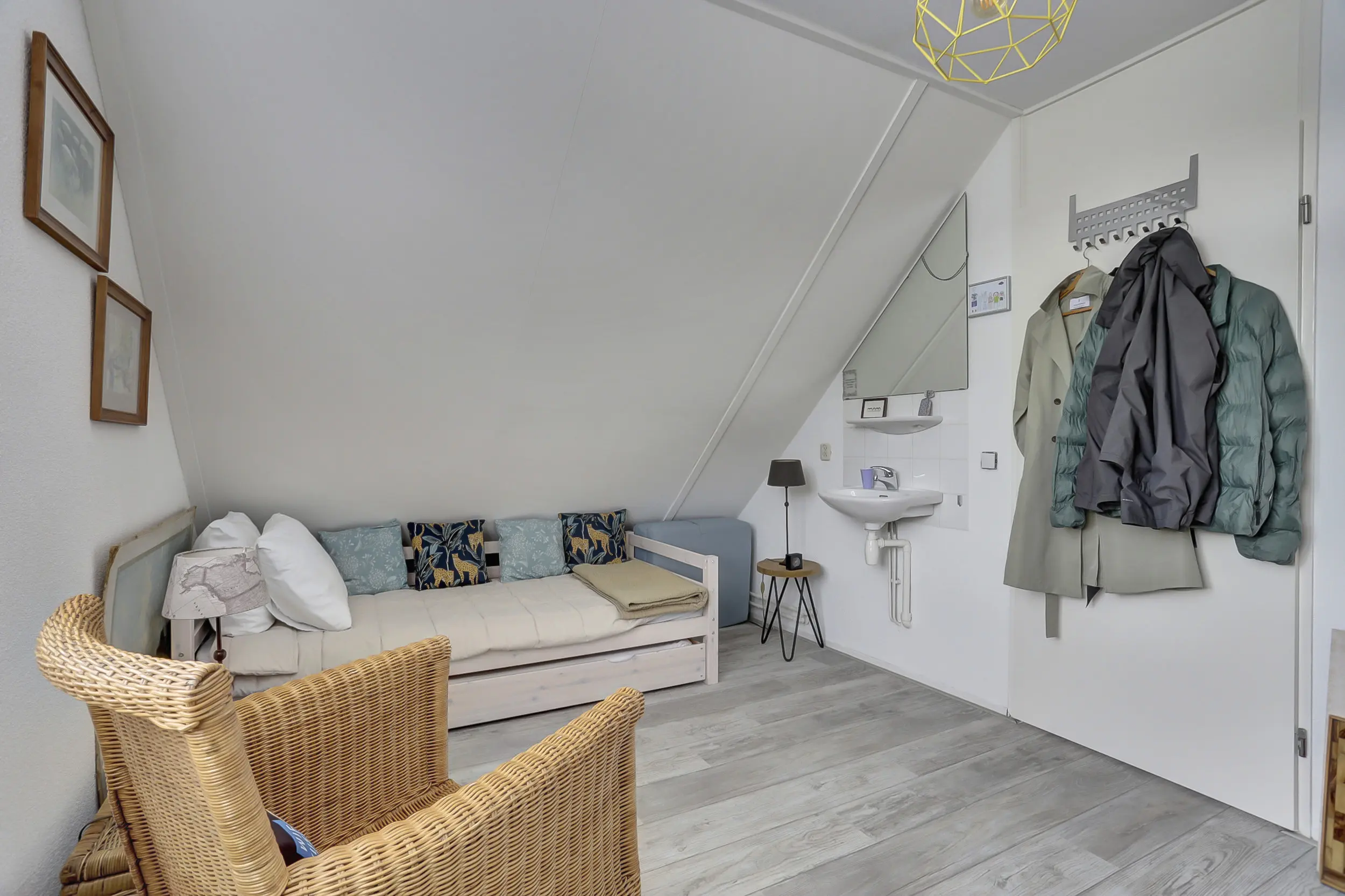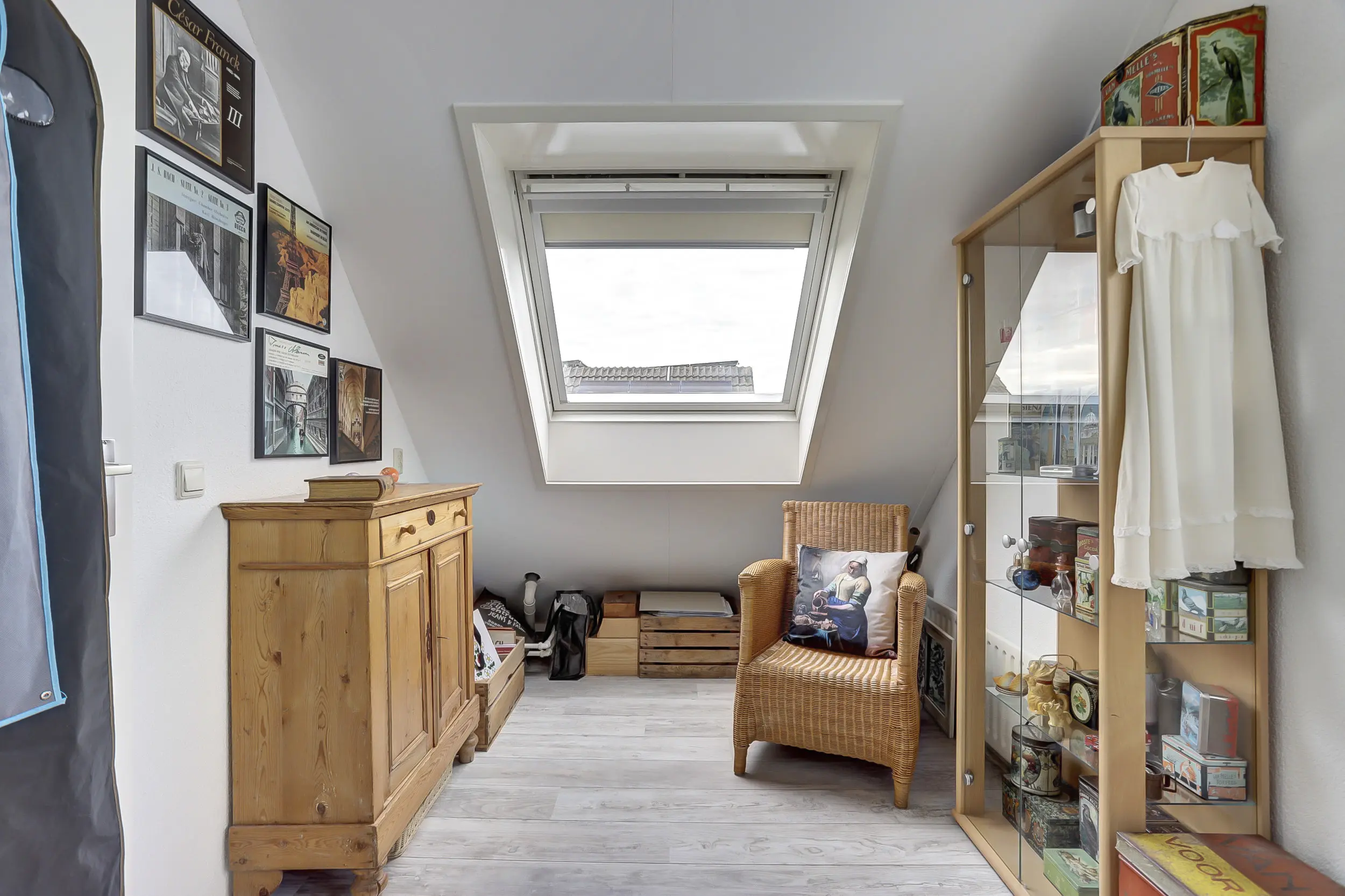 De slaapkamer aan de voorzijde is netjes van formaat en beschikt over een extra dakraam voor nog meer lichtinval.