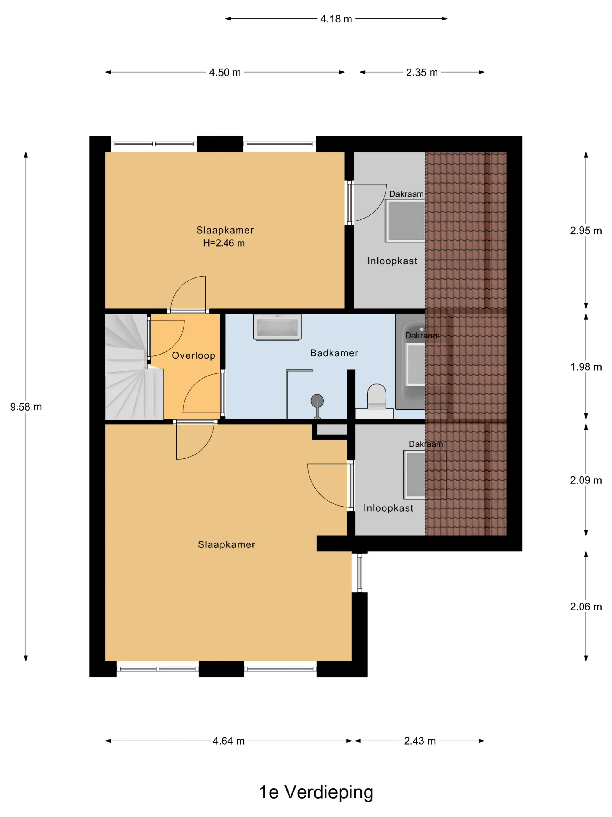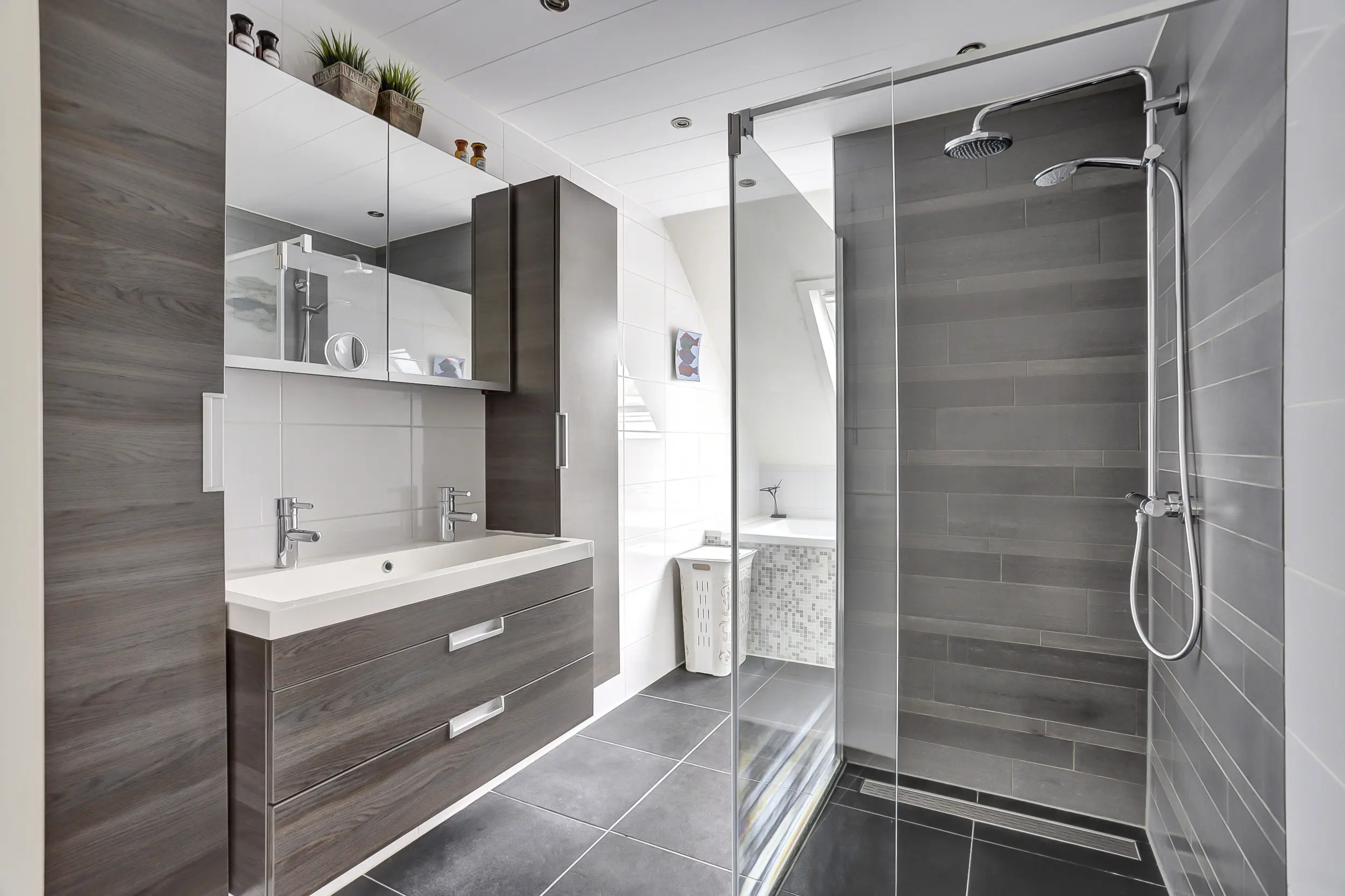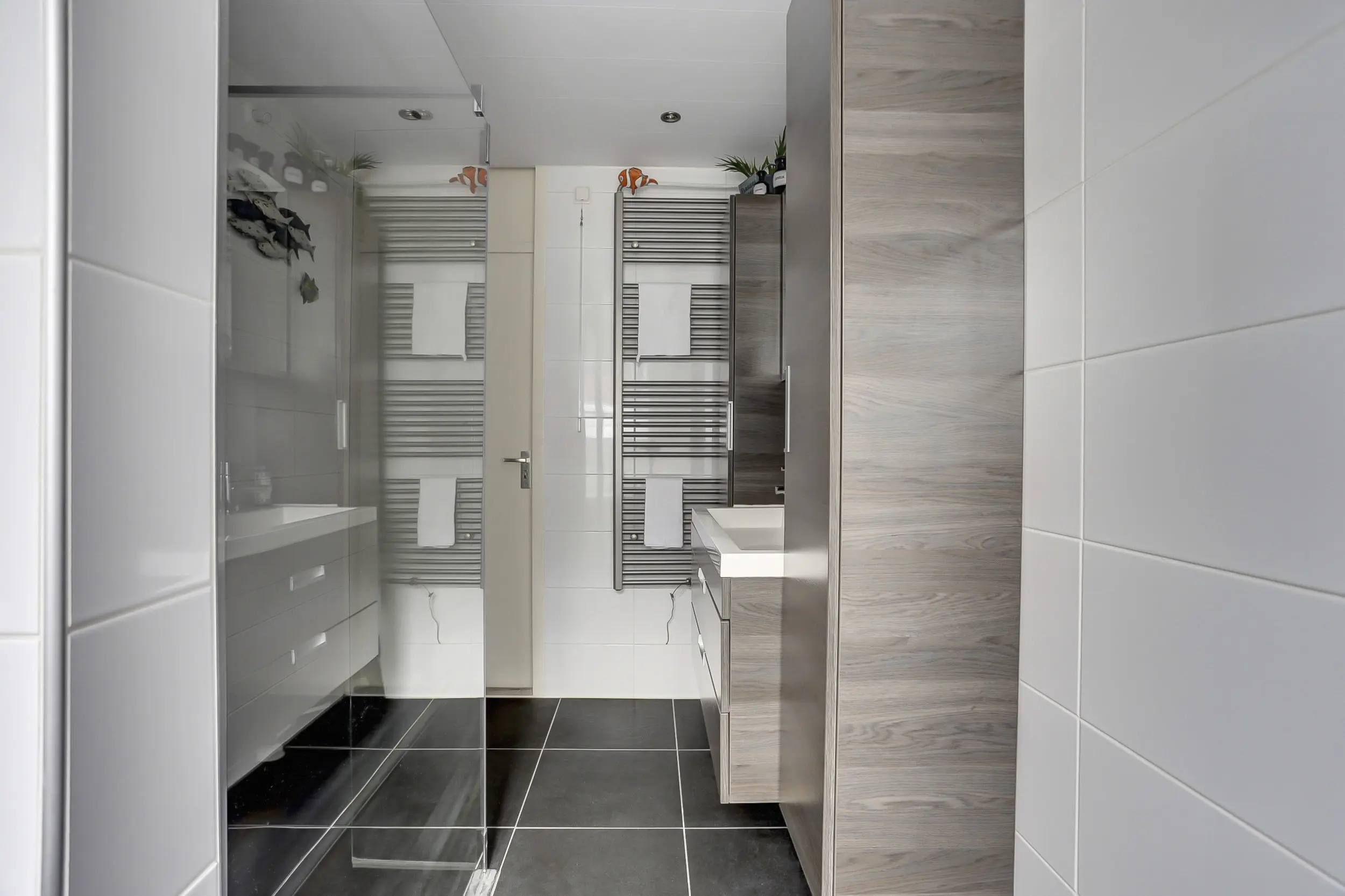De badkamer is modern, geheel betegeld en luxe uitgevoerd. U treft hier een ligbad, een wandcloset, een royale inloopdouche met zowel stort- als handdouche én een stijlvol badmeubel met één grote spoelbak, dubbele kasten, onderladen en spiegelkast. Natuurlijk ontbreekt ook het dakraam niet voor extra licht en ventilatie. Een designradiator maakt het geheel compleet.