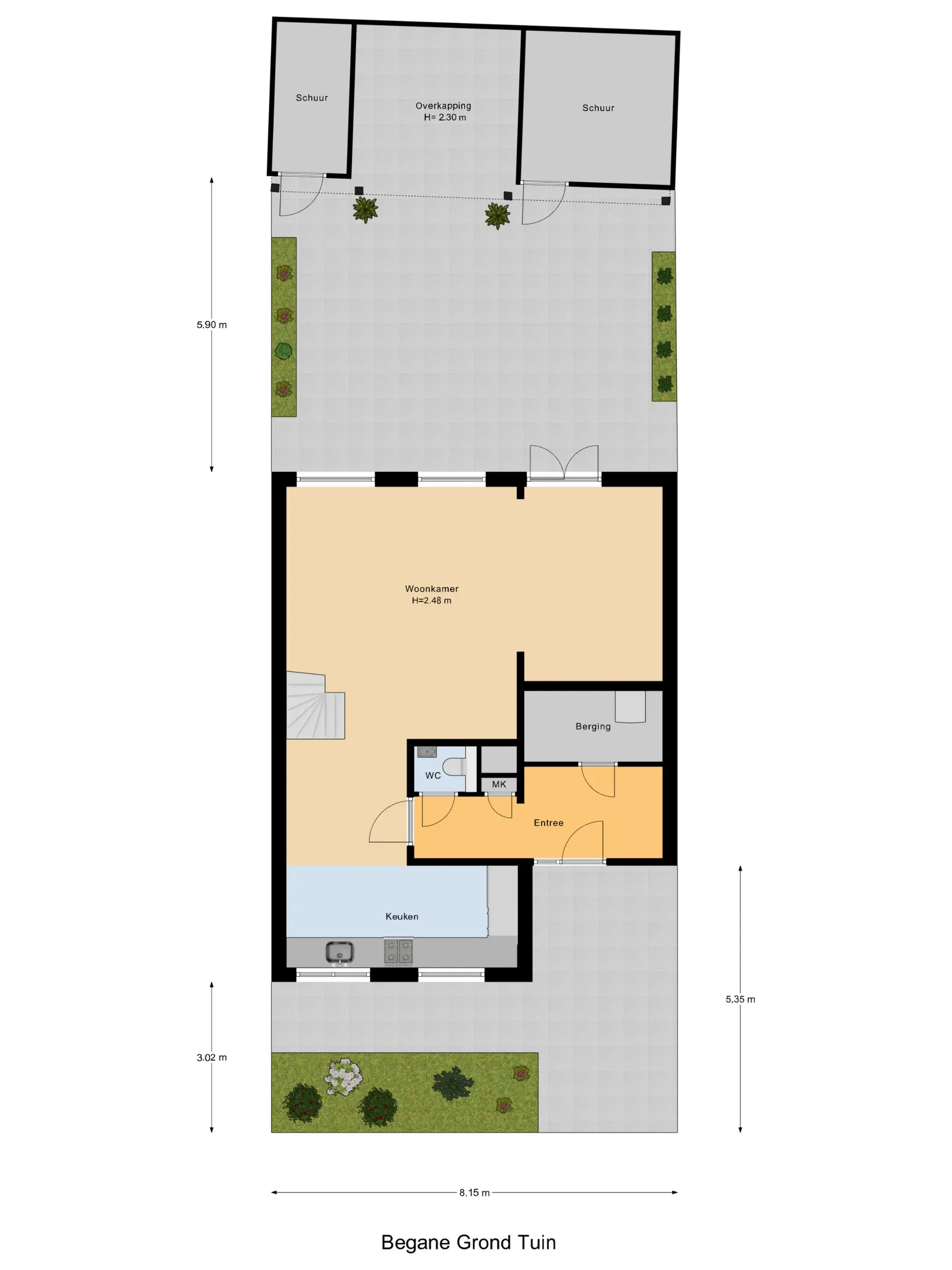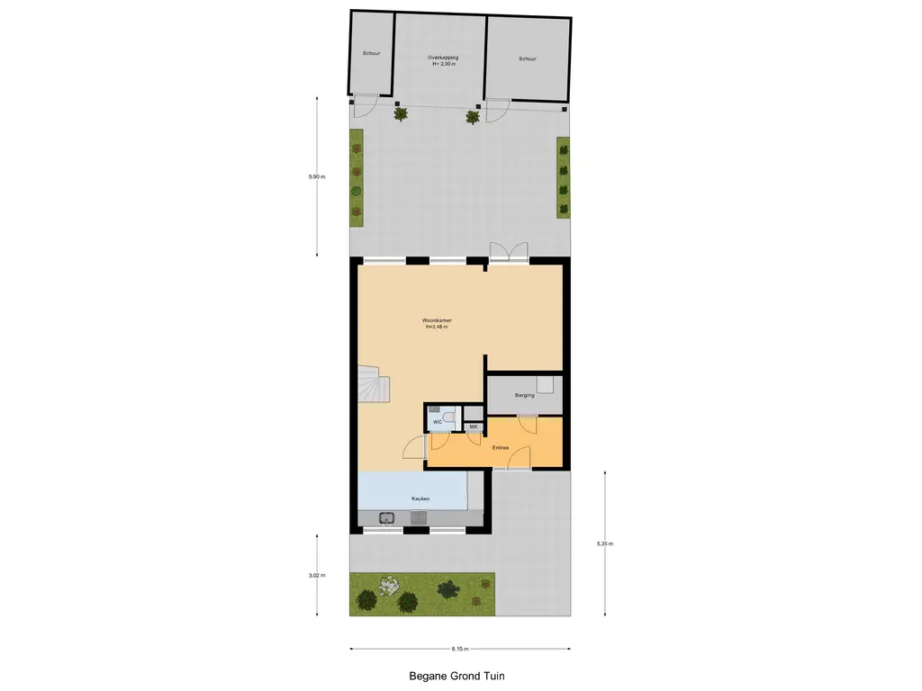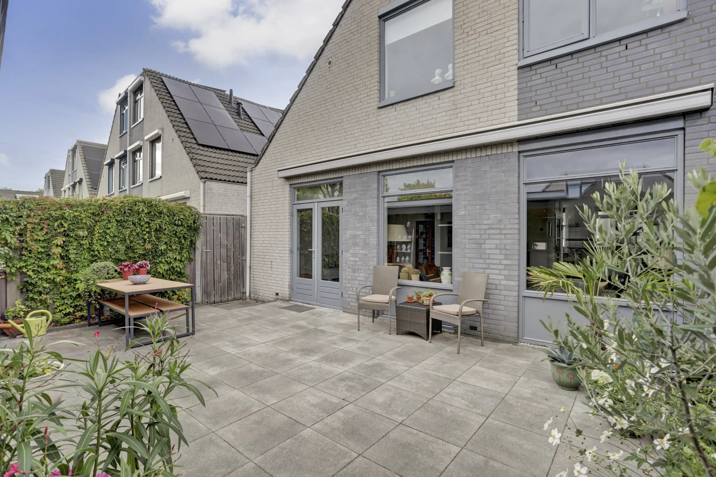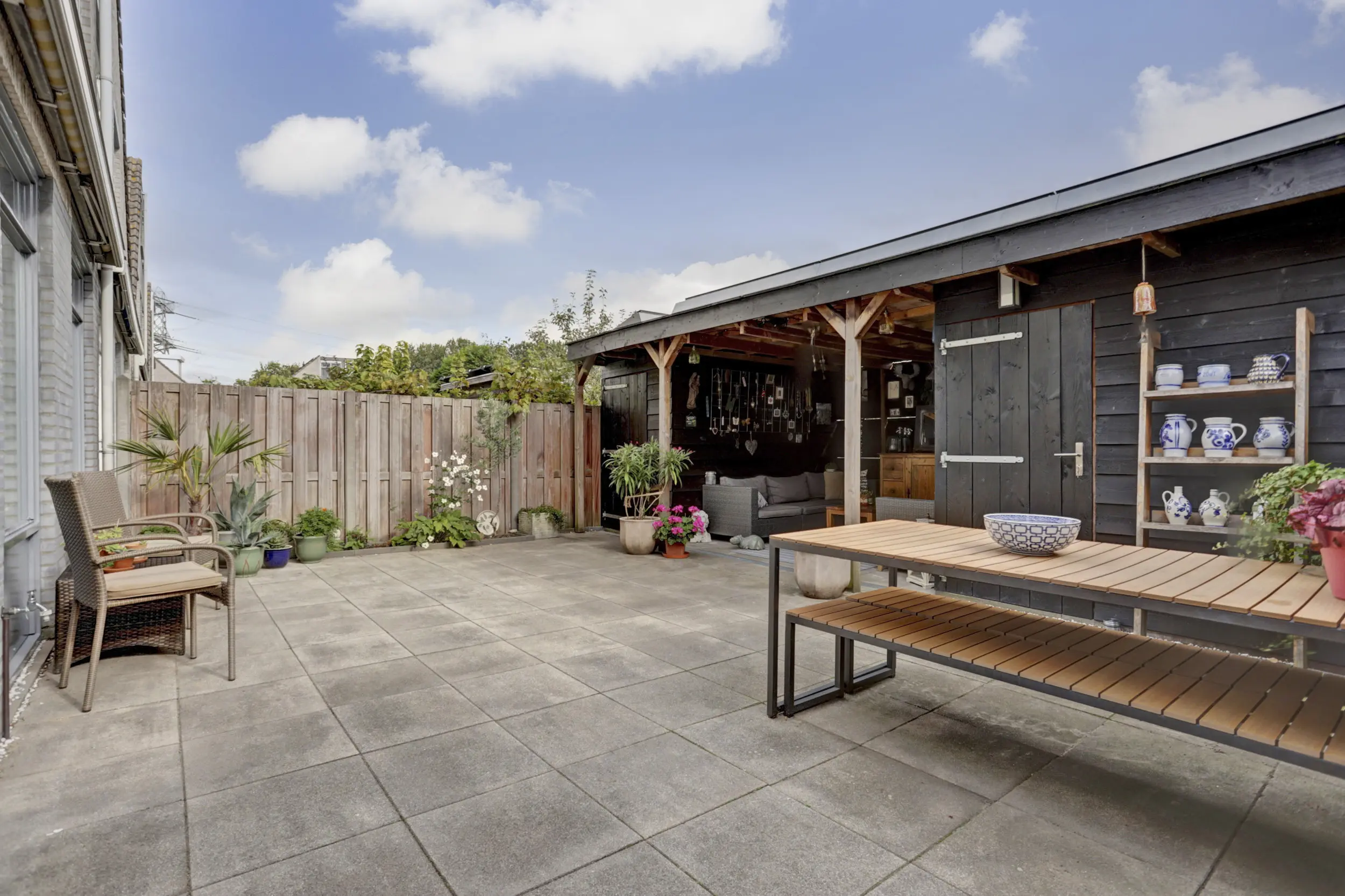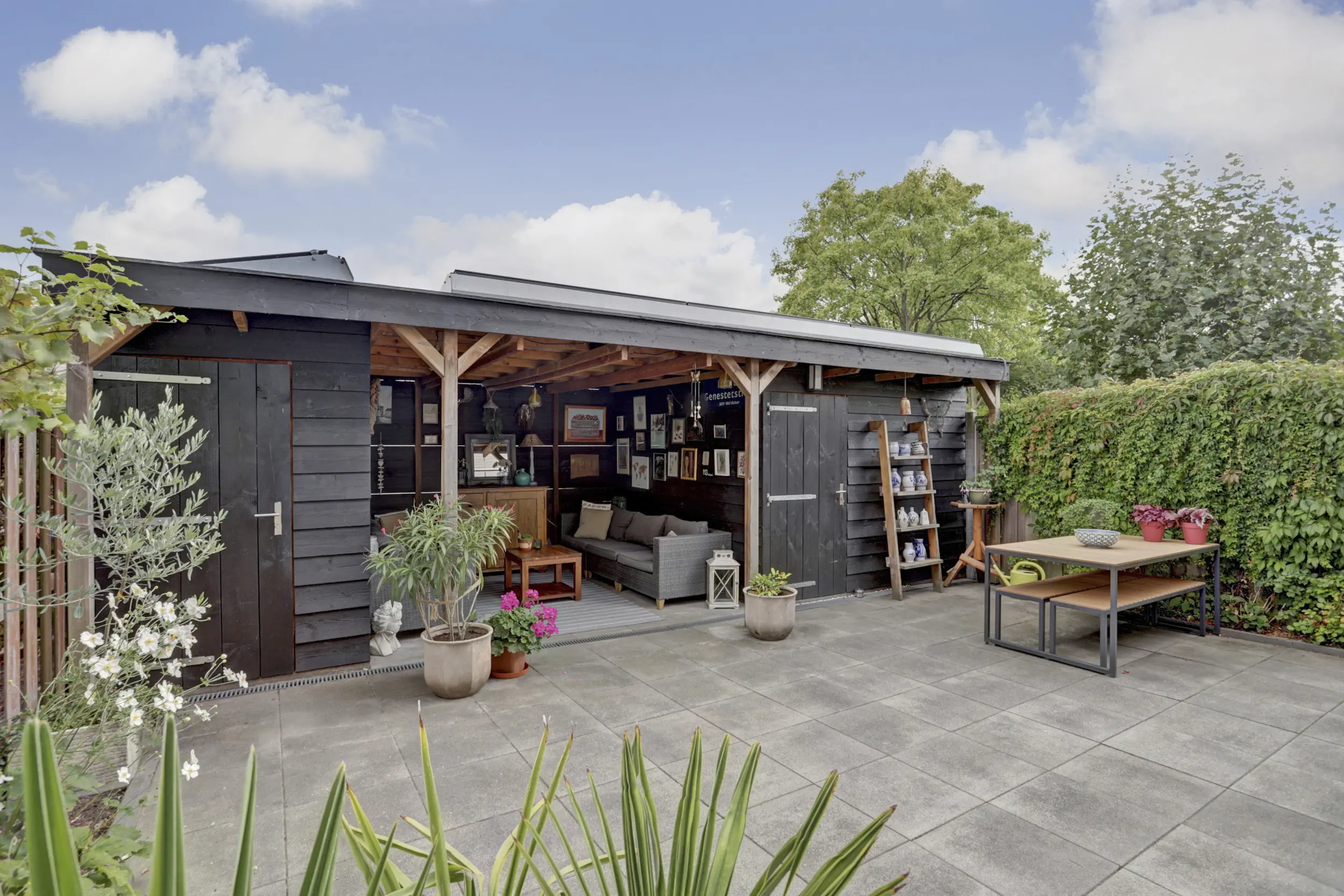 De achtertuin ligt gunstig op het zuiden en is sfeervol ingericht met terrastegels en vaste beplanting. Achterin de tuin bevindt zich een ruime overkapping met aan beide zijden een berging – perfect voor fietsen, tuingereedschap of hobbyruimte. De tuin beschikt over elektra, verlichting én een achterom via een poort naar de brandgang.