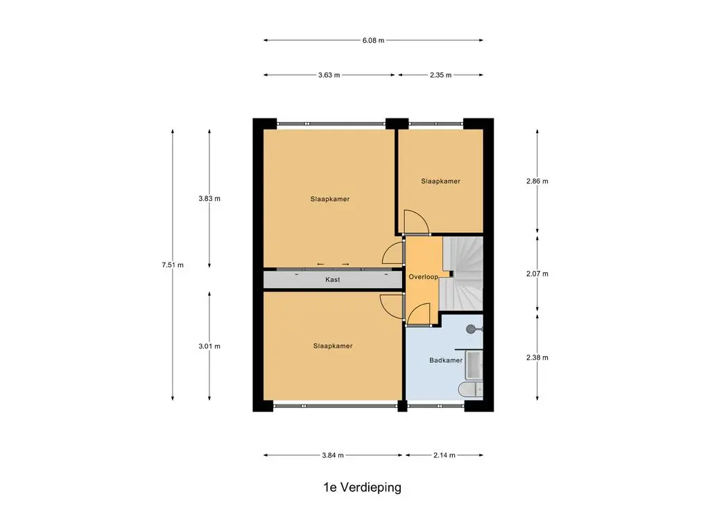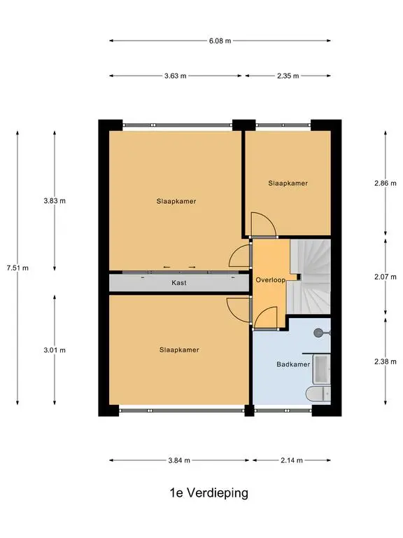 De centrale overloop geeft toegang tot alle slaapkamers, de badkamer en de trapopgang naar de verdieping.