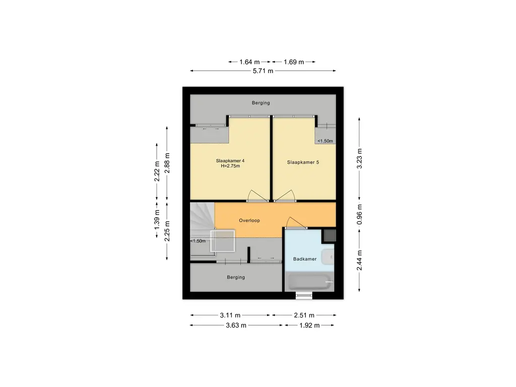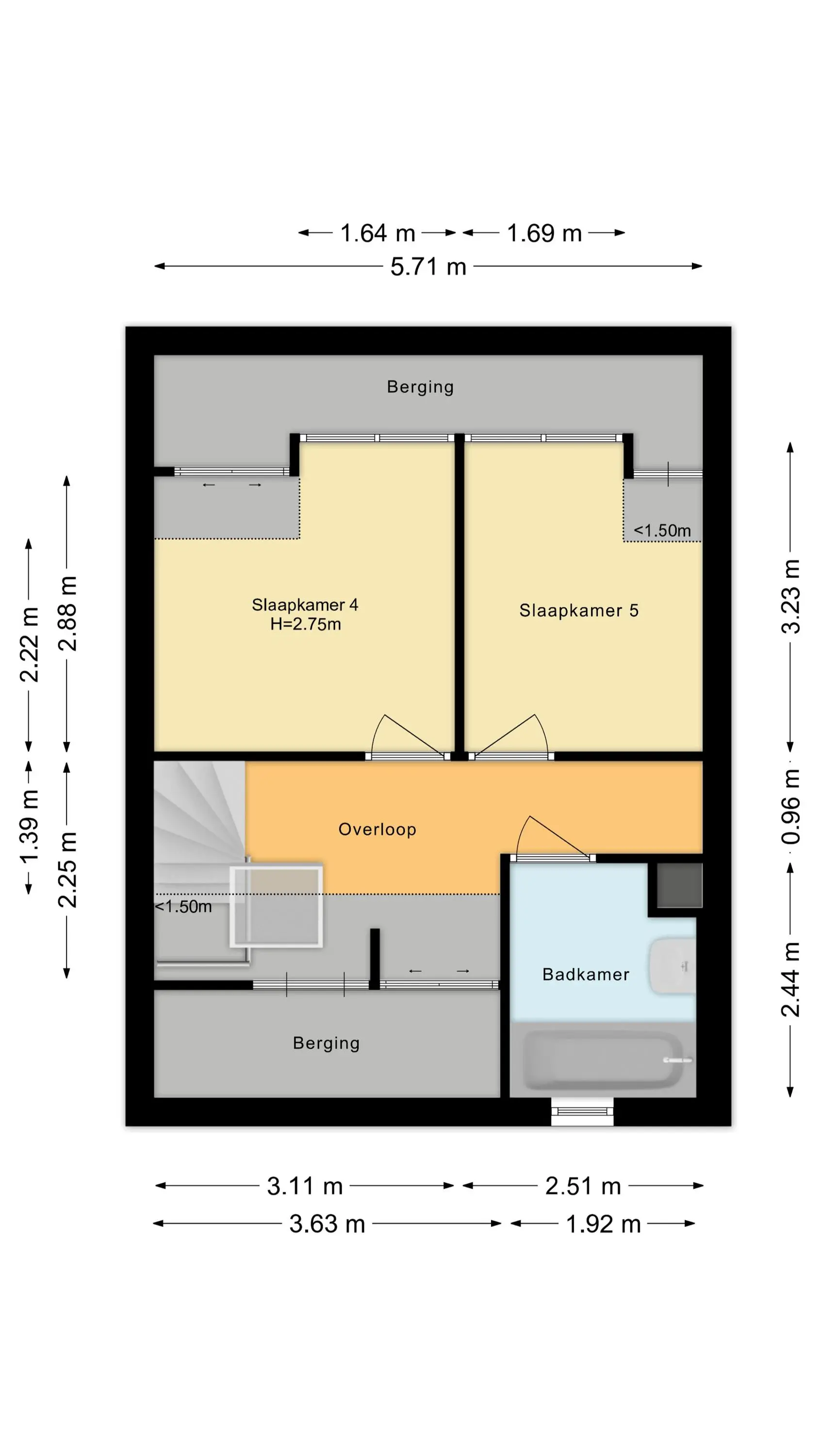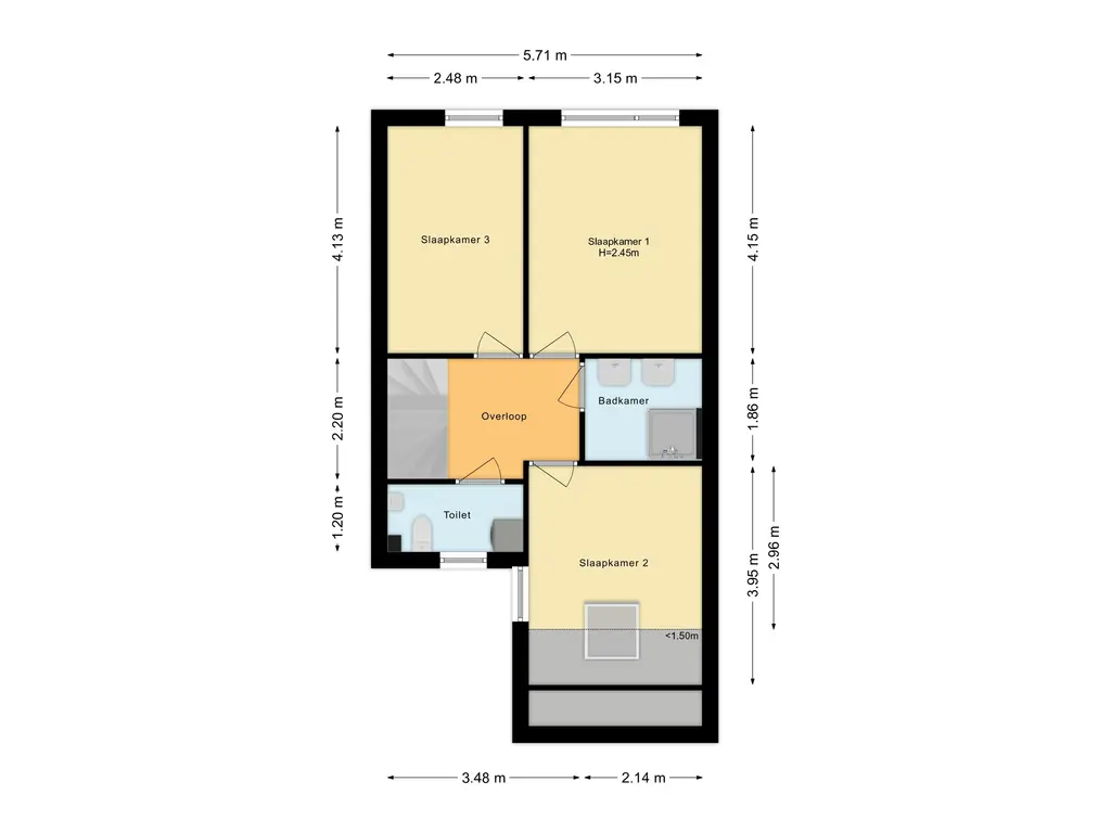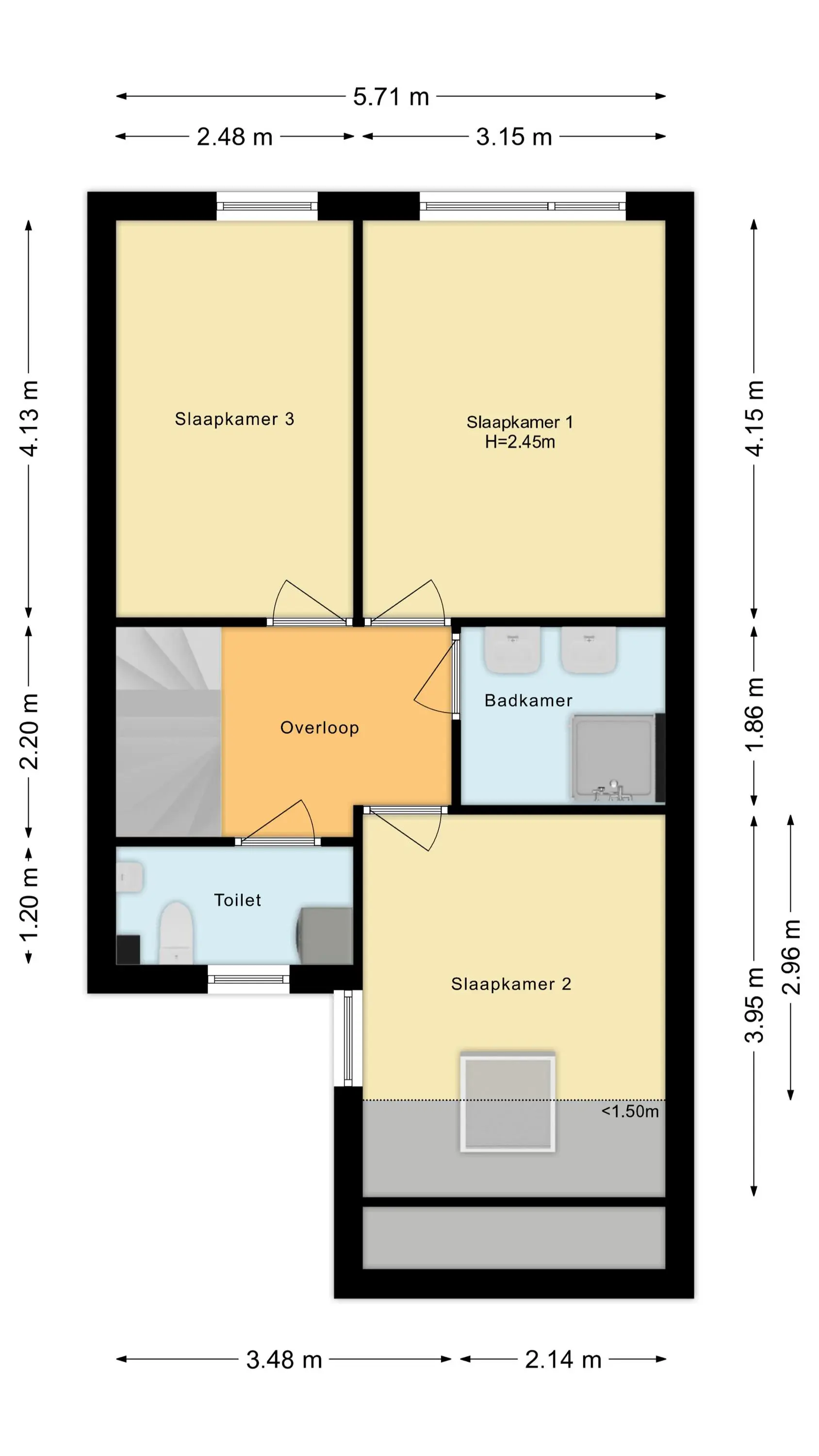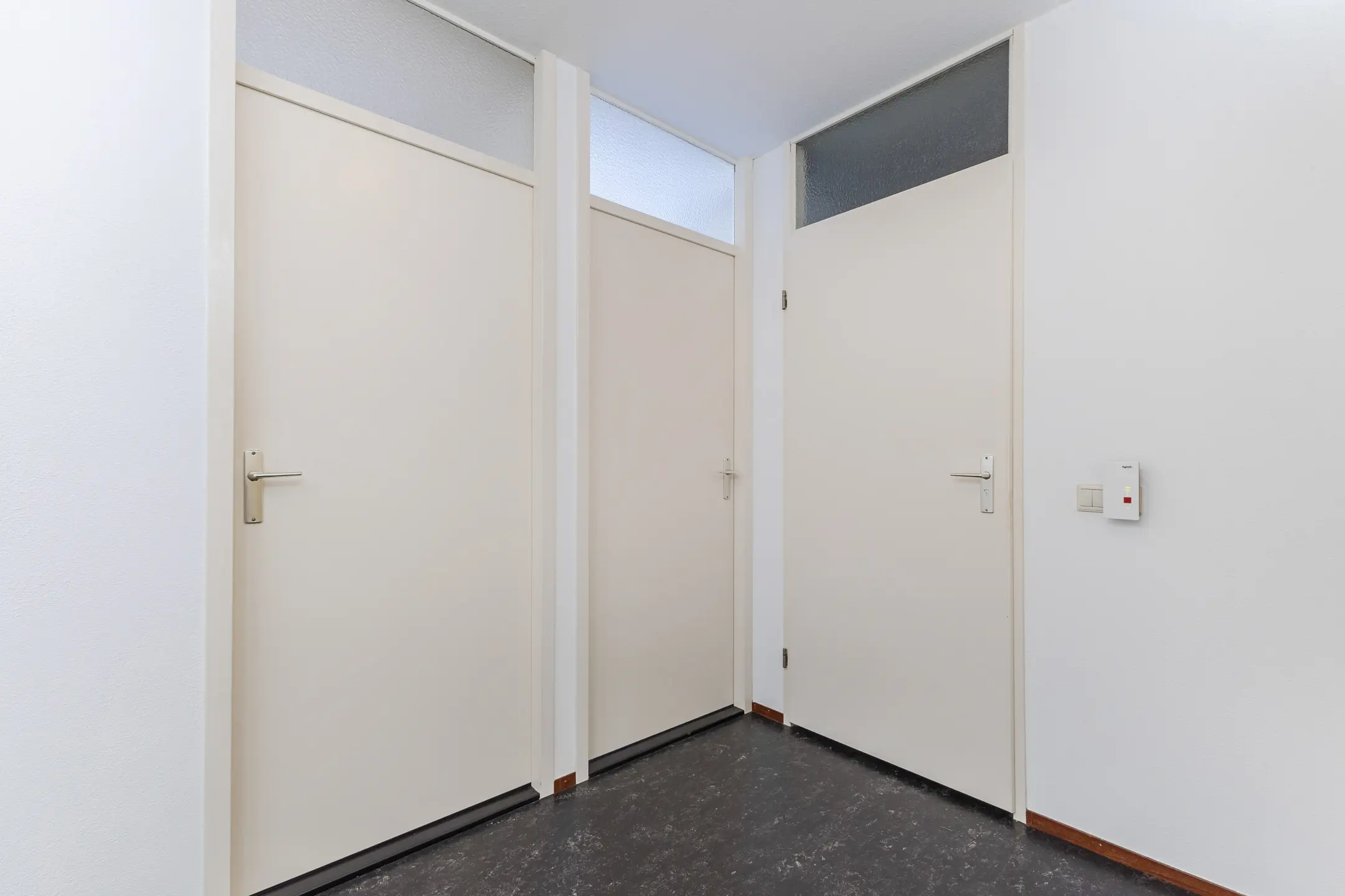 Op de eerste verdieping treft u een ruime overloop die toegang geeft tot drie slaapkamers en de badkamer. De kamers zijn praktisch ingedeeld en geschikt als slaap-, werk- of kinderkamer. De badkamer op deze verdieping is netjes en voorzien van een douchecabine, dubbele wastafel met grote spiegel en een designradiator. Mechanische ventilatie is in de ruimte aanwezig.