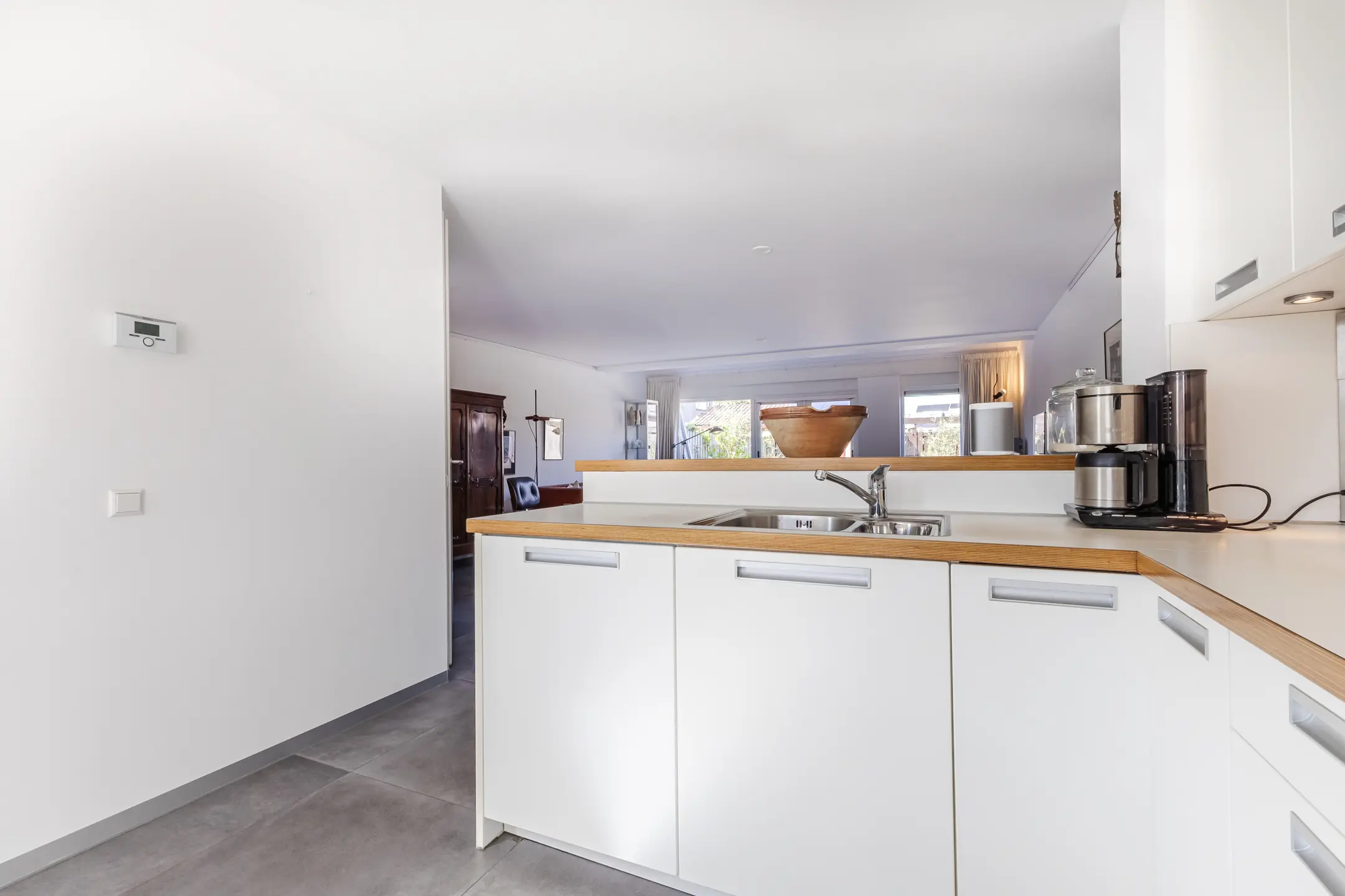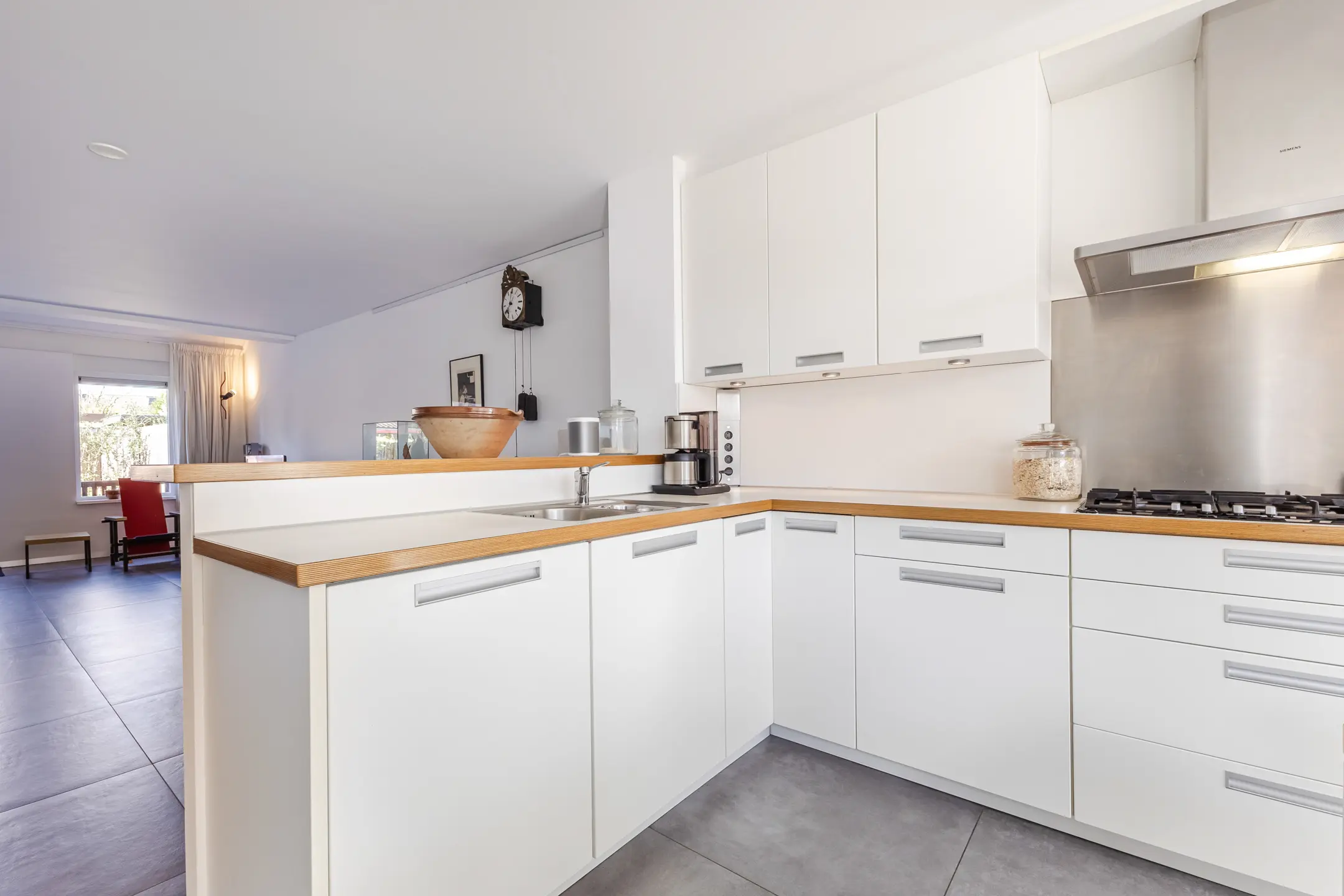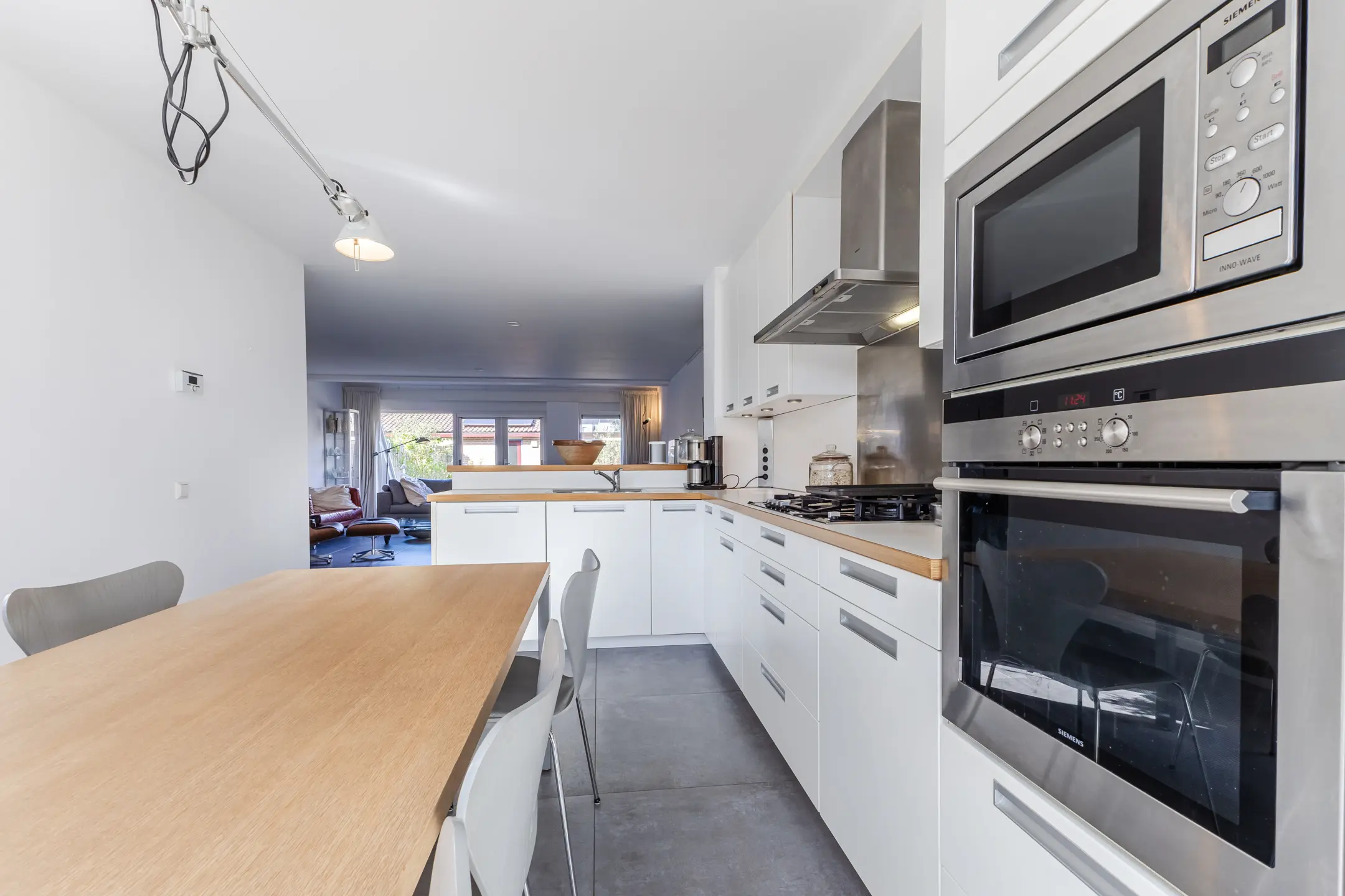 De keuken ligt aan de voorzijde en is uitgevoerd in een hoekopstelling met bargedeelte. Als inbouwapparatuur is aanwezig een combi-oven, koel-/vriescombinatie, vaatwasser en een 5-pits gasfornuis met RVS afzuigkap. Verder is er veel kastruimte aanwezig.Een fijne plek waar je gezellig kunt koken en tegelijk contact houdt met de visite.