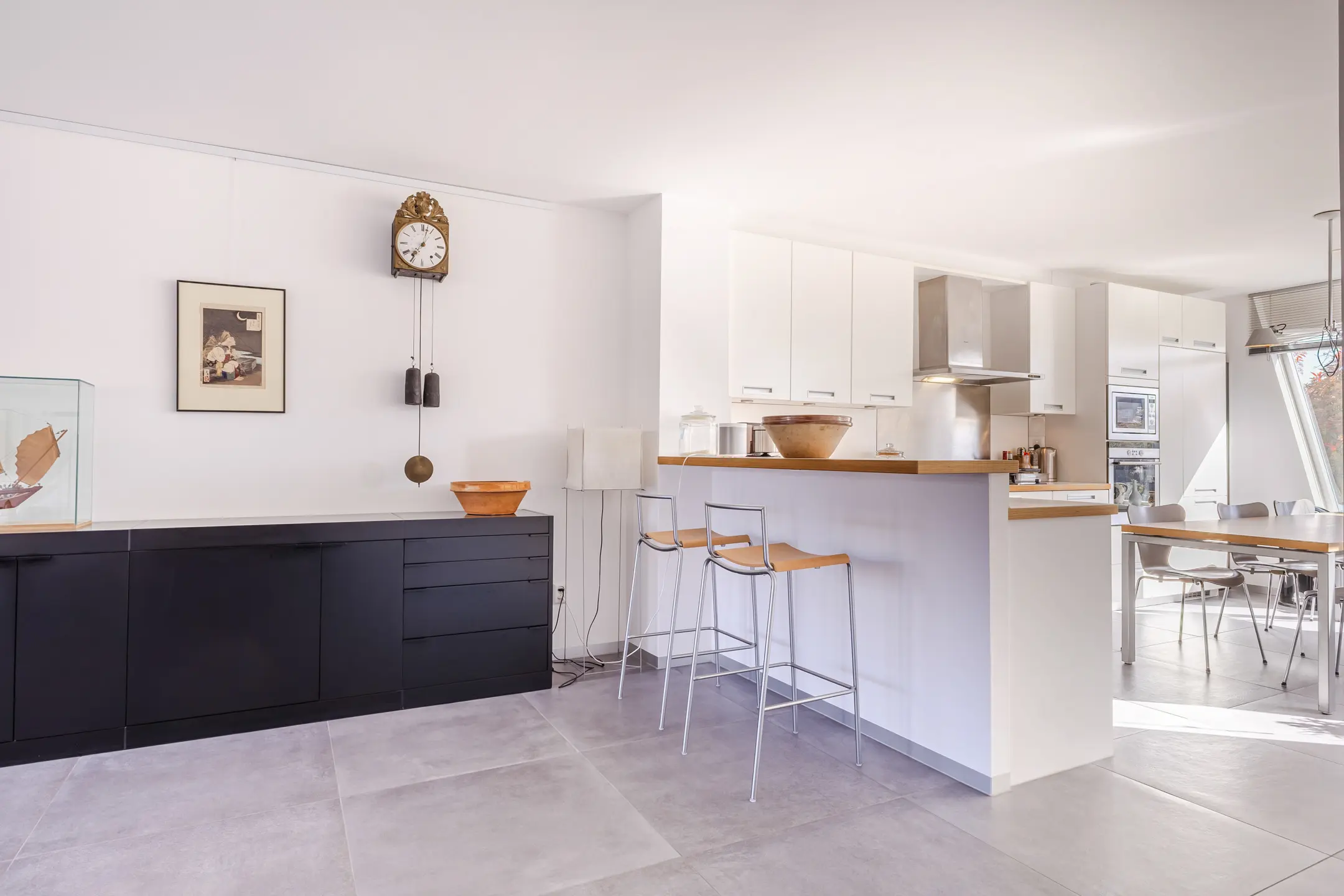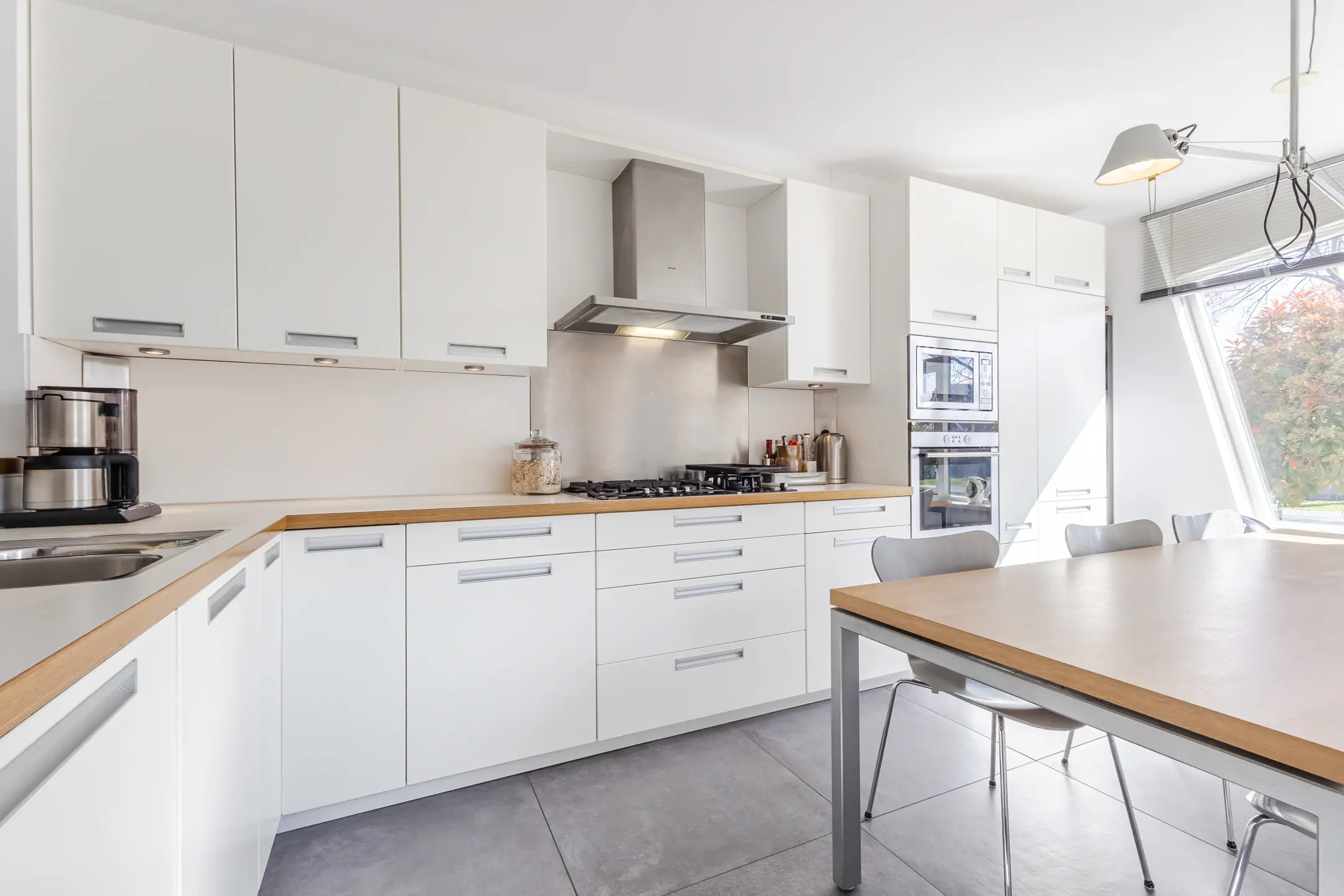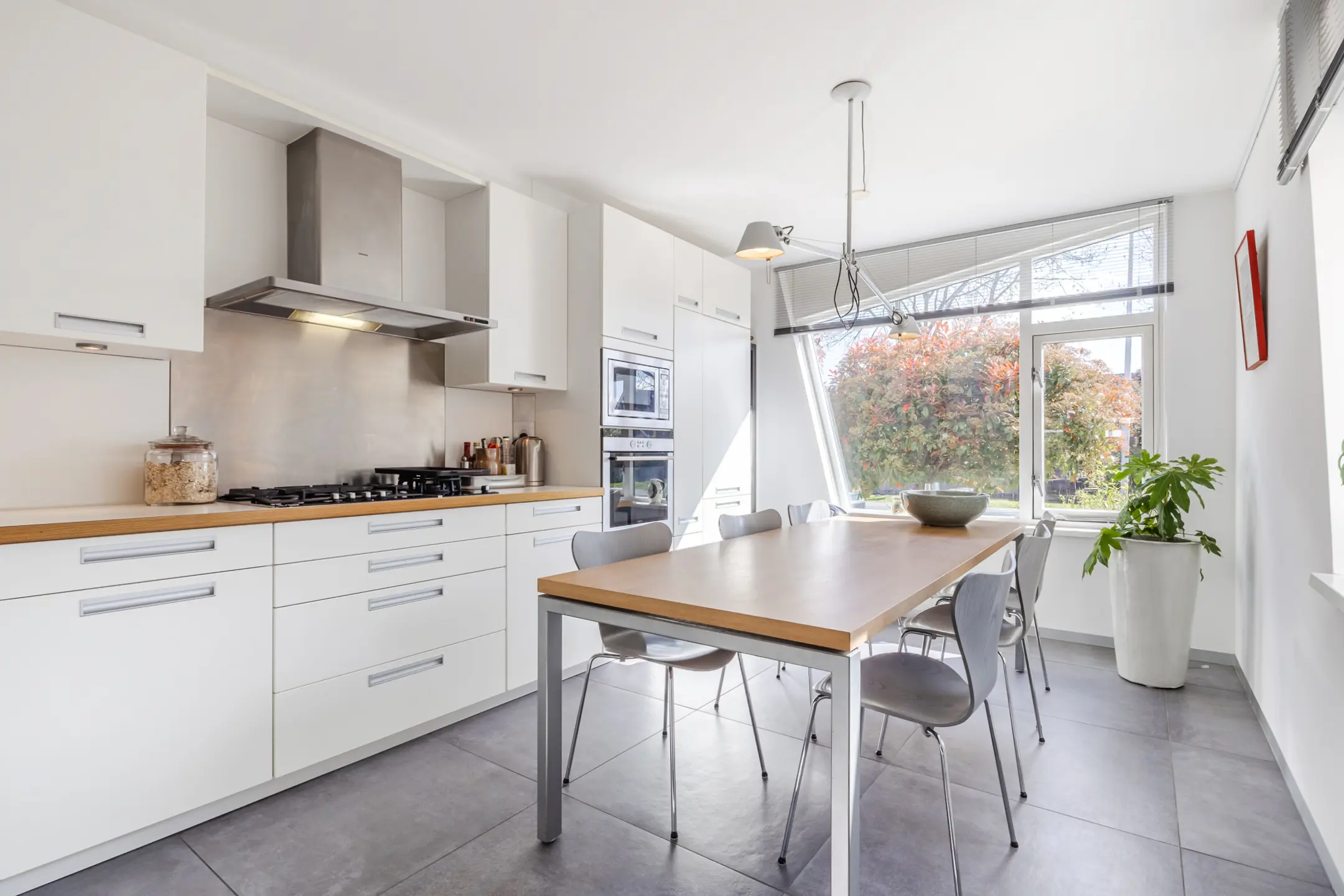 De keuken ligt aan de voorzijde en is uitgevoerd in een hoekopstelling met bargedeelte. Als inbouwapparatuur is aanwezig een combi-oven, koel-/vriescombinatie, vaatwasser en een 5-pits gasfornuis met RVS afzuigkap. Verder is er veel kastruimte aanwezig.Een fijne plek waar je gezellig kunt koken en tegelijk contact houdt met de visite.