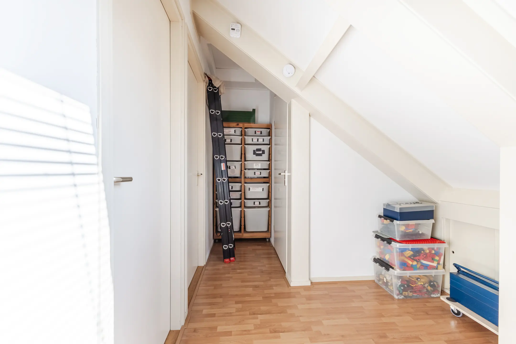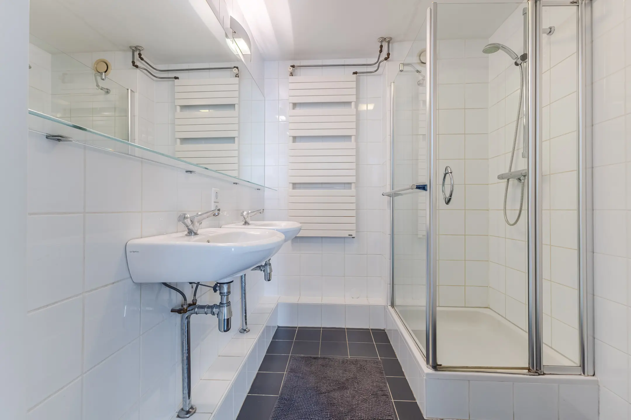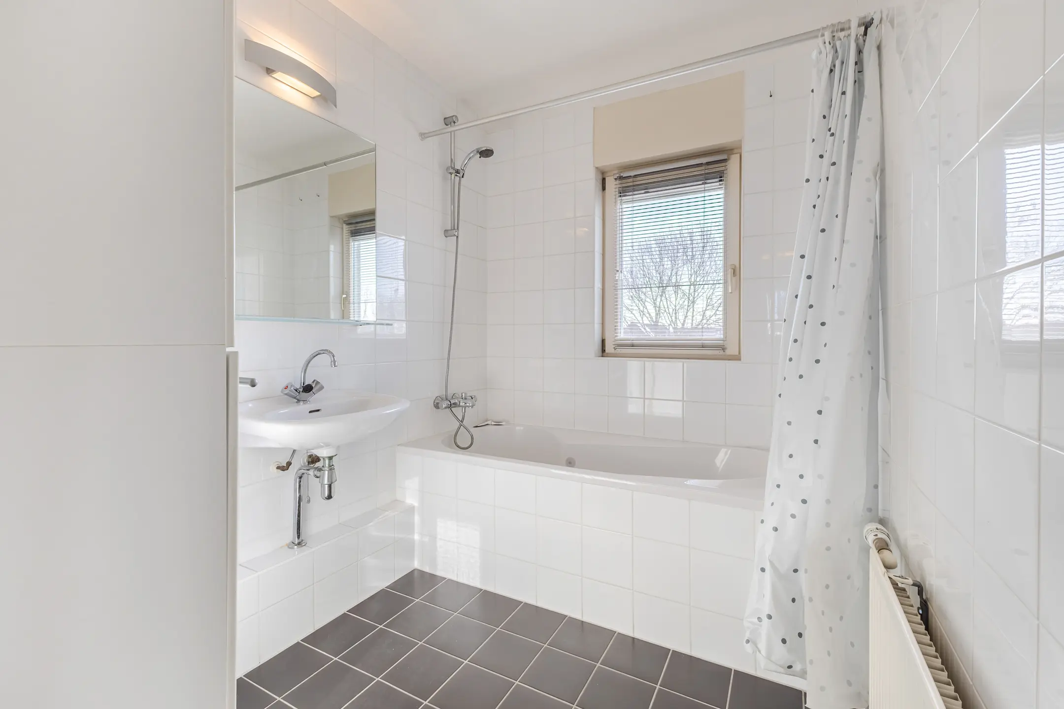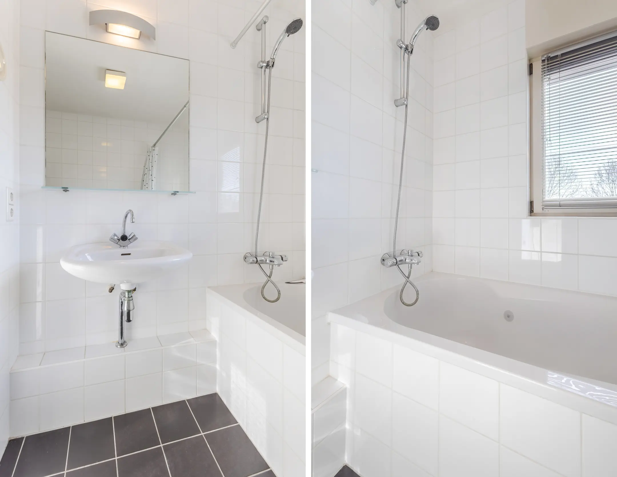 De tweede verdieping is echt een pluspunt: door het grote dakraam én de dakkapel is hier verrassend veel ruimte en licht ontstaan. Je vindt hier nog twee volwaardige slaapkamers én een tweede badkamer. Deze is volledig betegeld en voorzien van een ligbad, wastafel en spiegel. Ook de CV-combiketel (Vaillant 2015) is hier netjes weggewerkt.