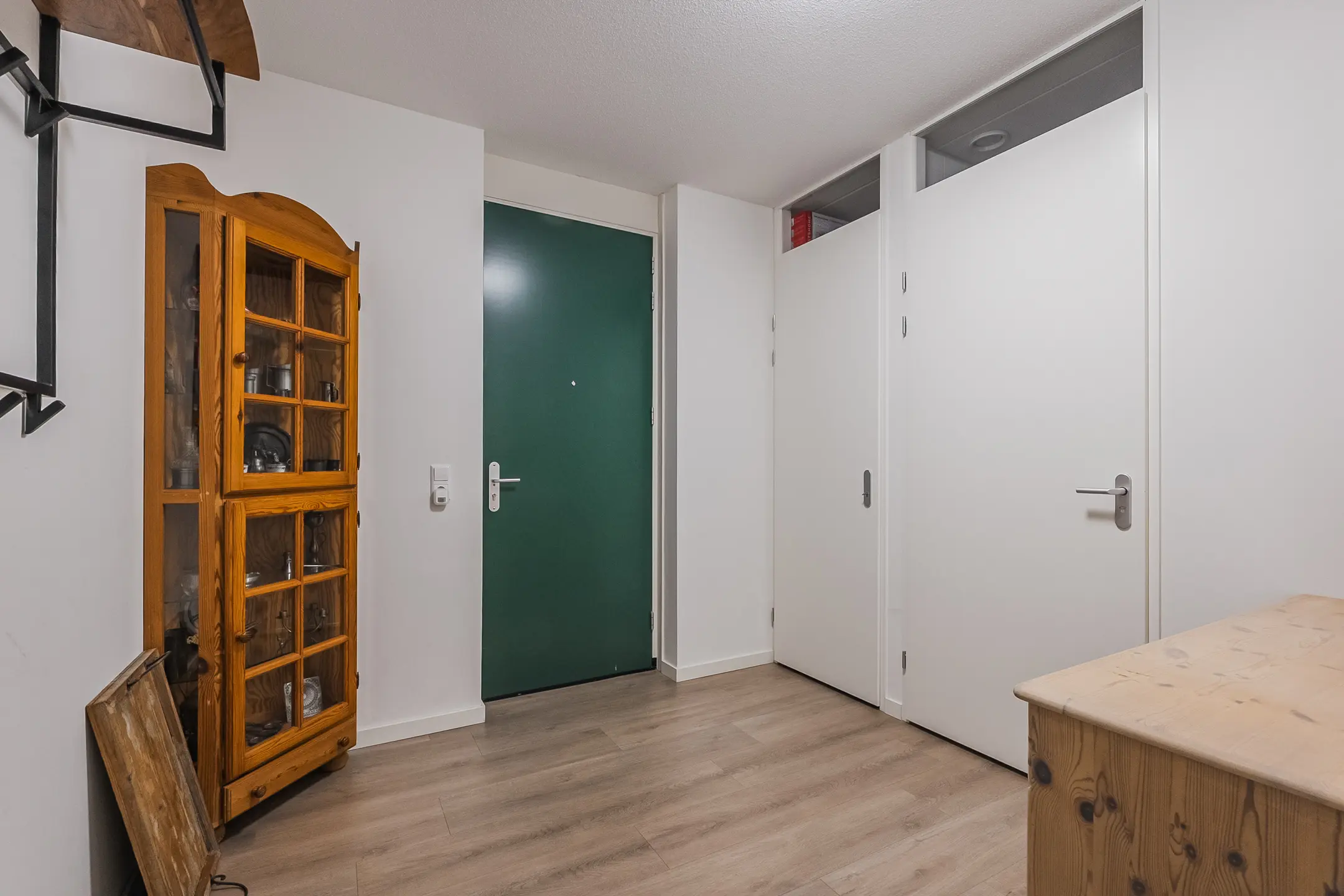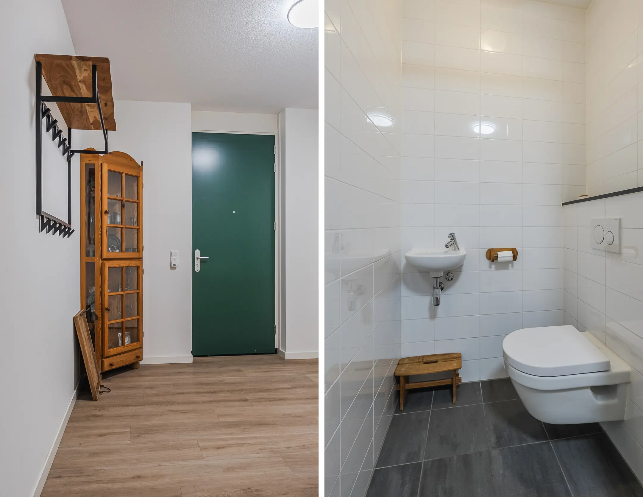 De entree is uitnodigend en ruim opgezet. Vanuit de hal heb je toegang tot alle vertrekken, waarbij de rustige, natuurlijke afwerking meteen de toon zet voor de rest van de woning. Het sterke gevoel van licht en openheid begint al hier.