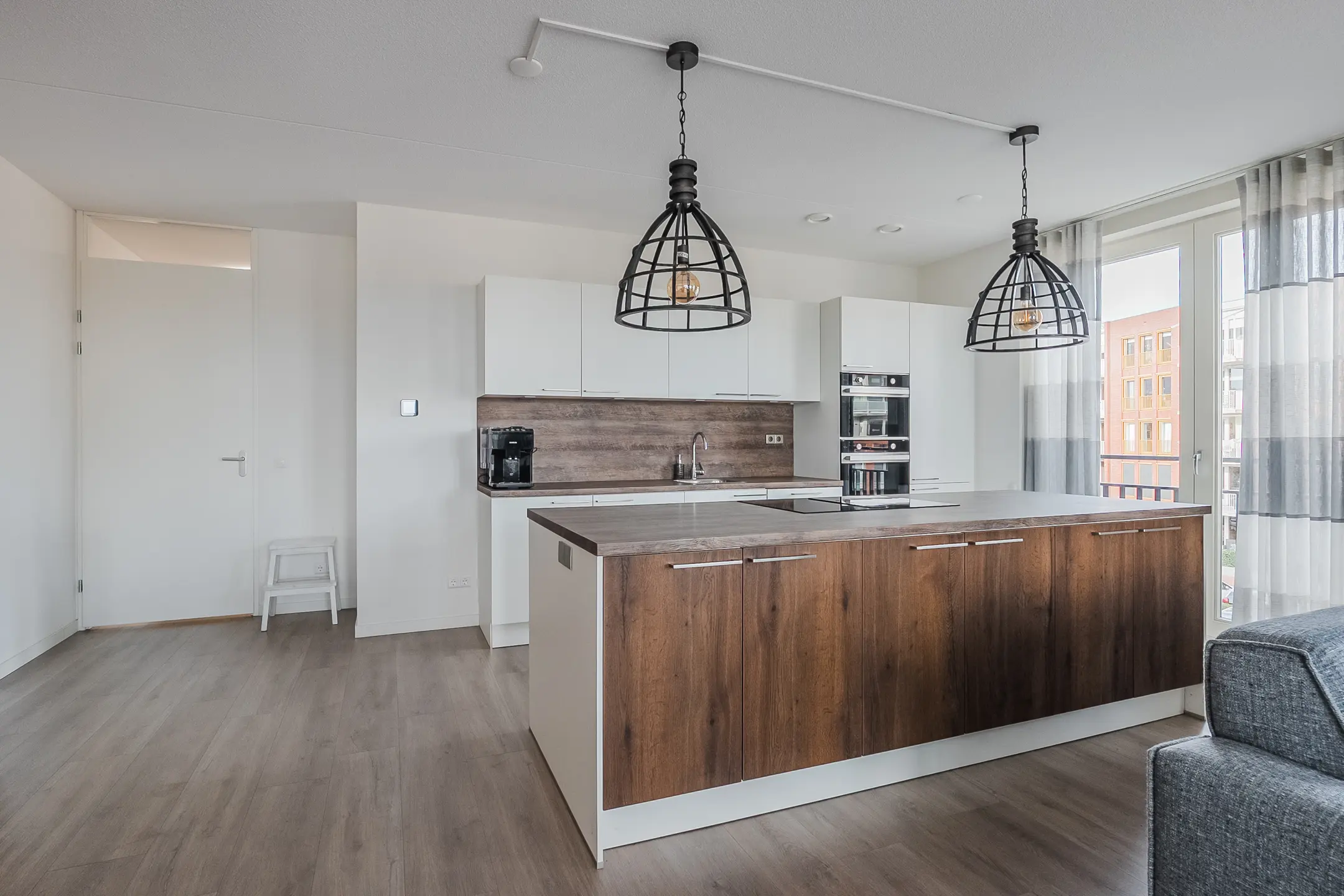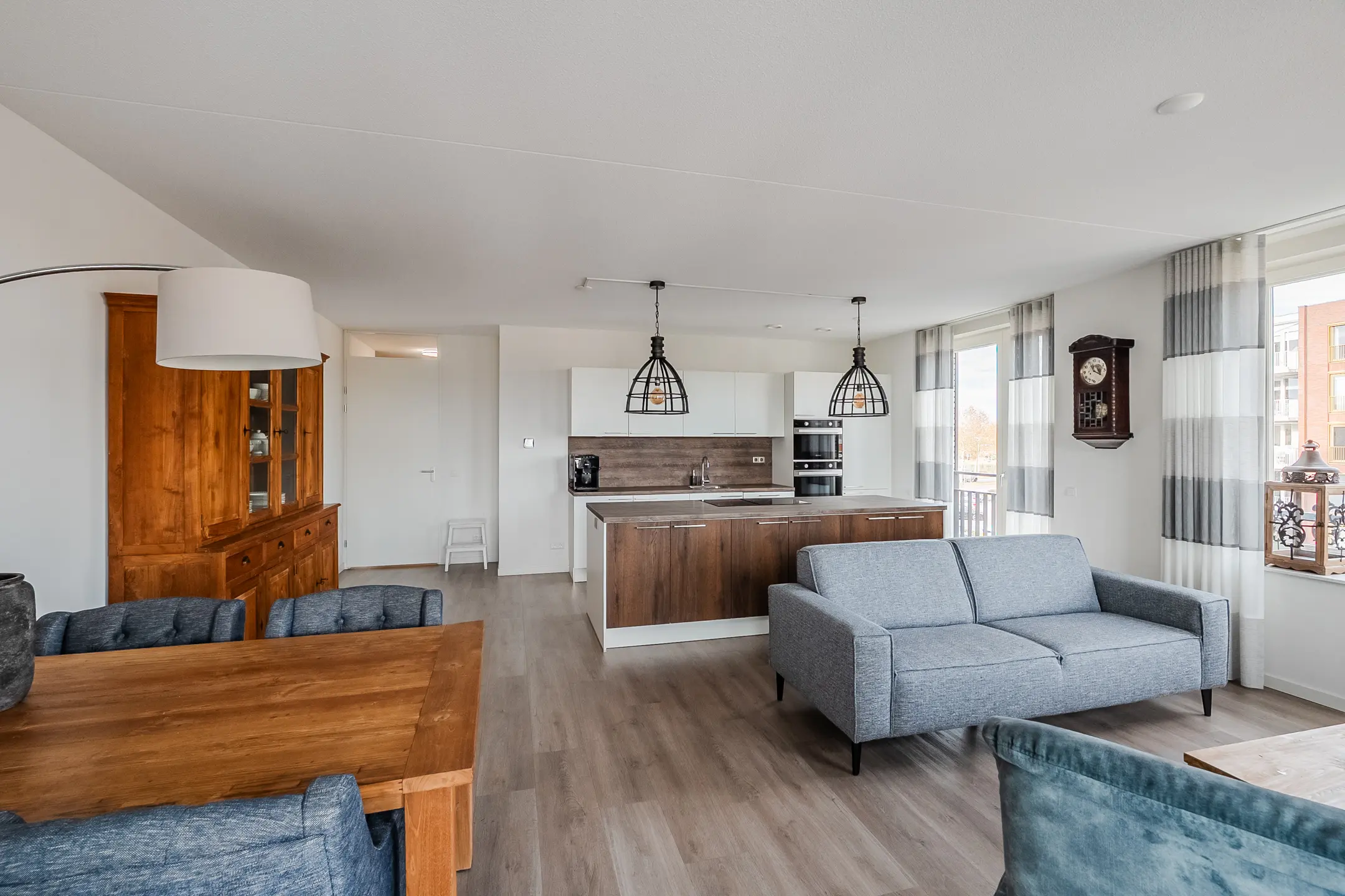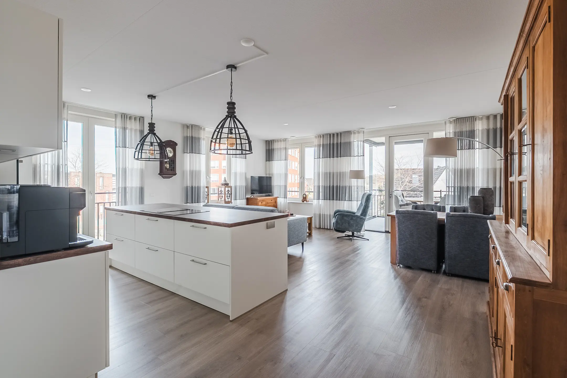 Zodra je binnenkomt, valt het licht direct op. De grote ramen en de open indeling zorgen voor een ruimtelijke sfeer waarin de woonkamer, keuken en buitenruimte naadloos in elkaar overlopen. Het hart van het appartement is de moderne keuken met kookeiland: een plek waar je samenkomt, kookt, praat, proeft en altijd verbonden blijft met de rest van de leefruimte. Of je nu uitgebreid dineert of met een kop koffie de dag begint, het voelt hier vanzelf goed.