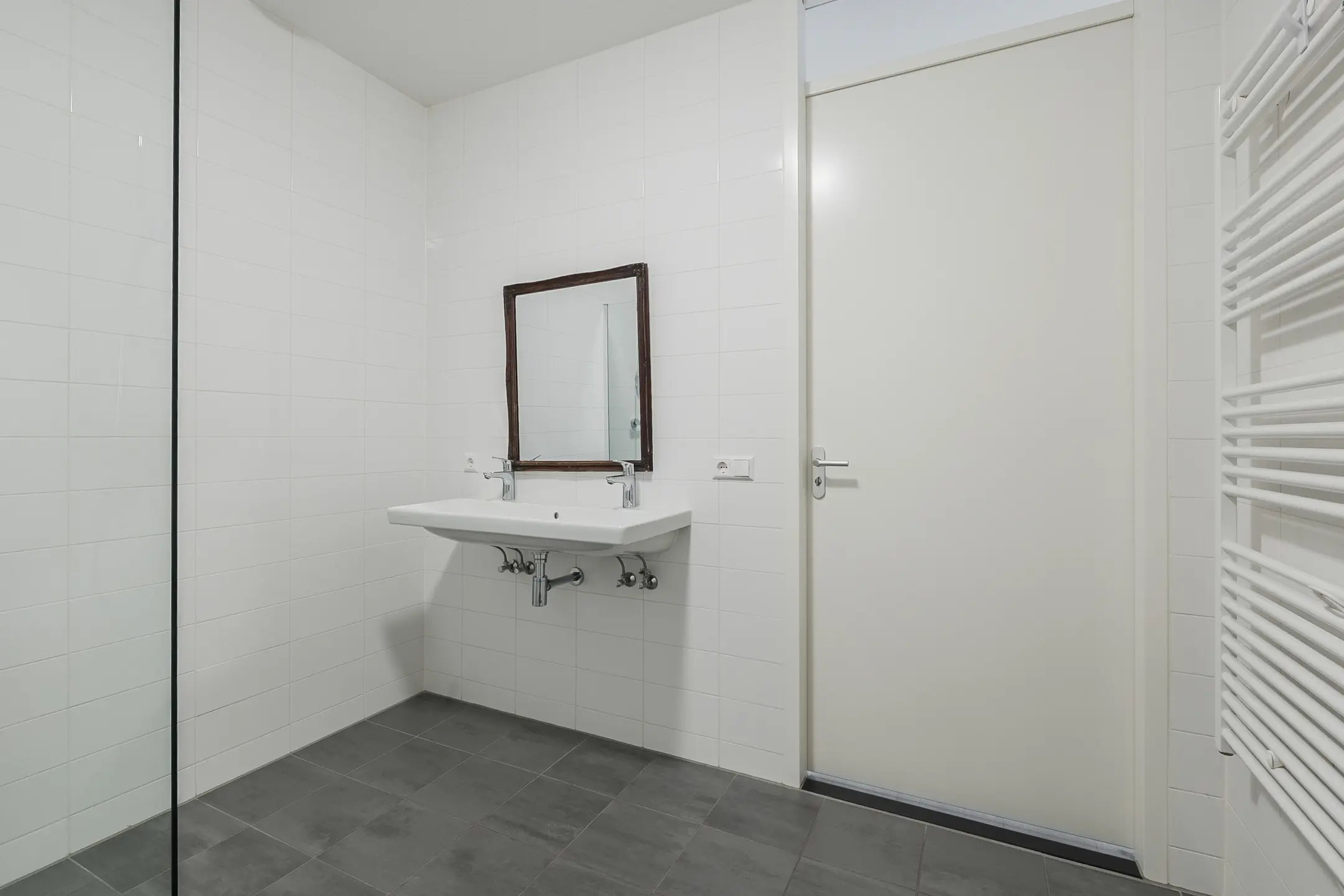 De badkamer is ruim en functioneel ingericht, met een inloopdouche en dubbele wastafel – een praktische ruimte waar je alles hebt wat je nodig hebt. Het toilet met fonteintje is apart gesitueerd.