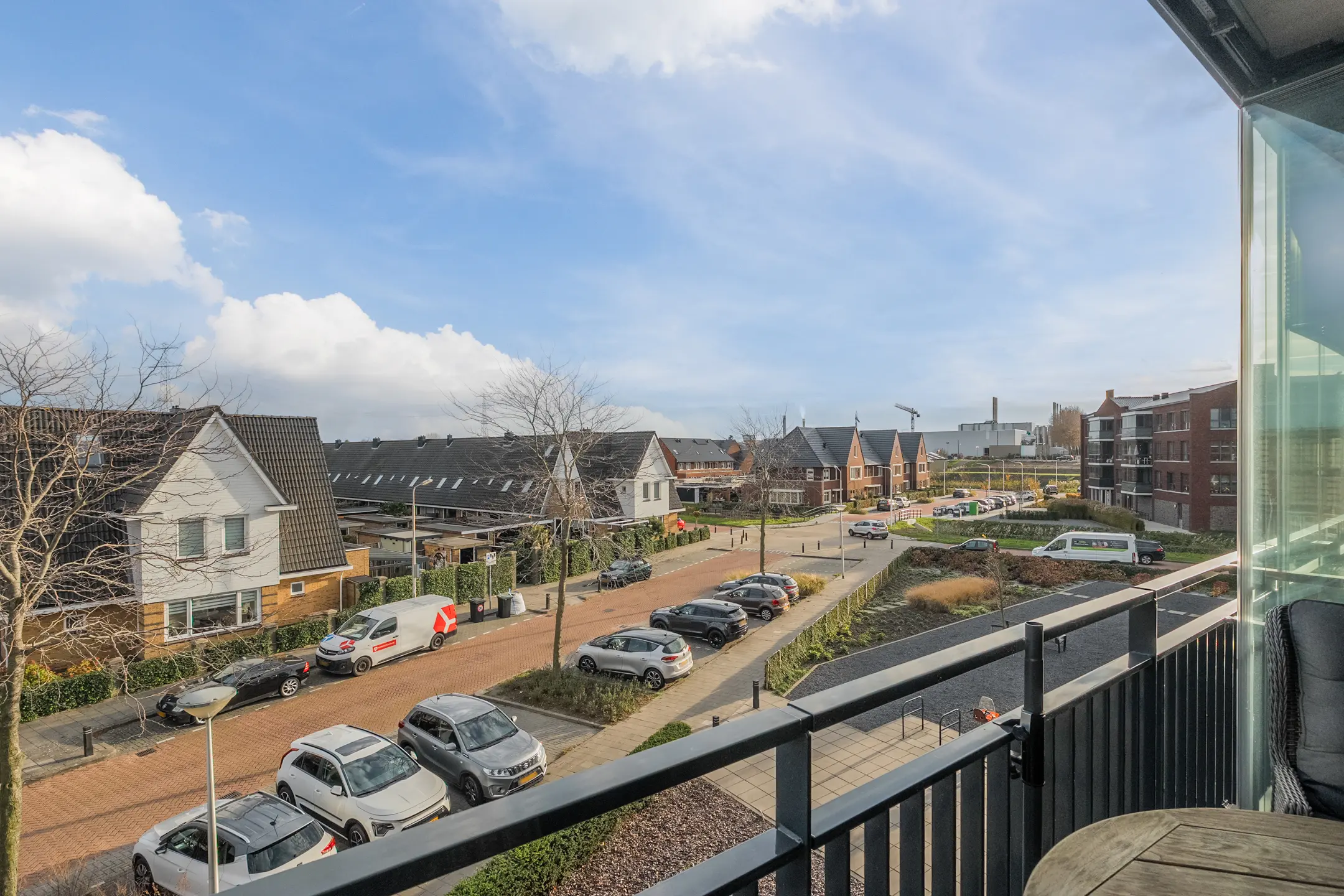 Via de woonkamer stap je het balkon op — gericht op het oosten, perfect voor een rustige ochtendzon en een frisse start van de dag. De glazen schuifwand zorgt ervoor dat je het hele jaar door van deze buitenplek kunt genieten; open op warme dagen, dicht wanneer je beschut wilt zitten. Buiten wordt binnen, zonder concessies.