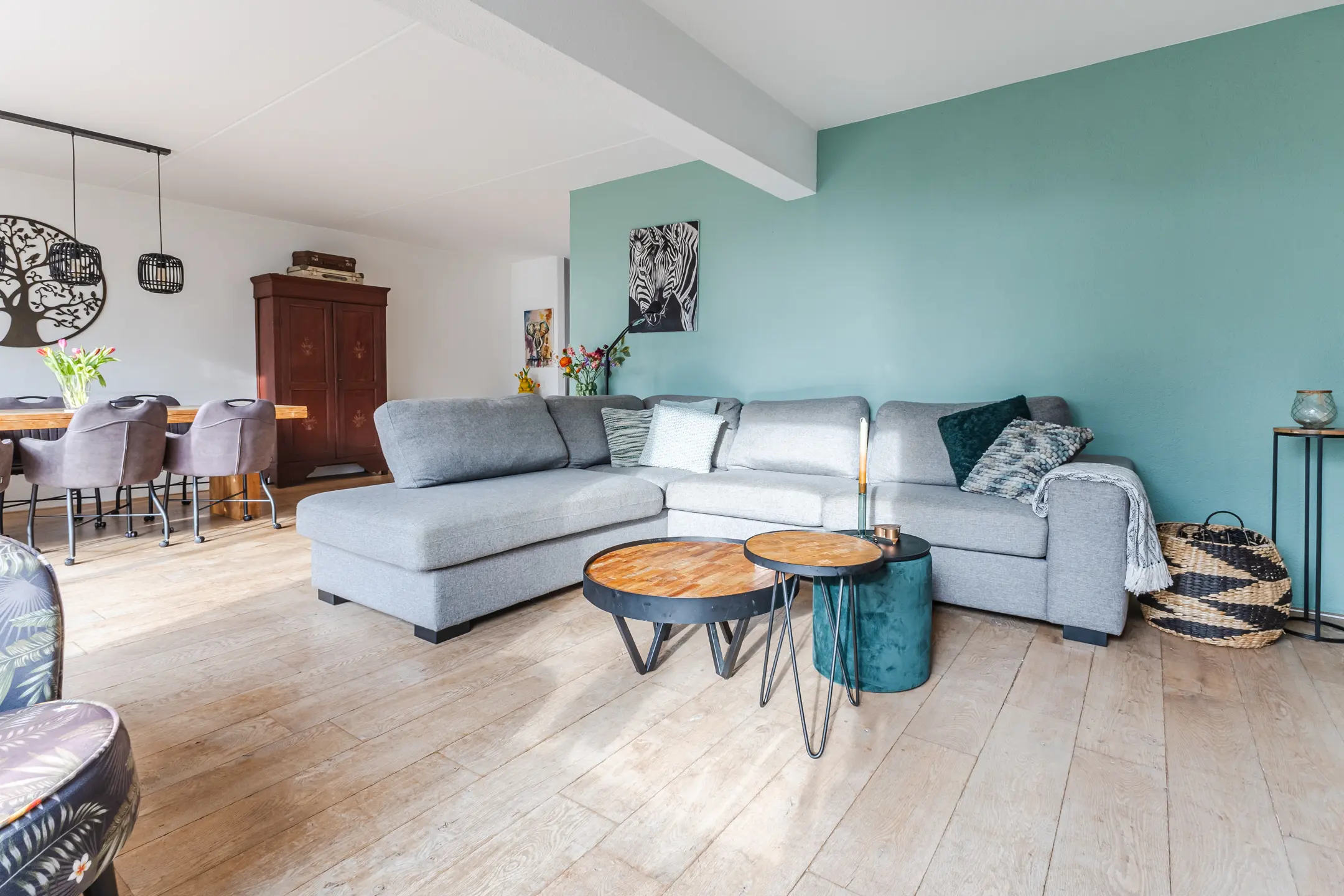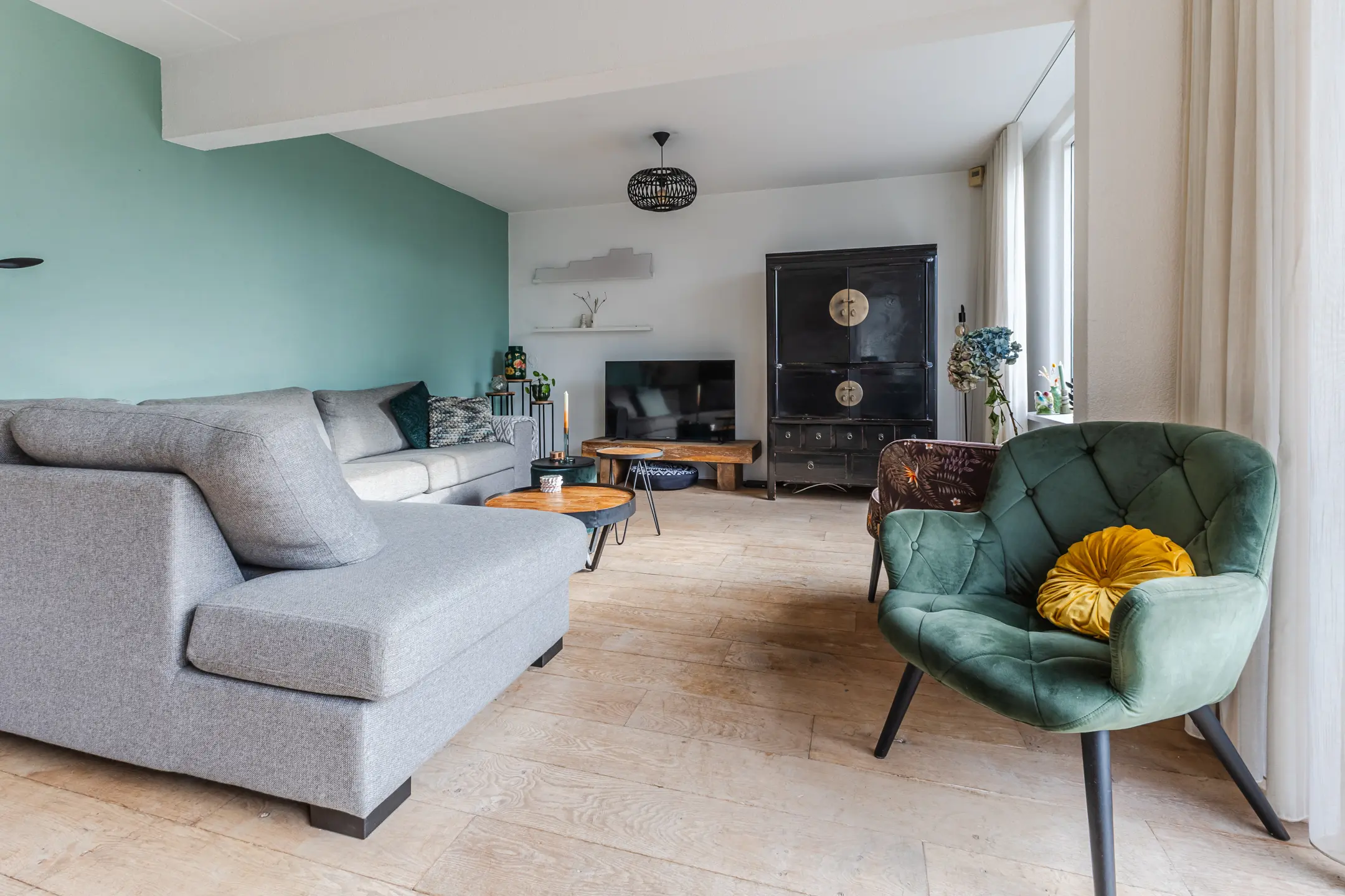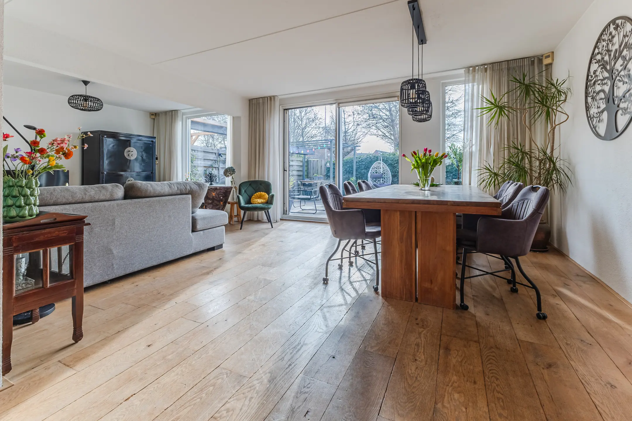De ruime woonkamer is gelegen aan de achterzijde van de woning en biedt een prettig uitzicht op de tuin. Dankzij de grote raampartijen valt hier veel natuurlijk licht binnen. De aluminium schuifpui zorgt voor een fijne verbinding tussen de woonkamer en de tuin, waardoor binnen en buiten op een natuurlijke manier in elkaar overlopen.