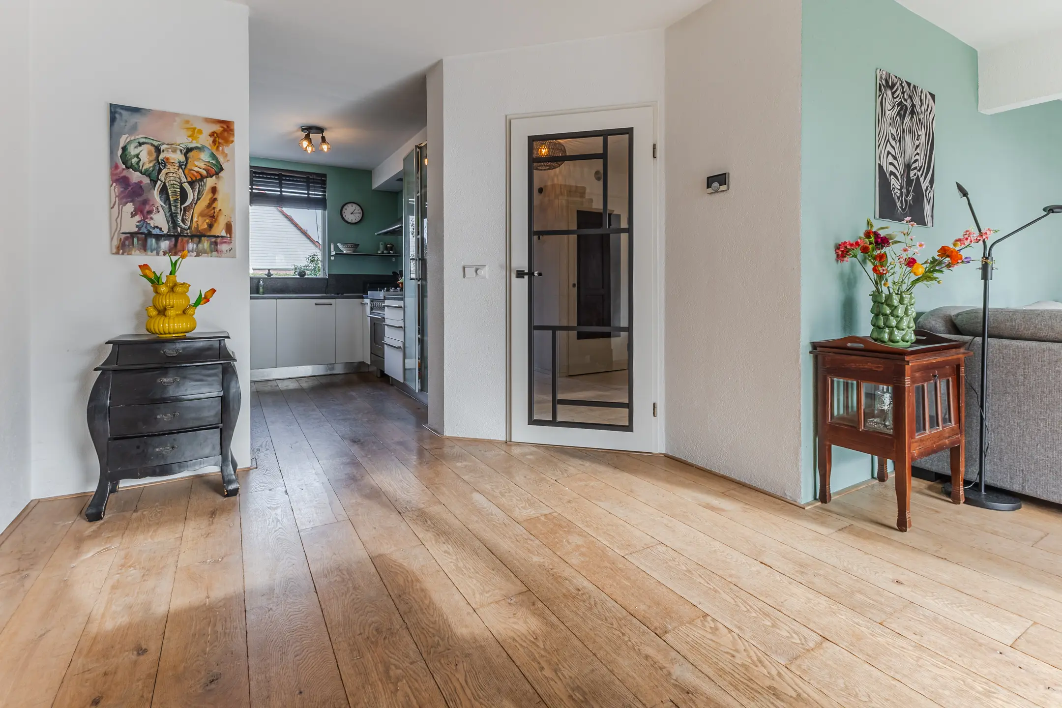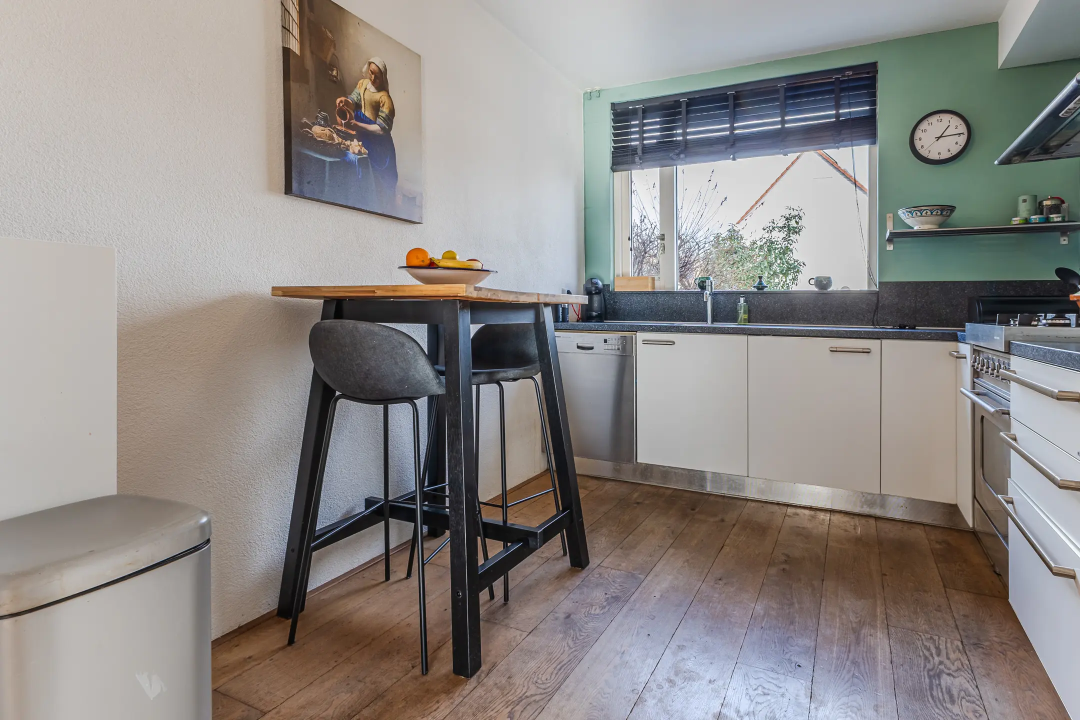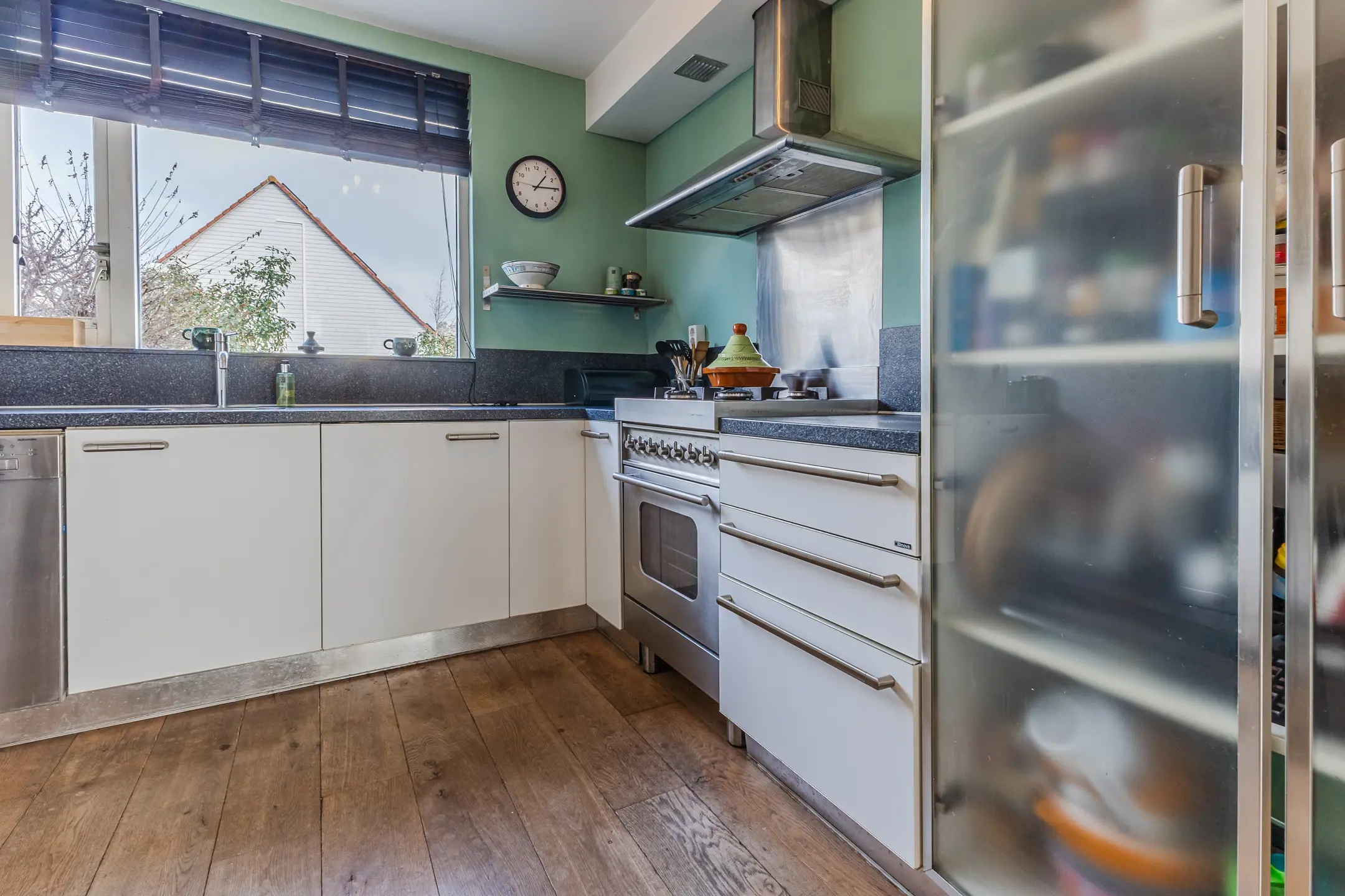 Aan de voorzijde van de woning bevindt zich de open keuken met zicht op de straat. De keuken is opgesteld in een praktische hoekopstelling en biedt volop mogelijkheden voor een eigentijdse invulling.
