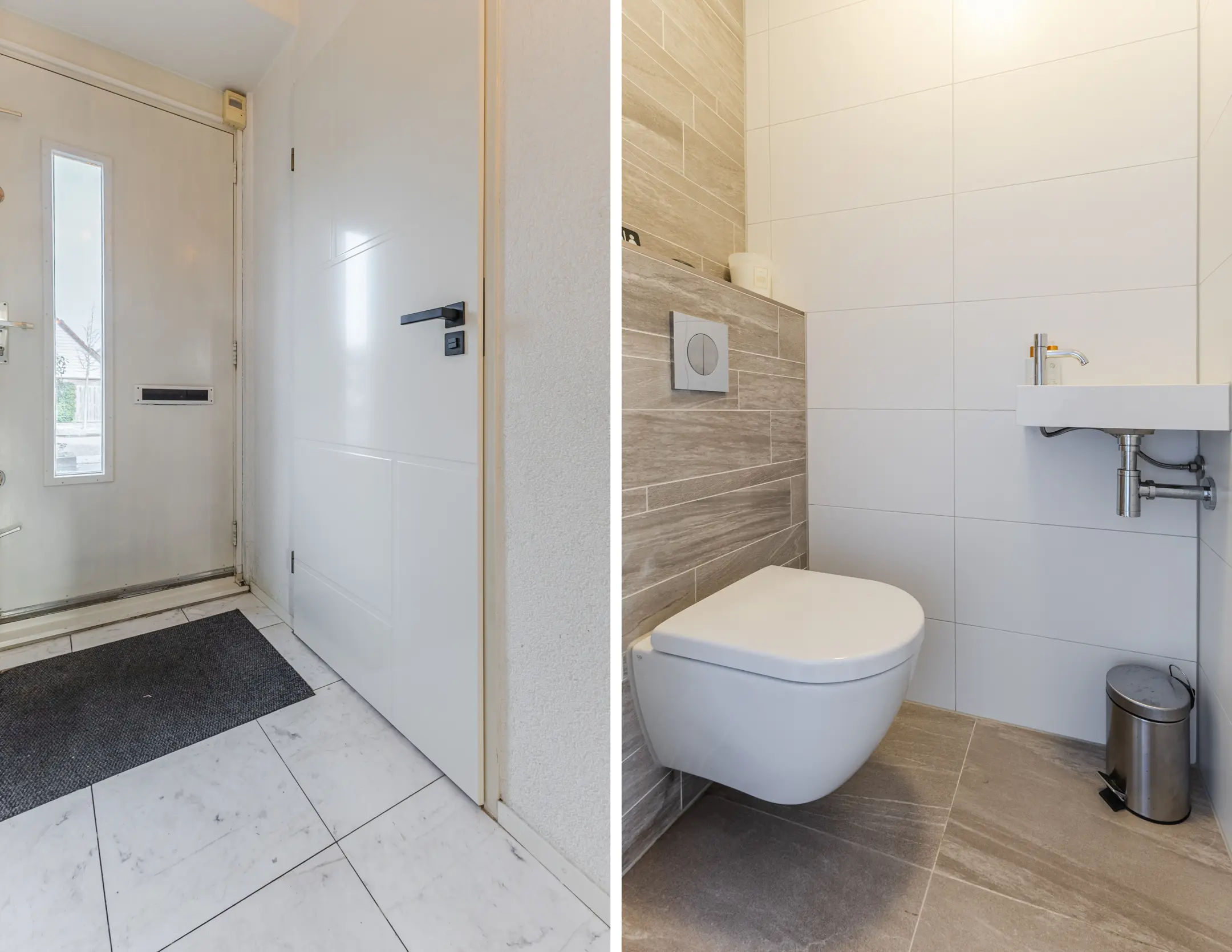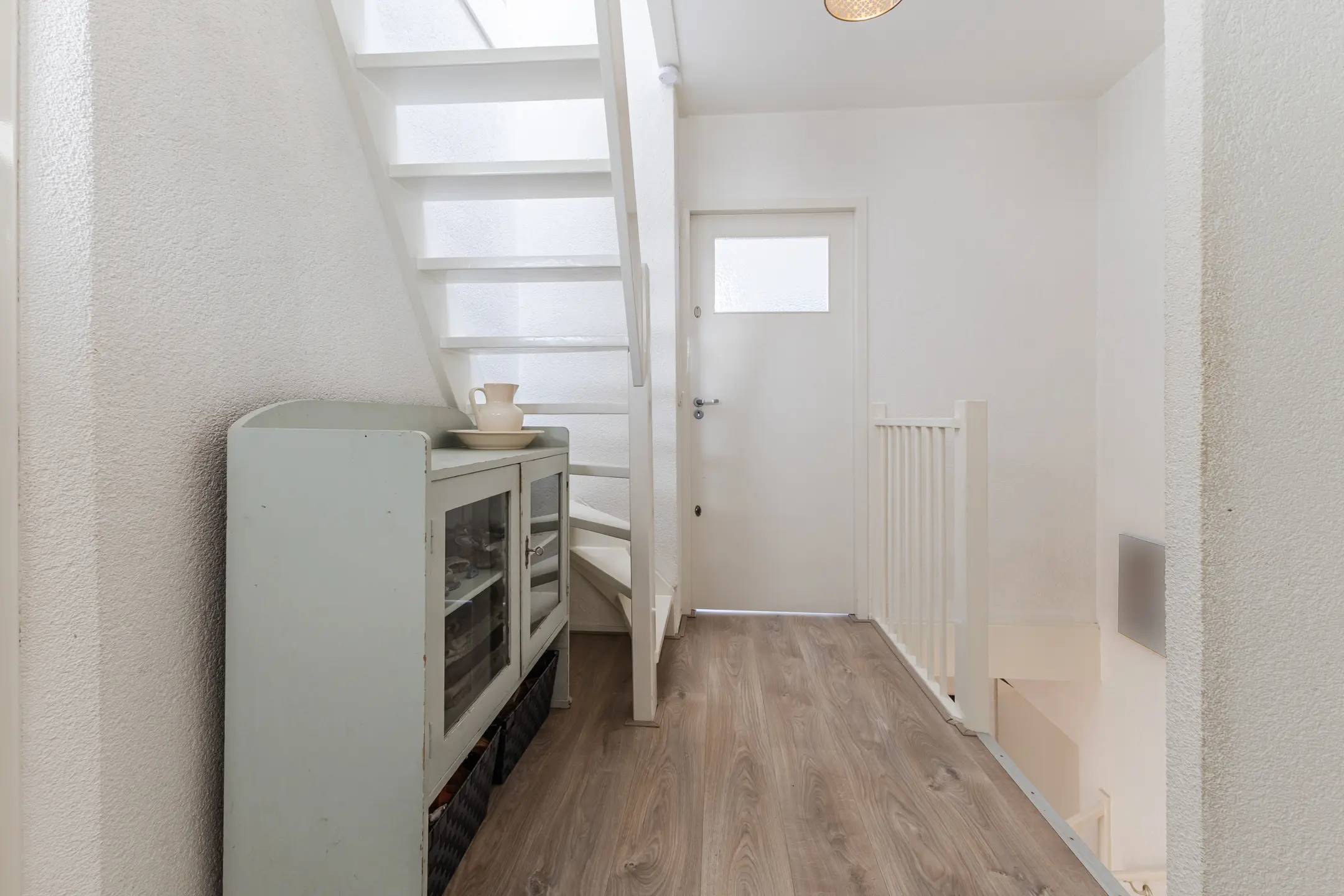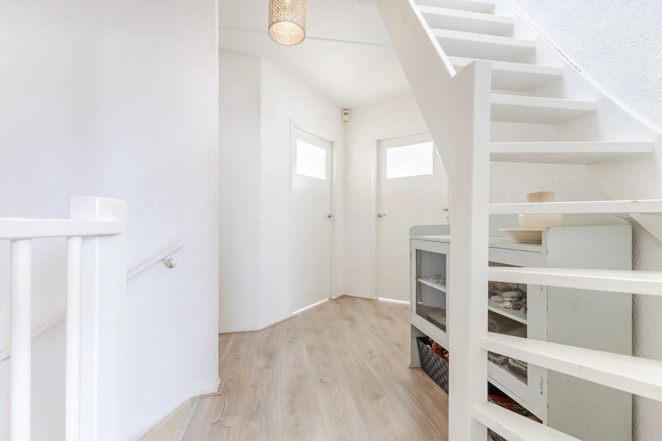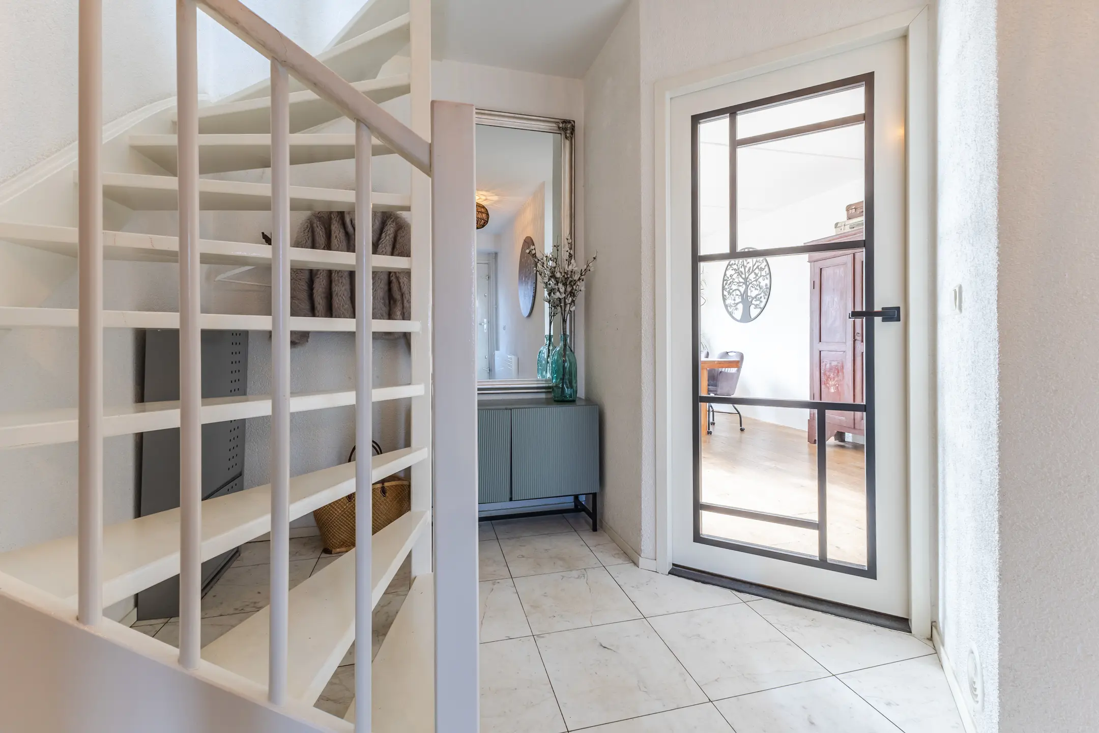 Via de verzorgde entree komt u in de hal met toiletruimte, meterkast en een stijlvolle design draaitrap naar de eerste verdieping. Vanuit de hal zijn zowel de inpandige garage als de woonkamer toegankelijk.