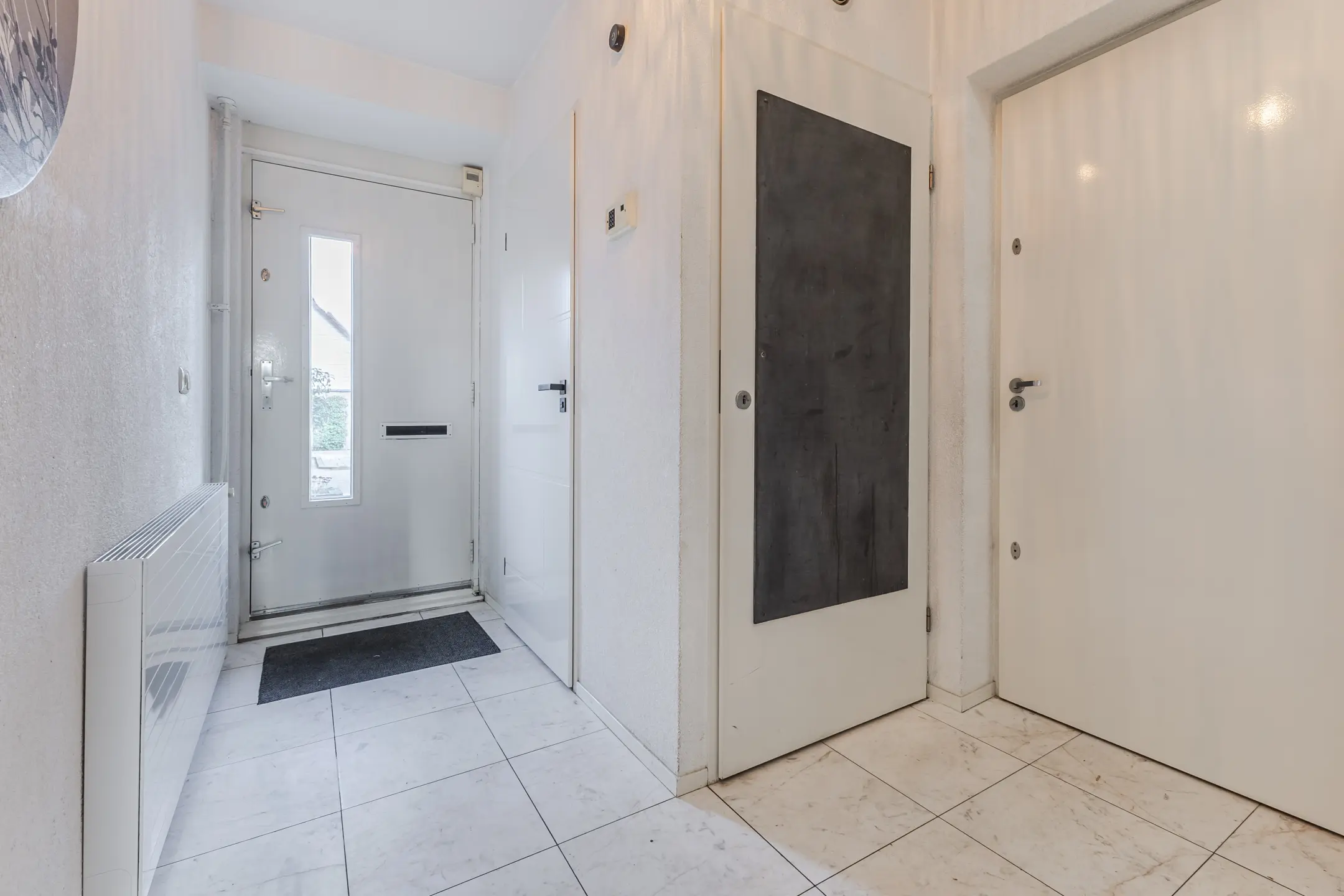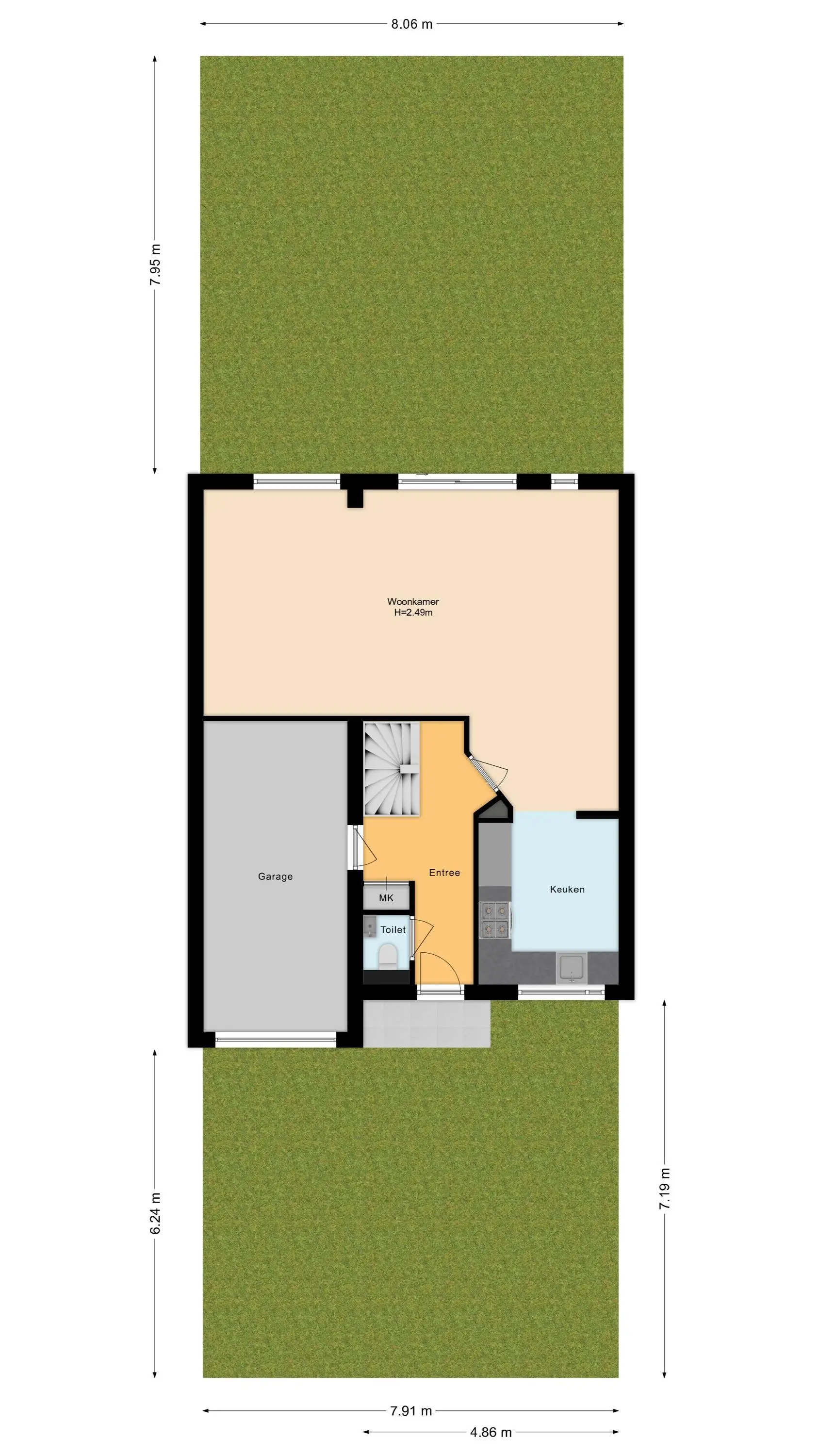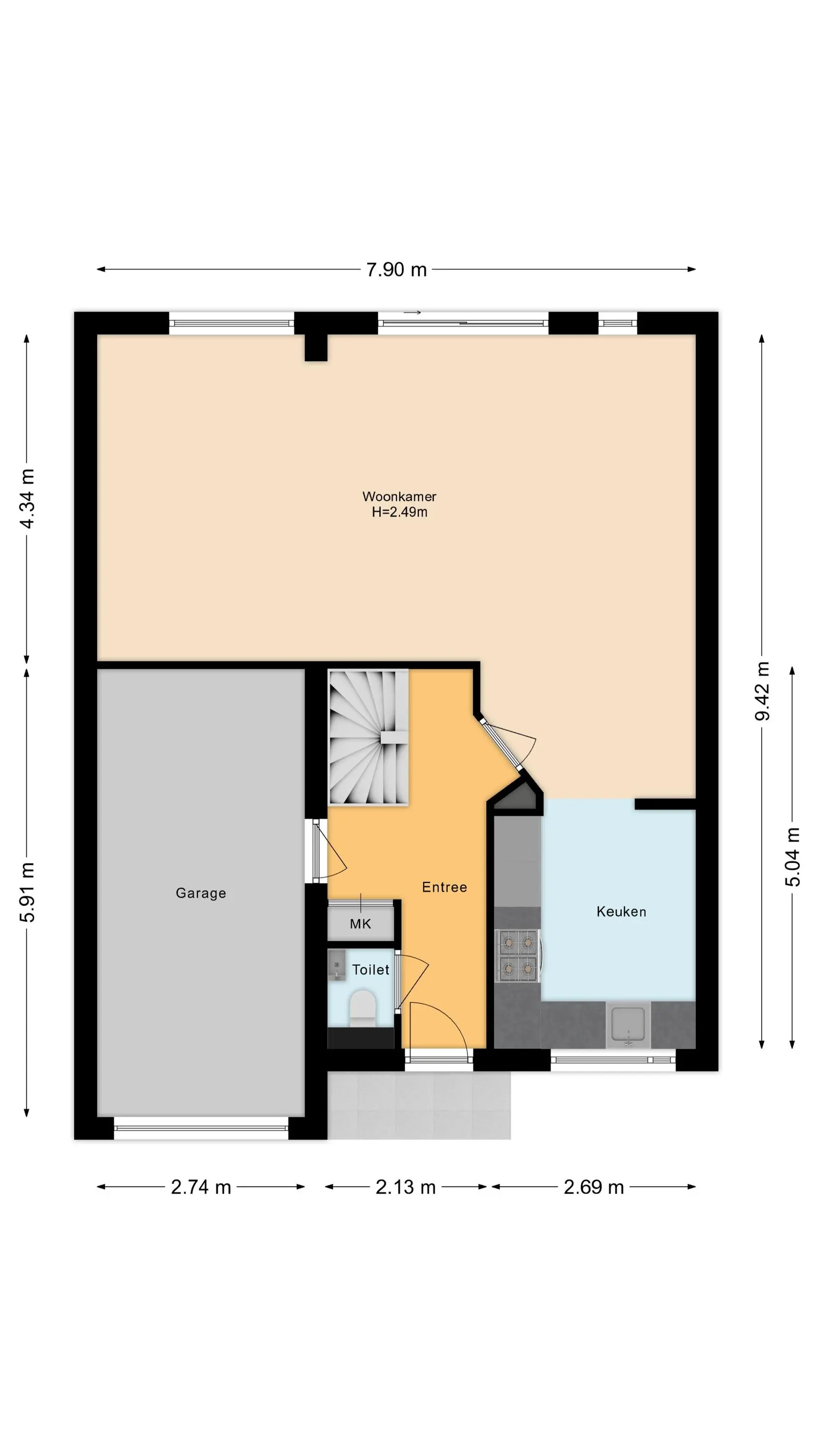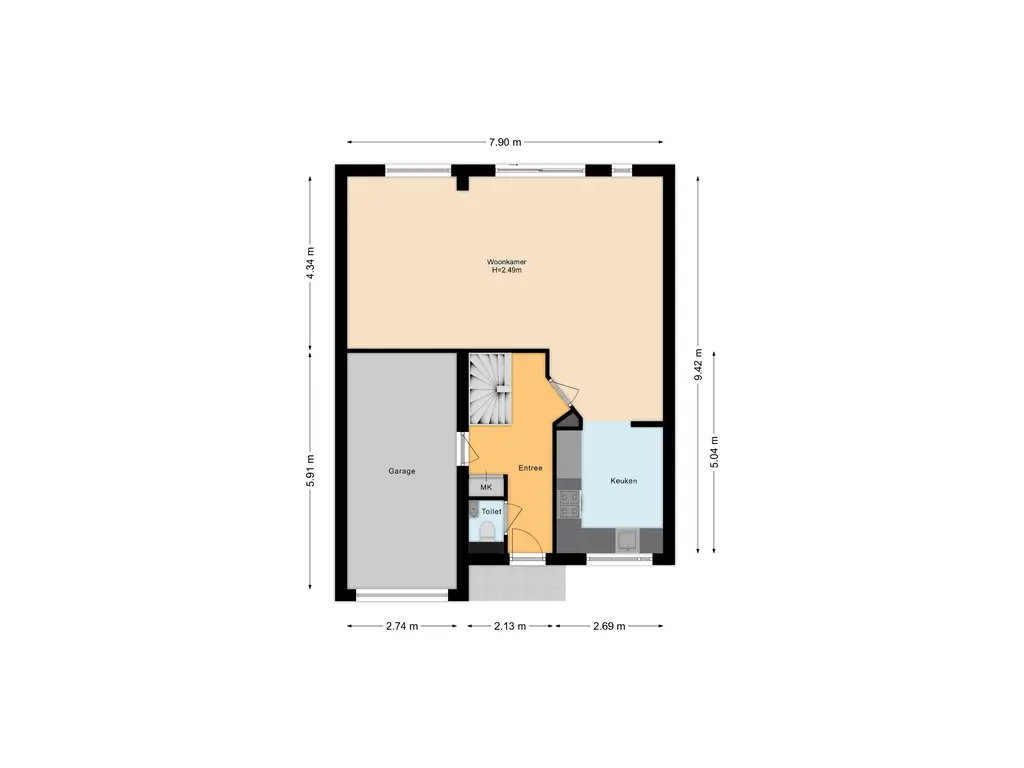 Via de verzorgde entree komt u in de hal met toiletruimte, meterkast en een stijlvolle design draaitrap naar de eerste verdieping. Vanuit de hal zijn zowel de inpandige garage als de woonkamer toegankelijk.