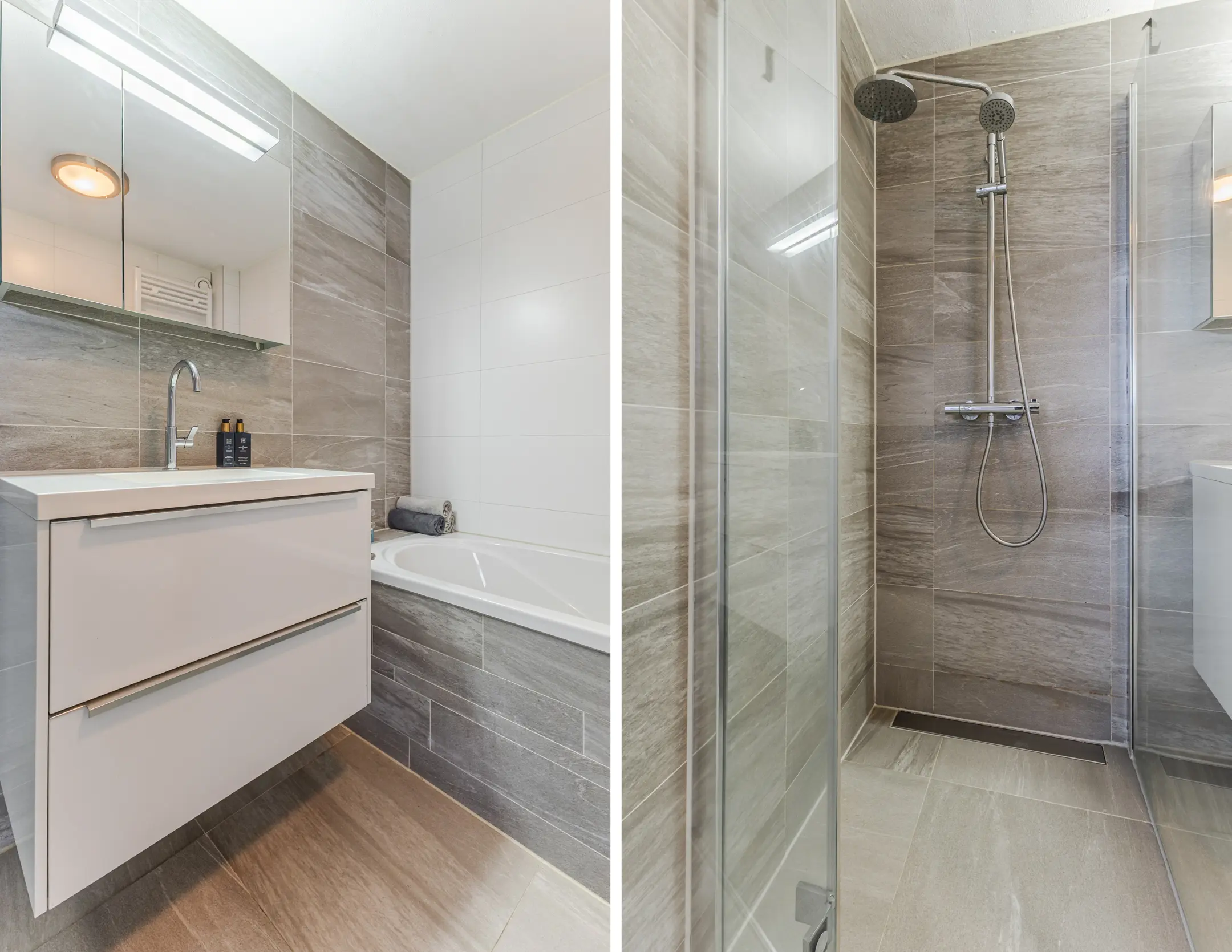 De badkamer is compleet uitgevoerd met een ligbad, een douche met thermostaatkraan, een wastafelmeubel en een tweede toilet.