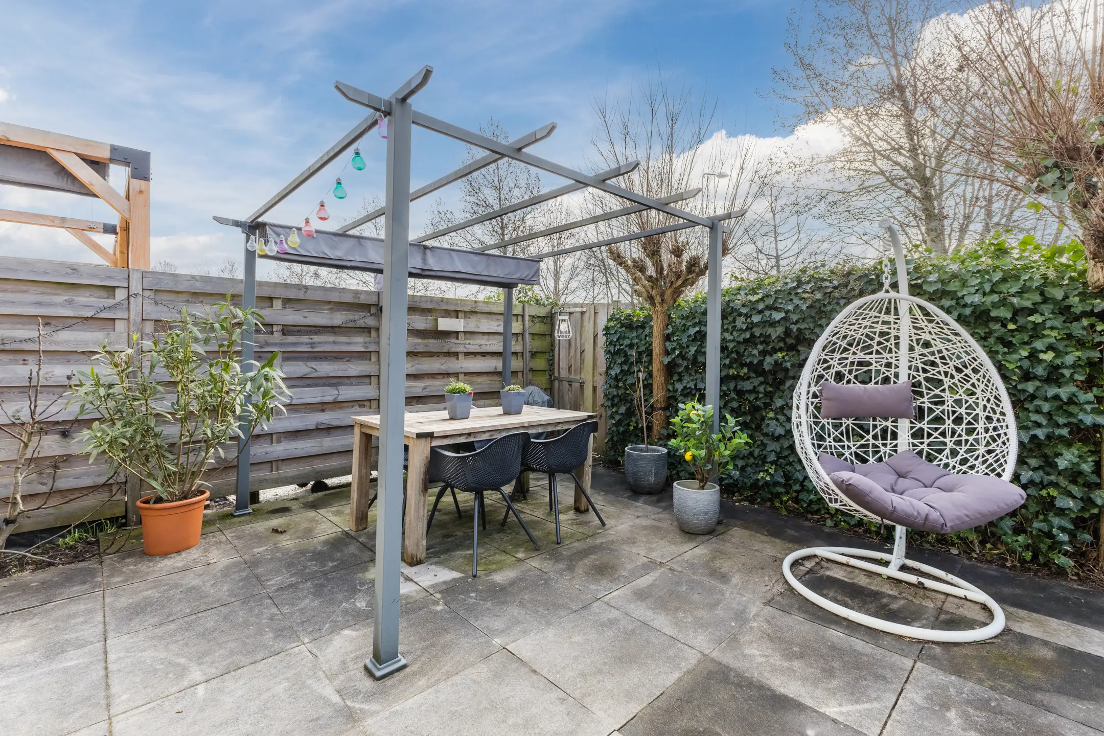 De zonnige achtertuin is gesitueerd op het zuiden en is verzorgd aangelegd met sierbestrating. Door het ontbreken van directe achterburen geniet u hier van rust en privacy. De tuin is voorzien van een buitenkraan en bereikbaar via een praktische achterom.