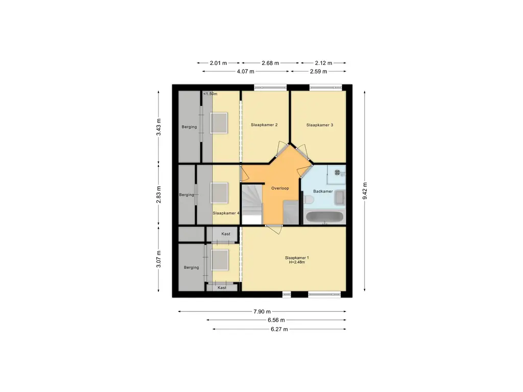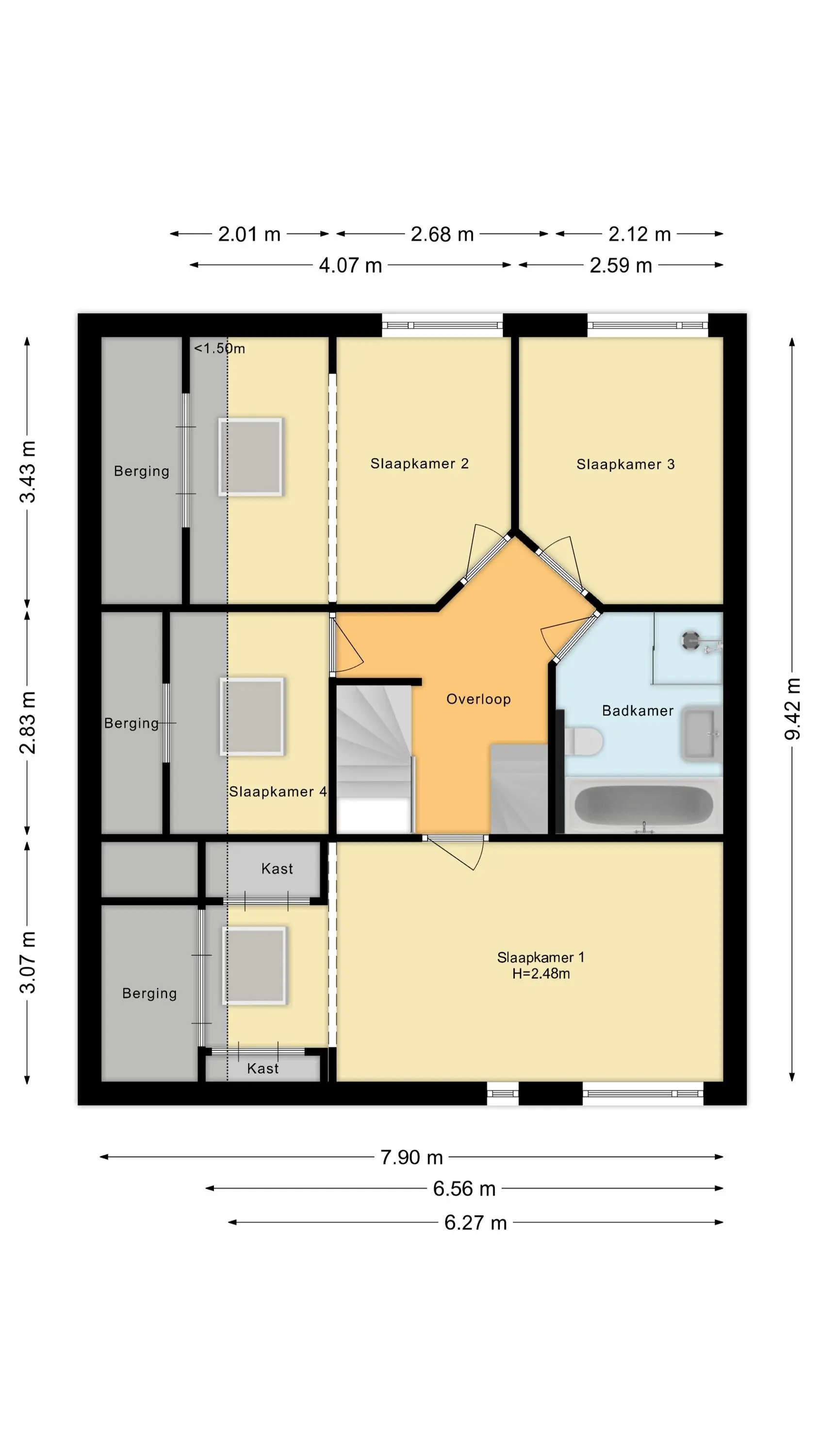 Op de eerste verdieping bevinden zich vier slaapkamers, waarvan één momenteel in gebruik is als werk-/hobbykamer. Daarnaast is er de badkamer.