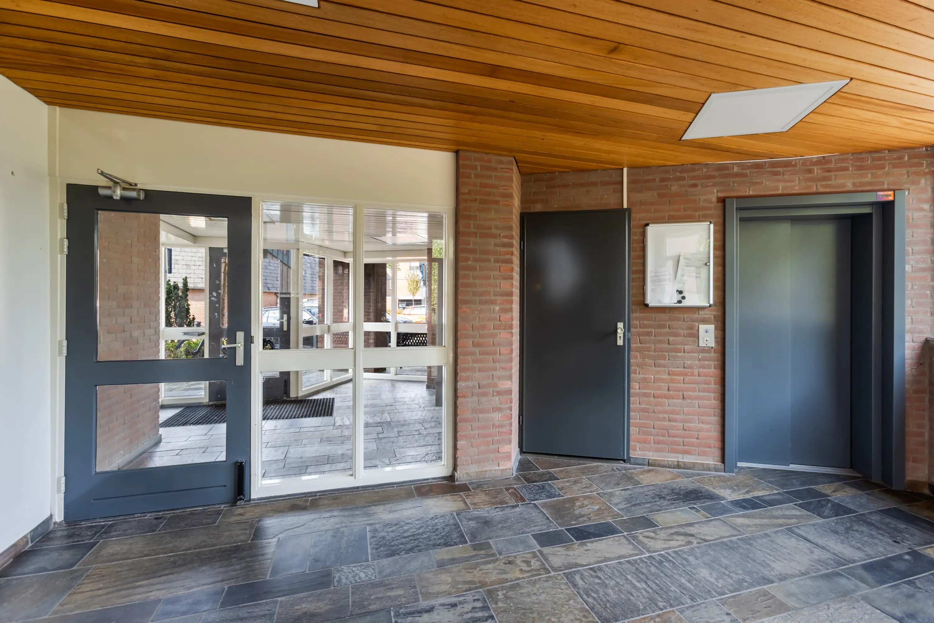 Afgesloten entree, bellentableau, brievenbussen, trappenhuis en toegang tot de lift.