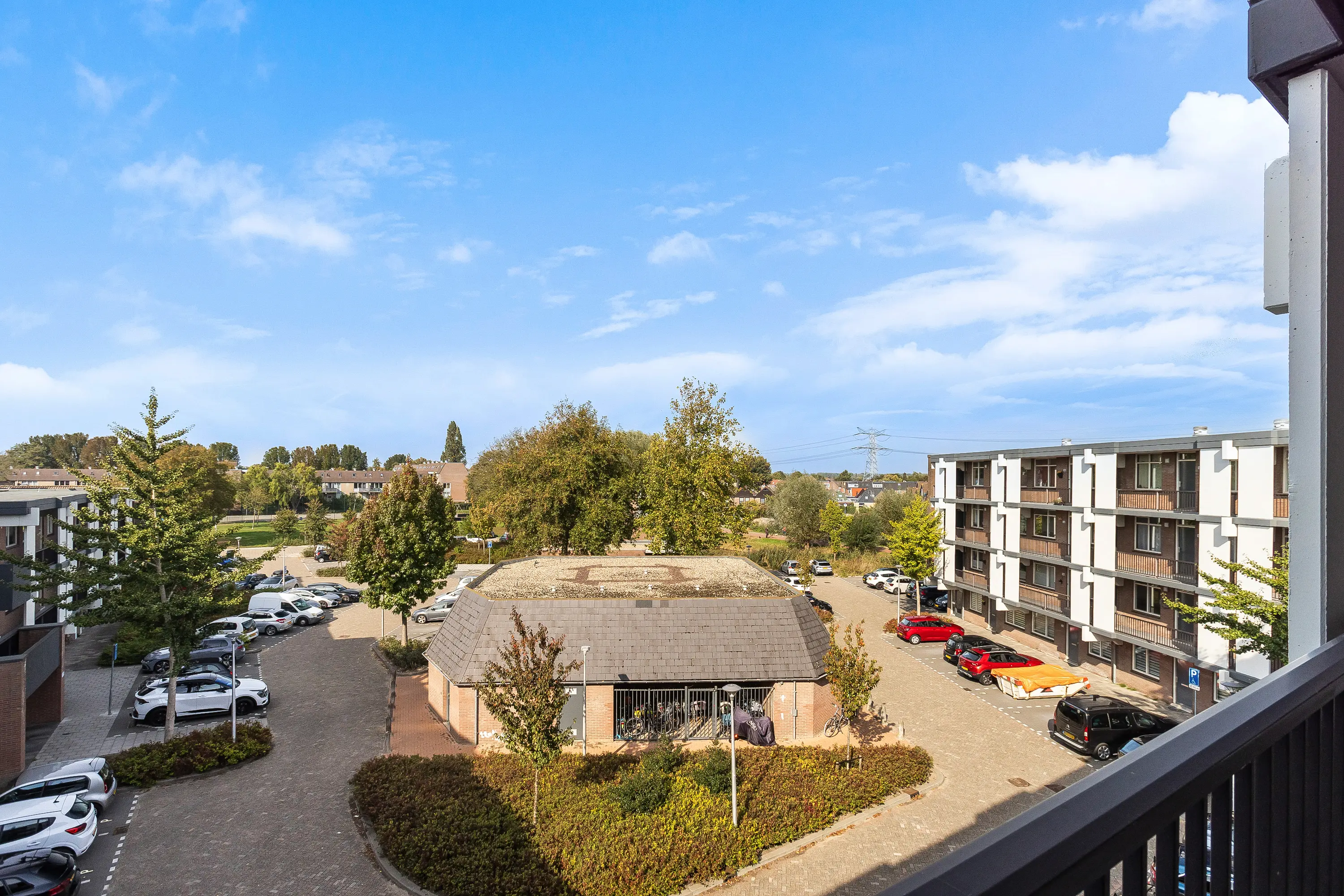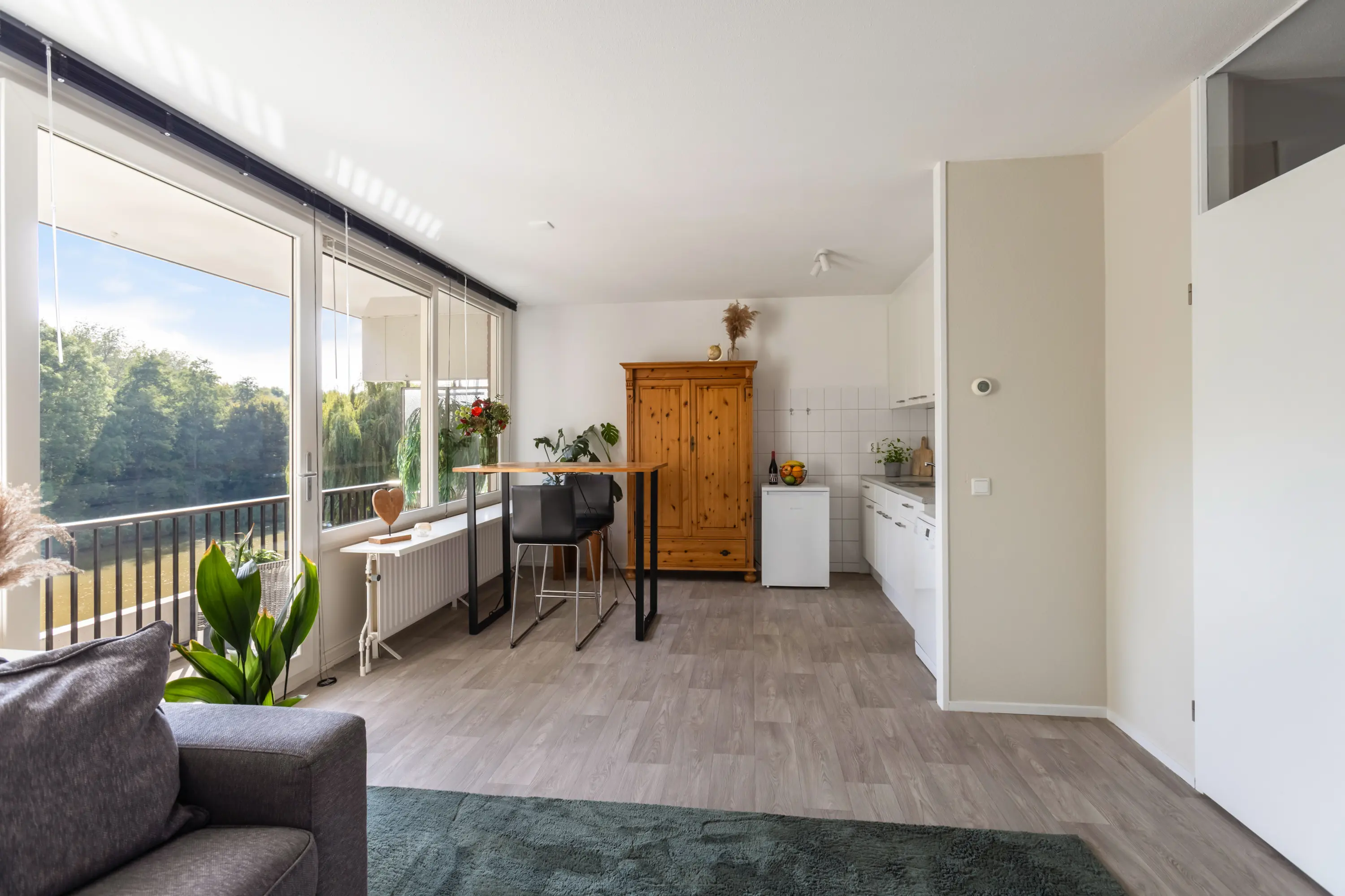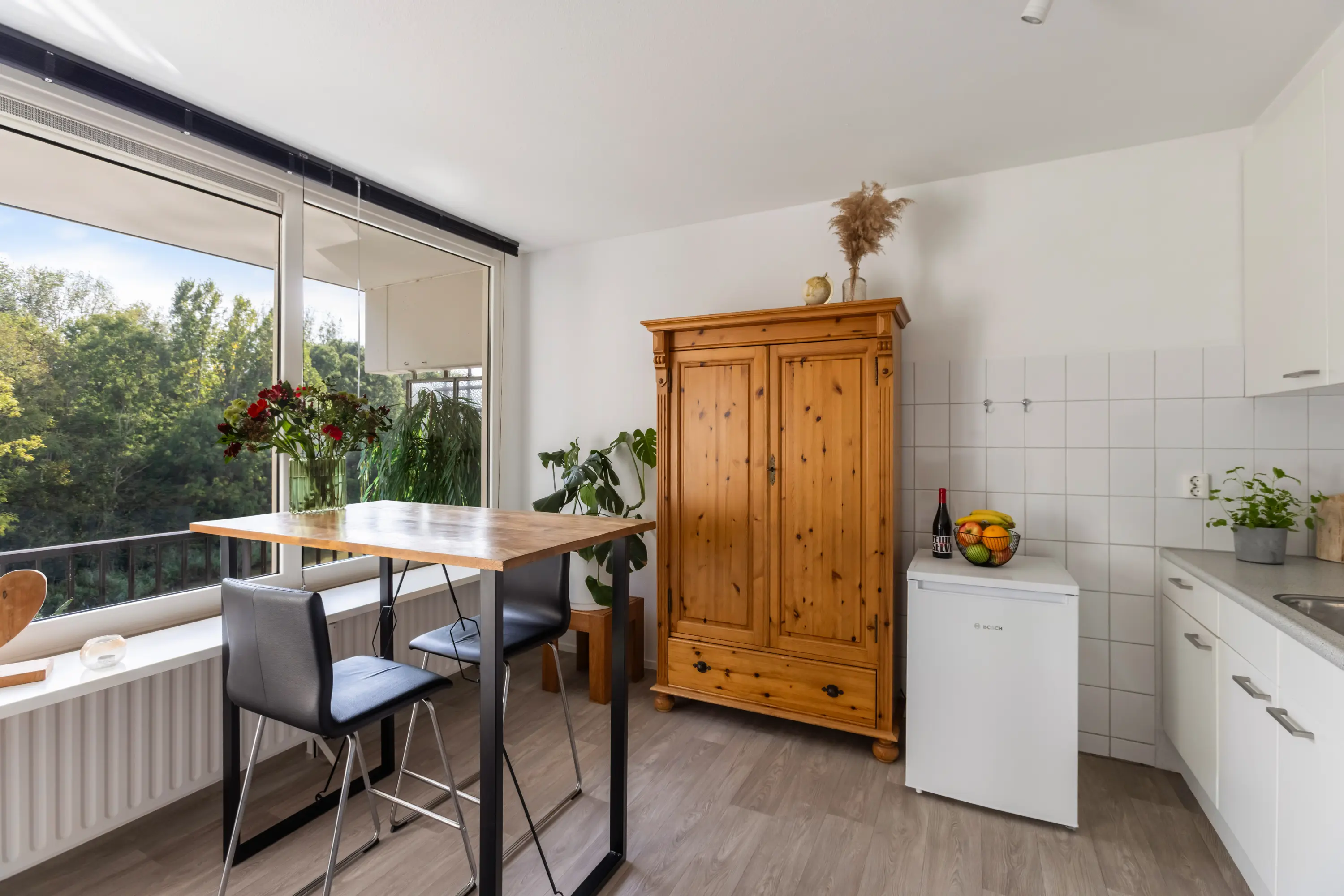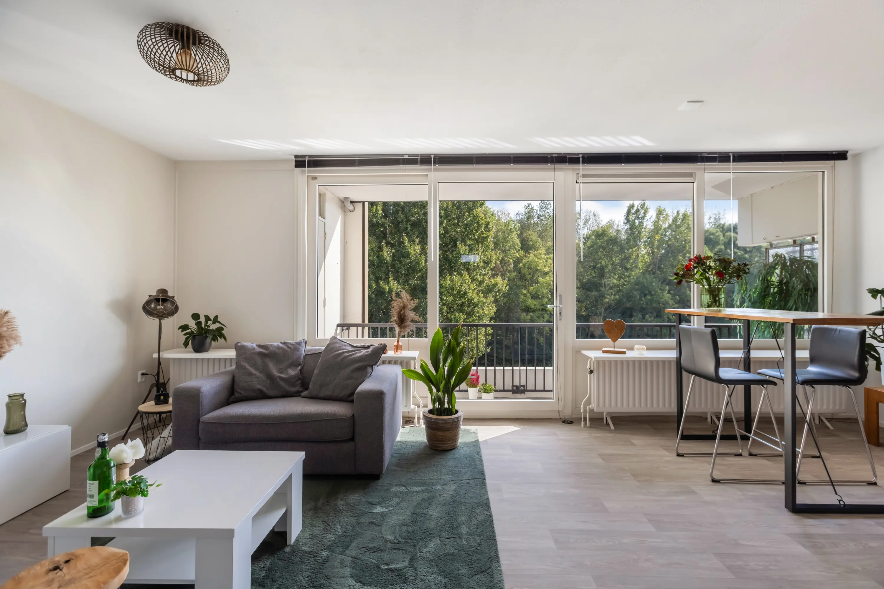Vanuit de hal is de lichte woonkamer bereikbaar, met een open keuken en een schuifpui naar het zonnige balkon op het zuidoosten met prachtig uitzicht over het Schollebos. Op het balkon bevindt zich tevens een handige bergkast.