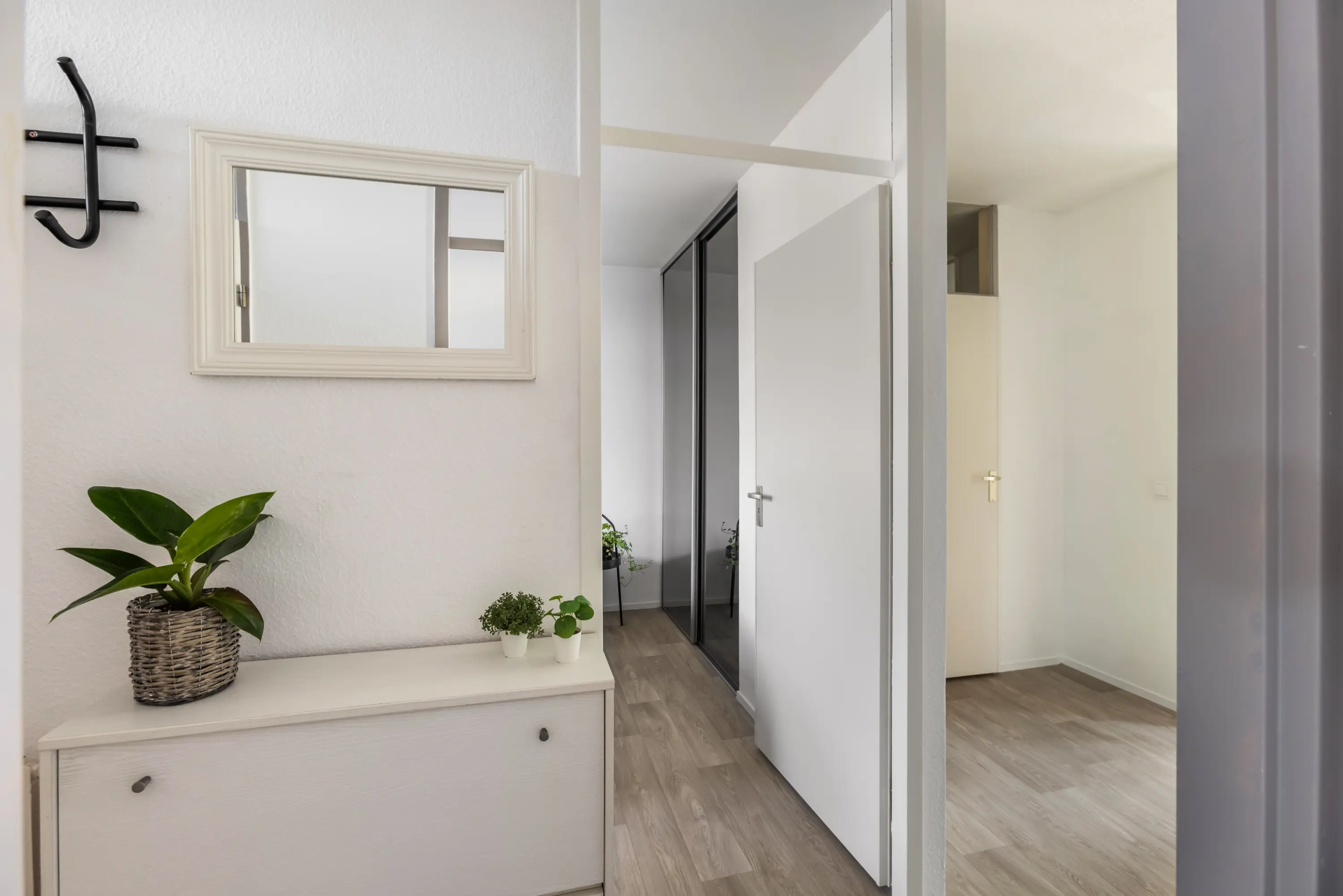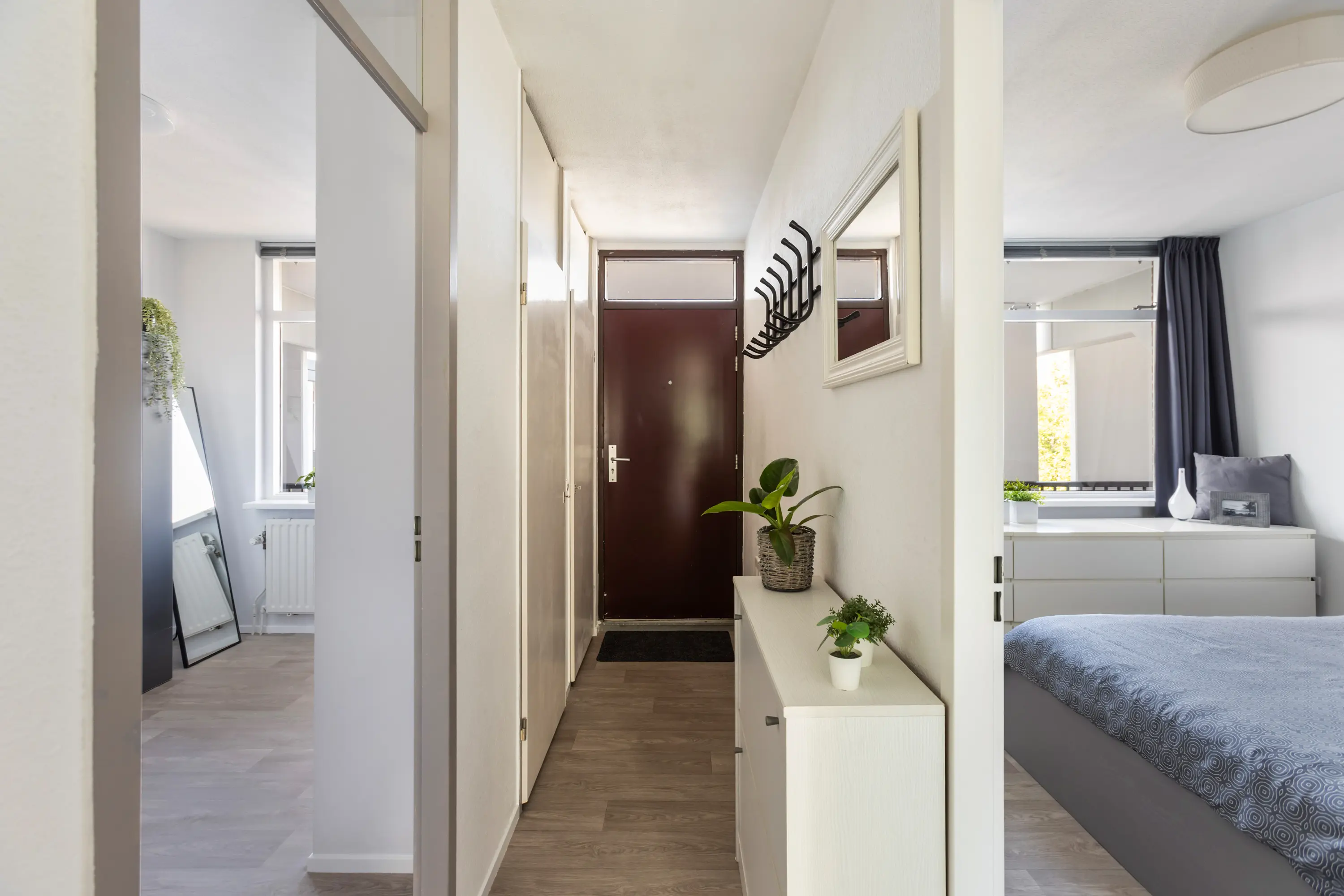 Bij binnenkomst in het appartement kom je in een hal met meterkast, een vaste kast, een inpandige berging en een toiletruimte voorzien van een hangend toilet en fonteintje.