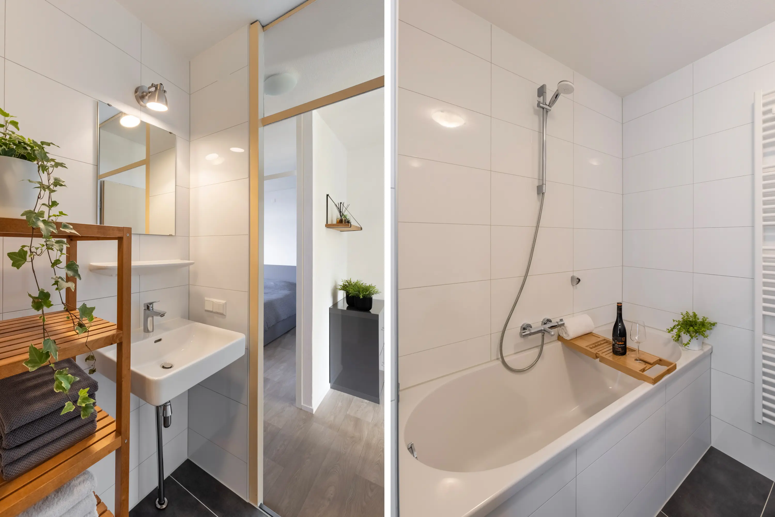De badkamer is modern betegeld en uitgerust met een ligbad met douche, een wastafel en een aansluiting voor de wasmachine.