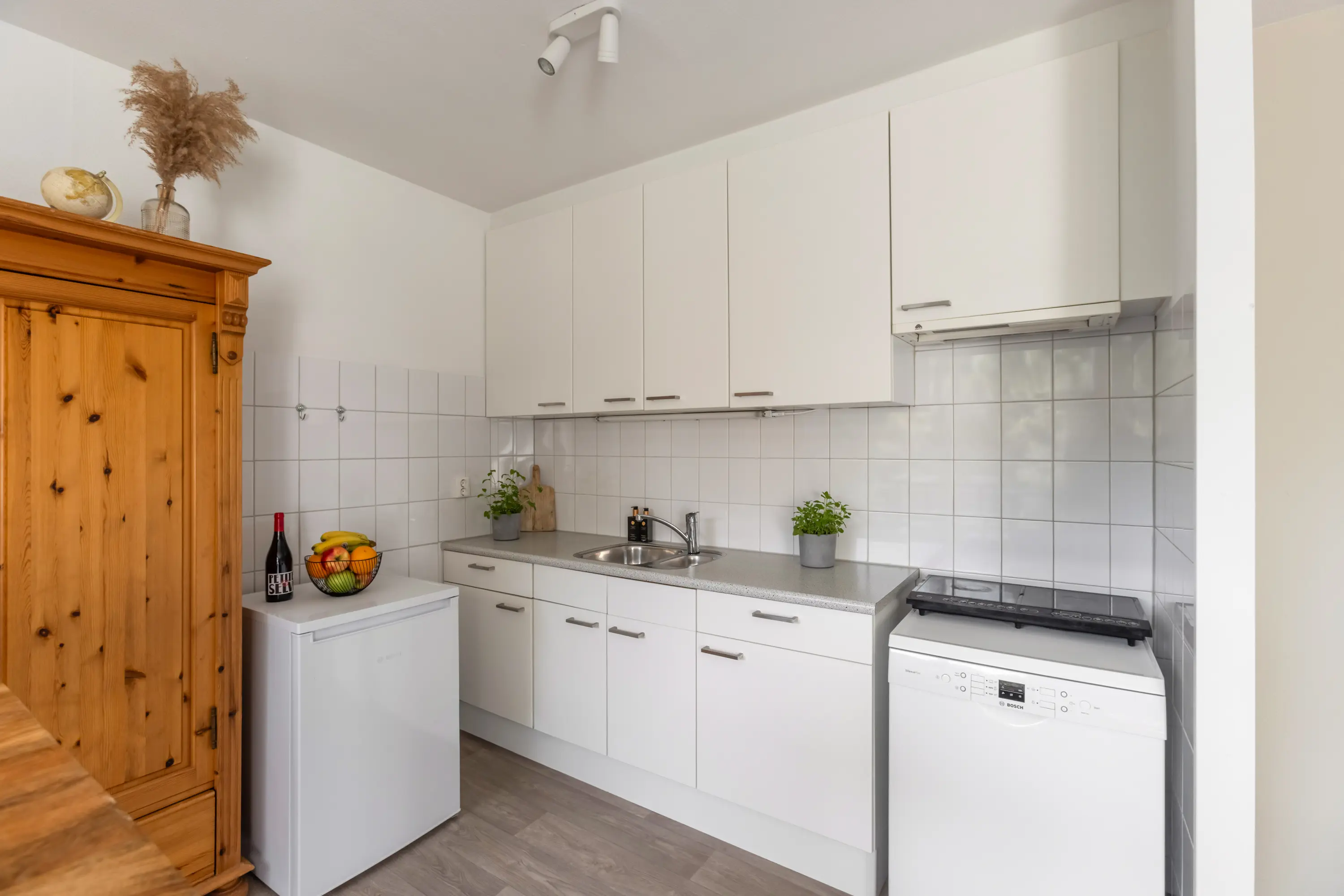 De keuken is uitgevoerd in een praktische wandopstelling.