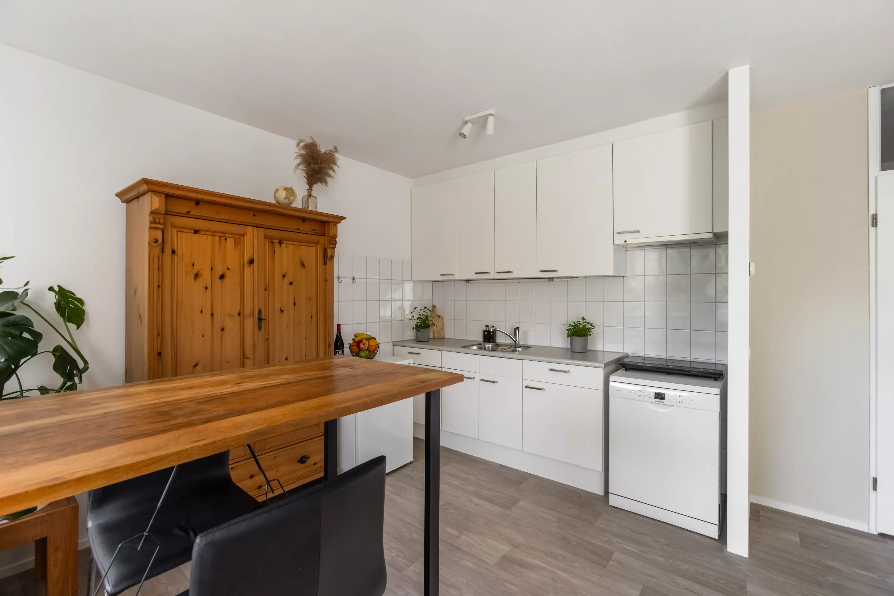 De keuken is praktisch ingedeeld in een wandopstelling en de twee slaapkamers liggen aan de rustige galerijzijde.