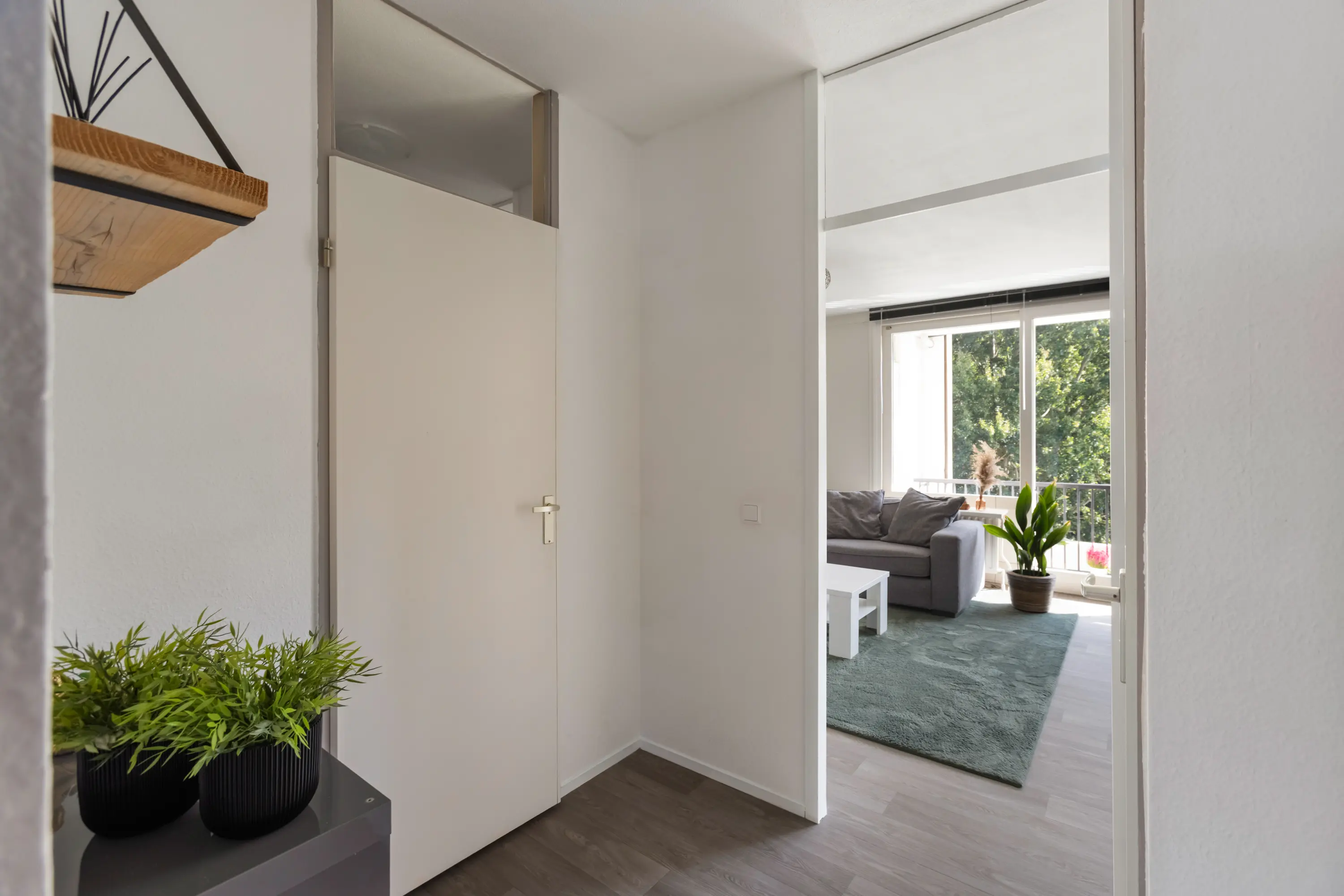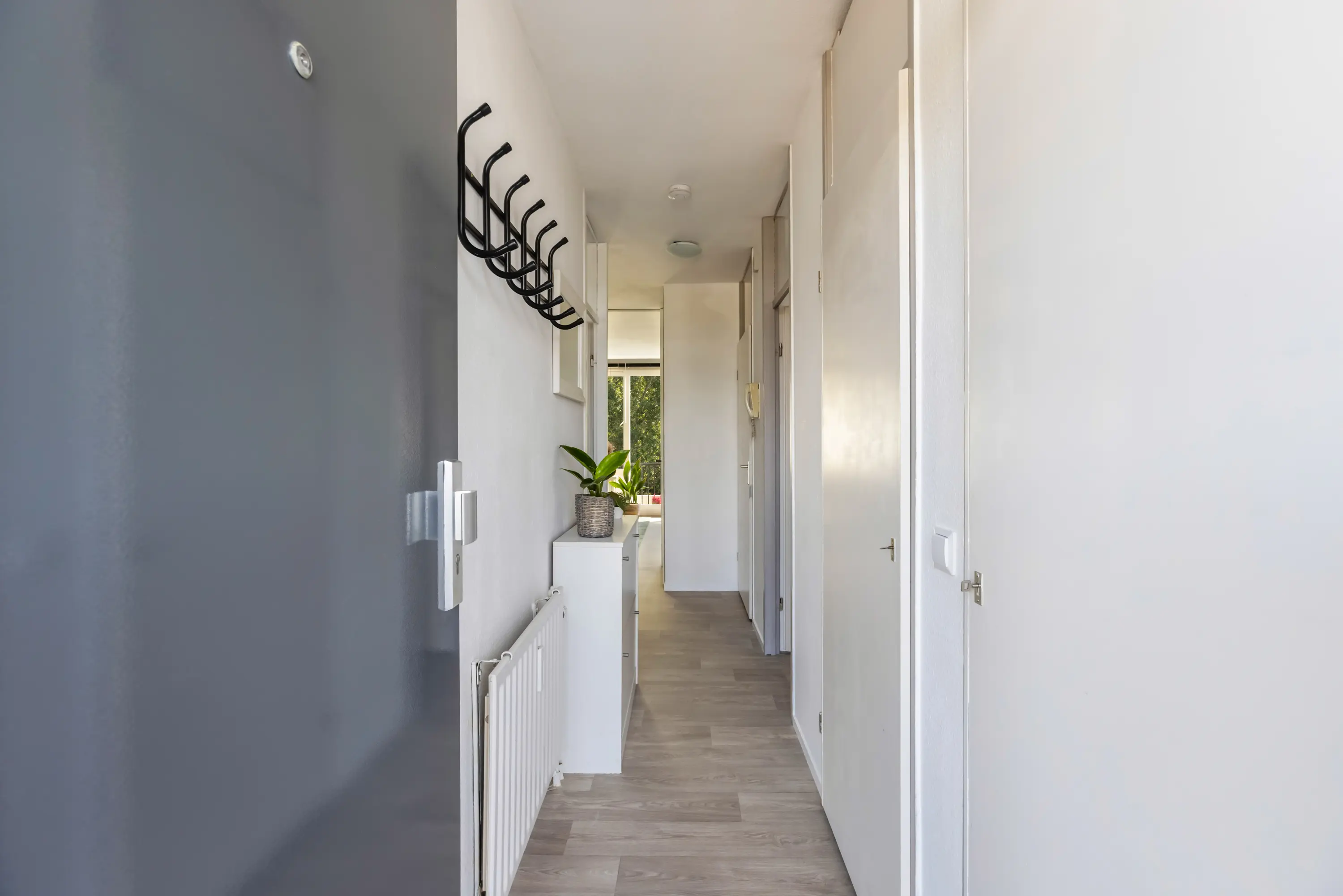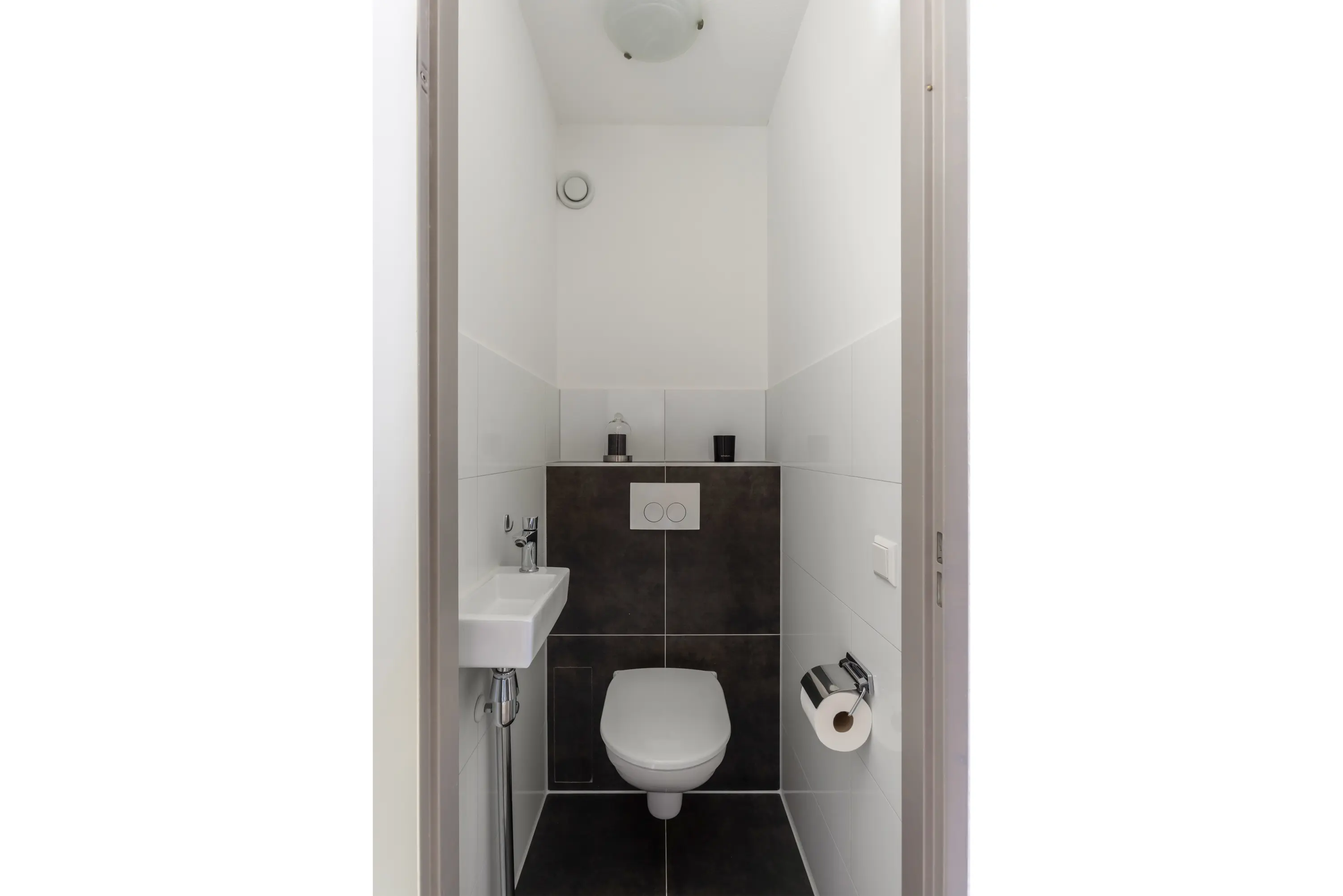 Bij binnenkomst in het appartement kom je in een hal met meterkast, een vaste kast, een inpandige berging en een toiletruimte voorzien van een hangend toilet en fonteintje.