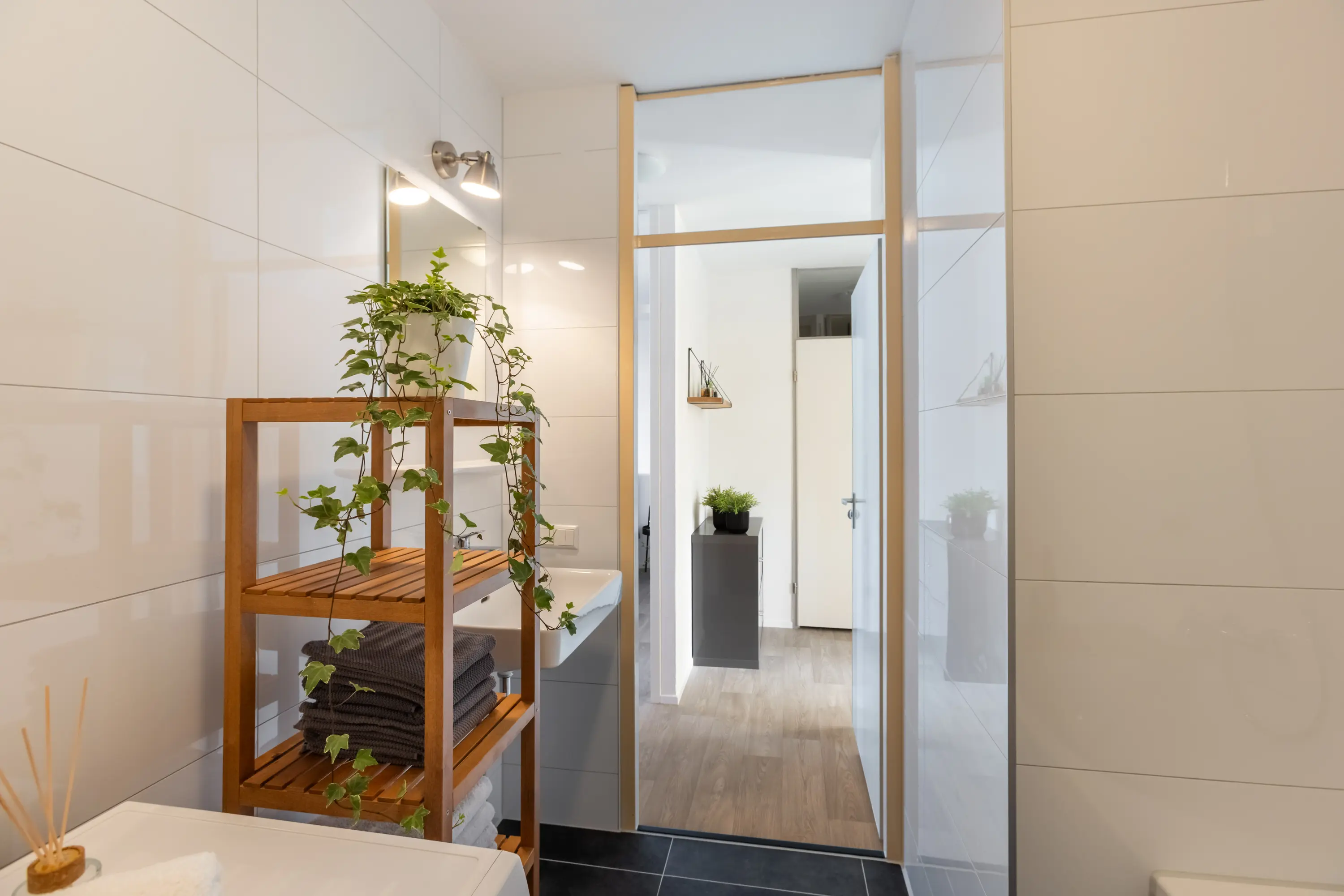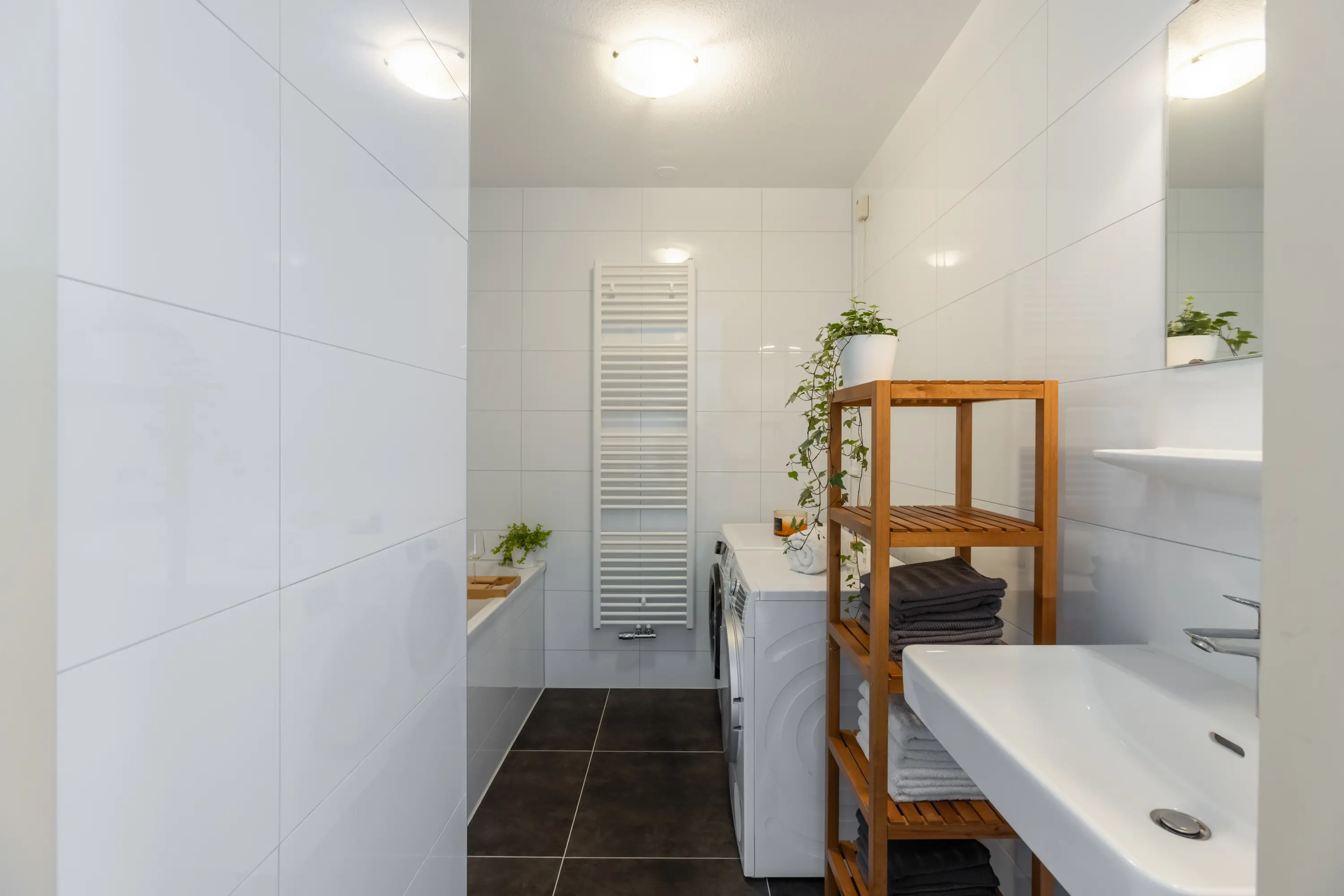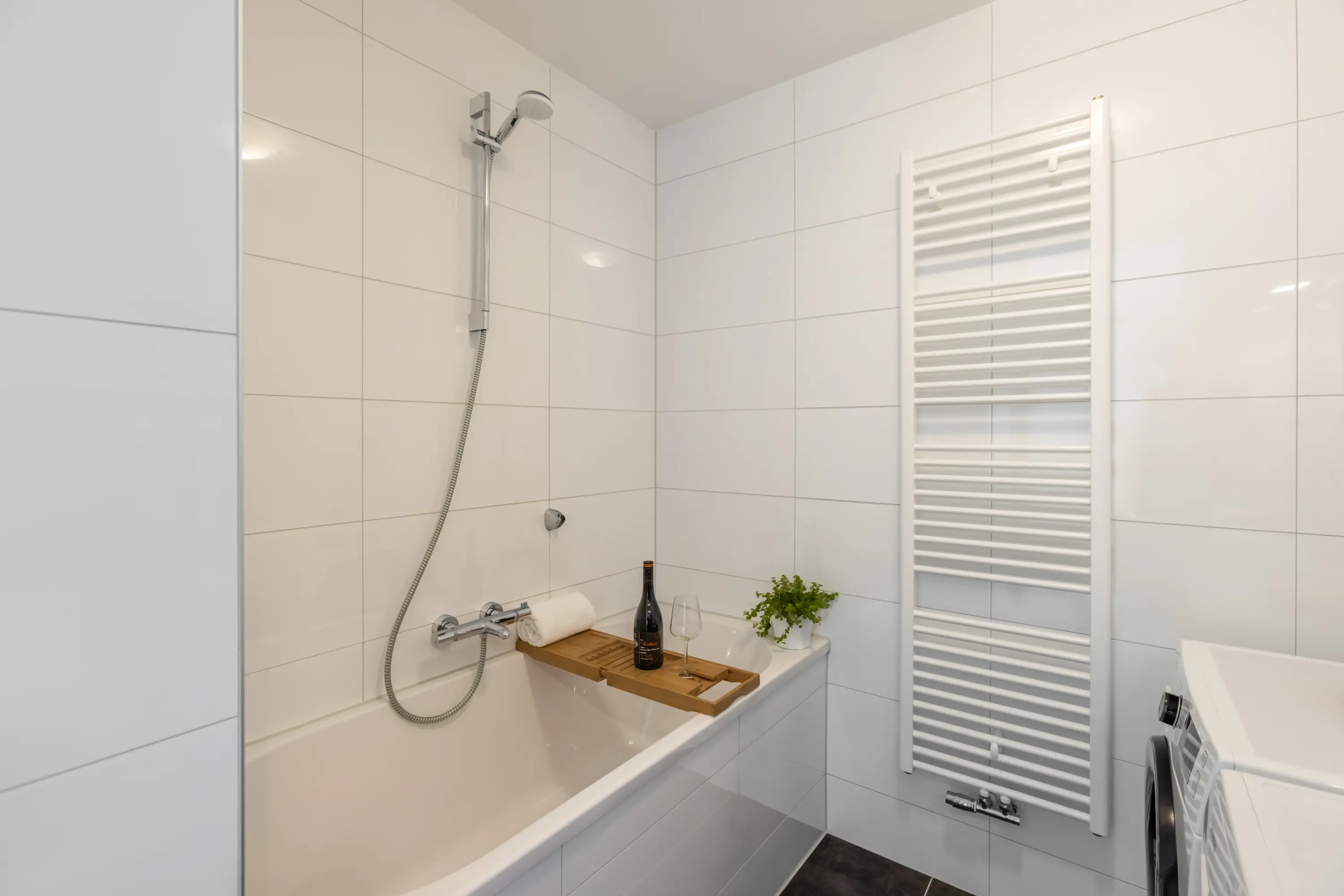 De badkamer is modern betegeld en uitgerust met een ligbad met douche, een wastafel en een aansluiting voor de wasmachine.