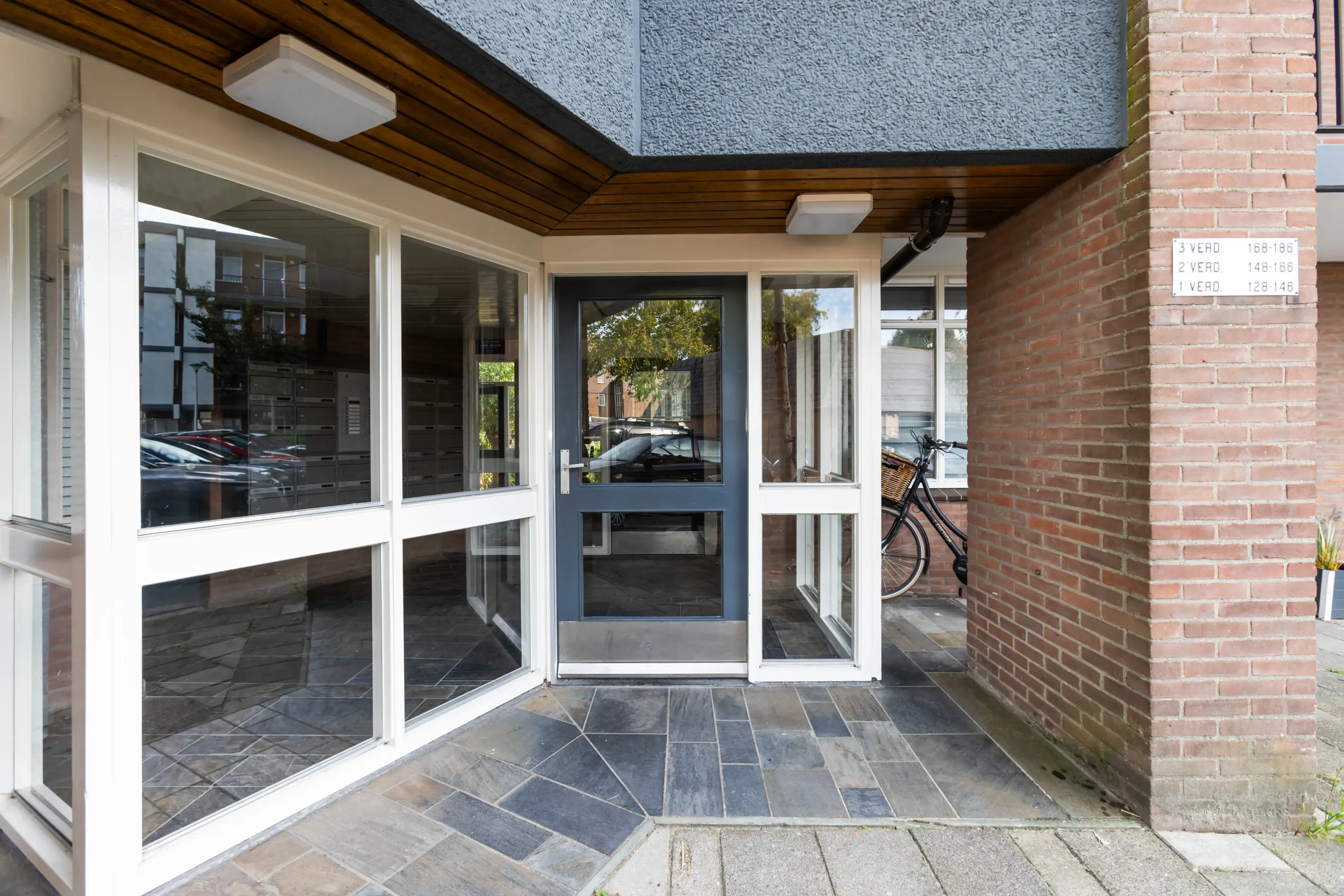 Afgesloten entree, bellentableau, brievenbussen, trappenhuis en toegang tot de lift.