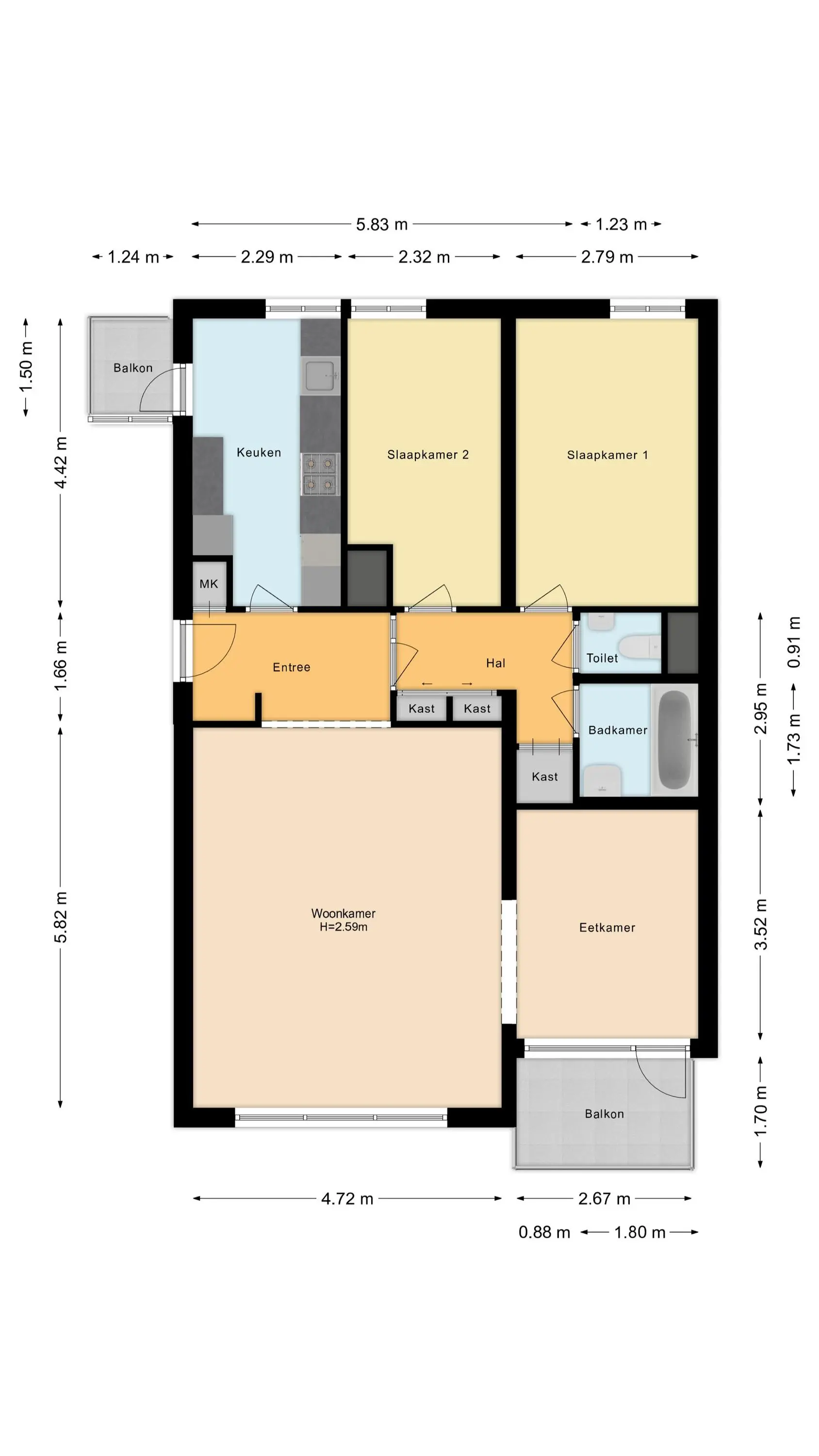 Bij binnenkomst valt meteen op hoe prettig het appartement is ingedeeld. De woonkamer vormt het hart van het huis, een lichte en uitnodigende ruimte waar je met een slimme update al snel een warme en eigentijdse sfeer creëert. Aansluitend vind je de keuken, klaar om te worden vernieuwd tot een moderne plek waar je graag kookt, borrelt en geniet.