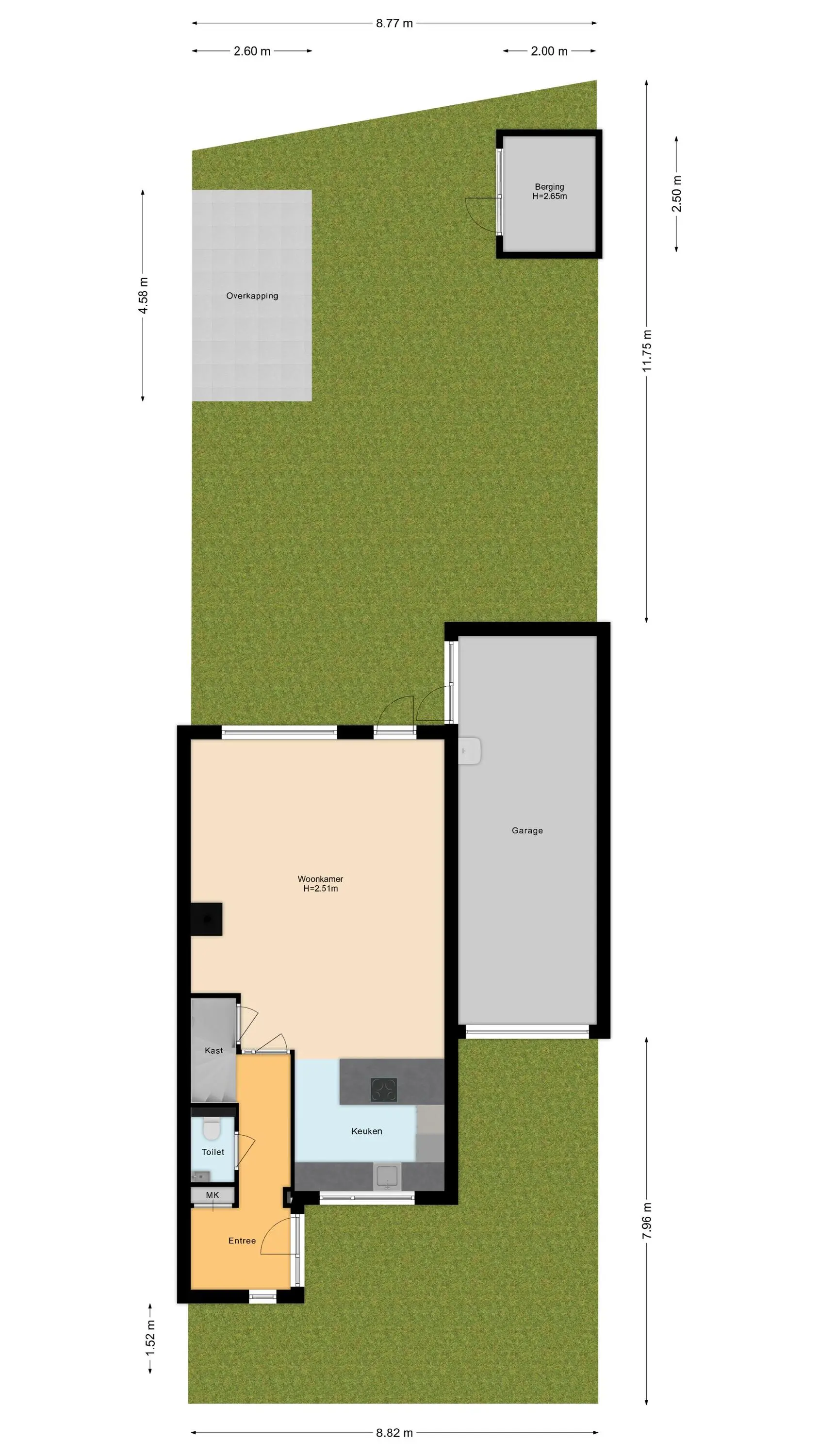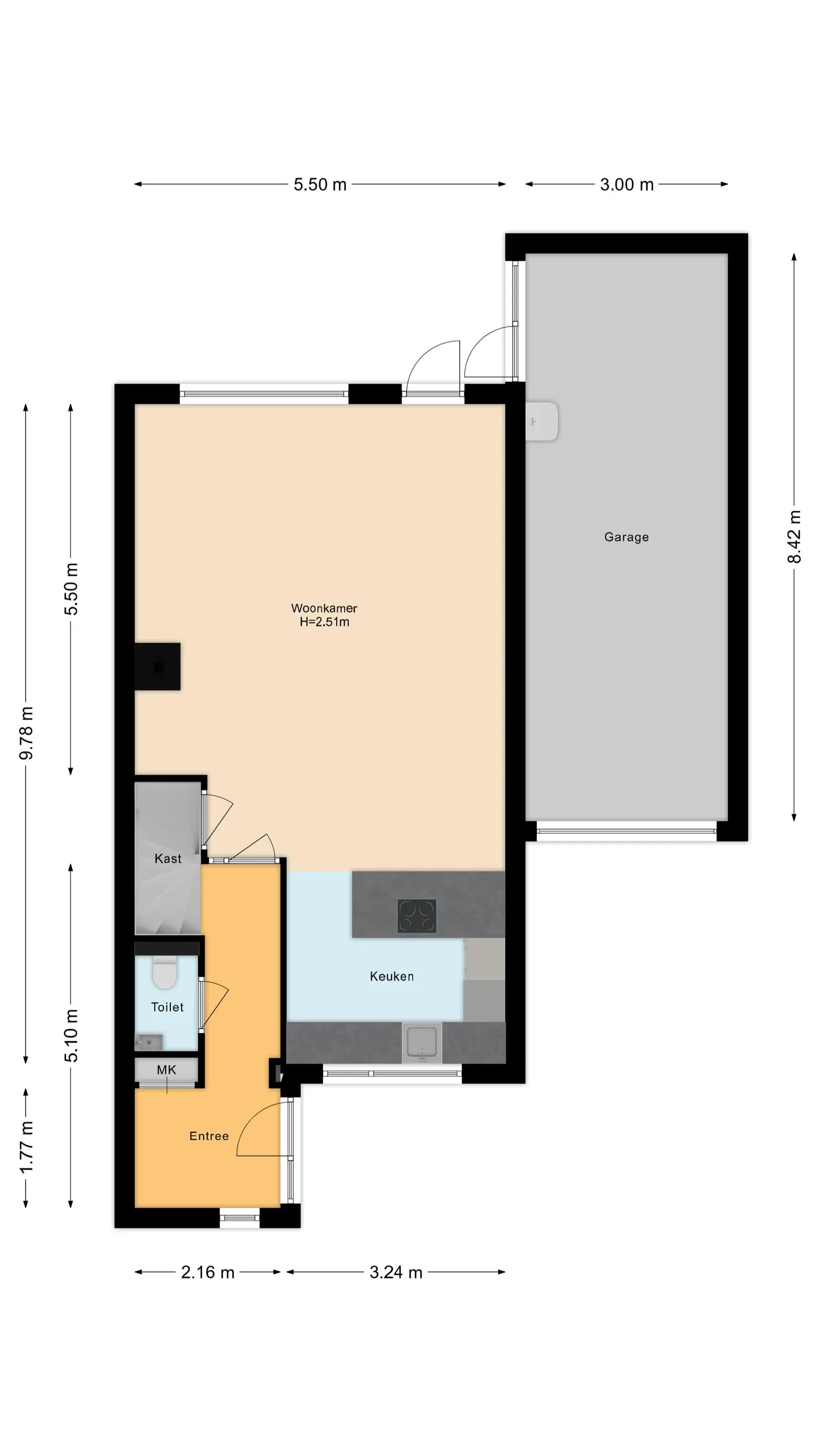De nette voortuin met sierbestrating geeft de woning een warme uitstraling. Op de oprit parkeer je met gemak je auto, direct voor de verlengde garage van 8,42 meter — een droom voor klussers, hobbyisten of iedereen die extra ruimte kan waarderen. De garage heeft elektra én warm/koud water.